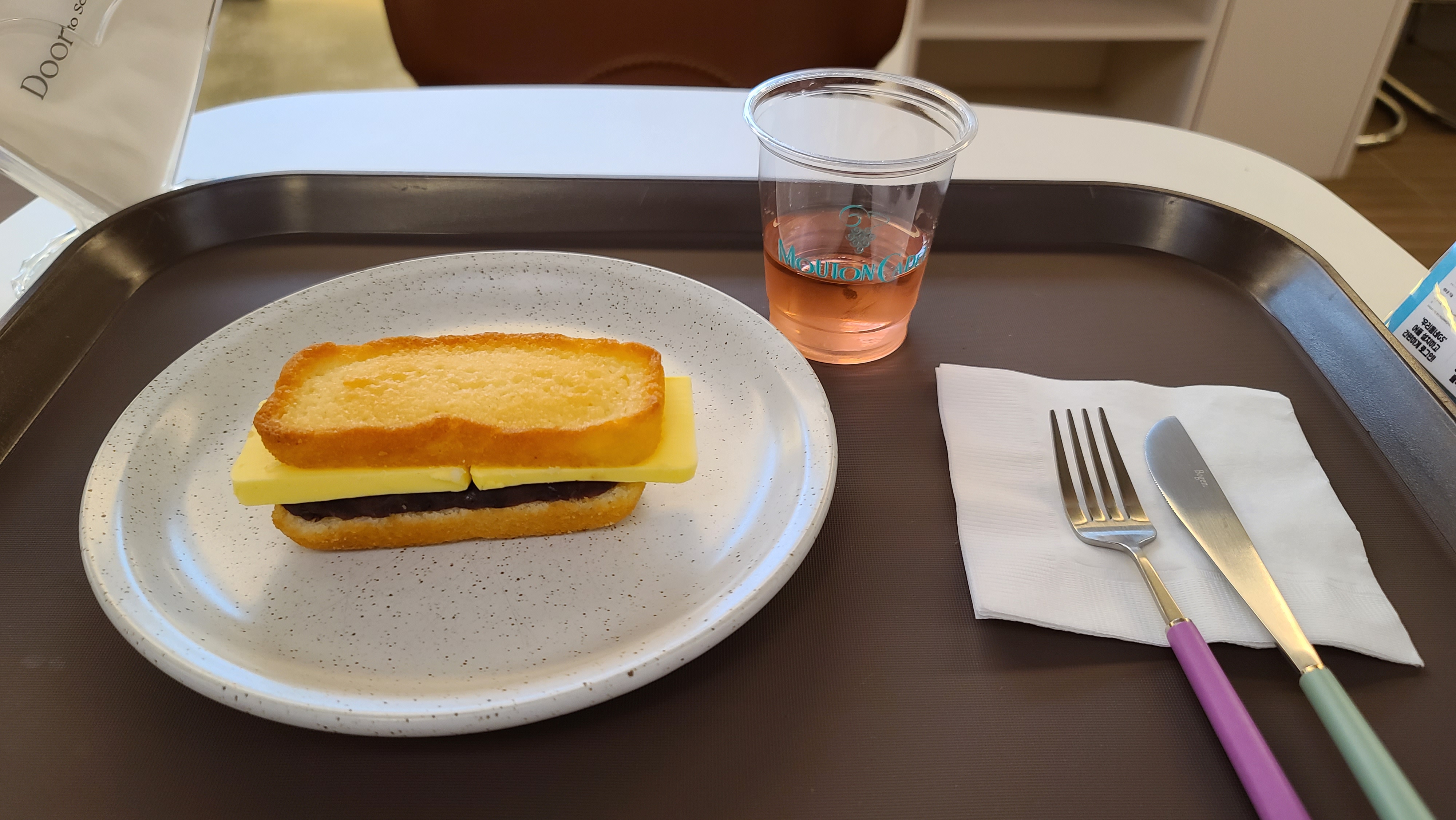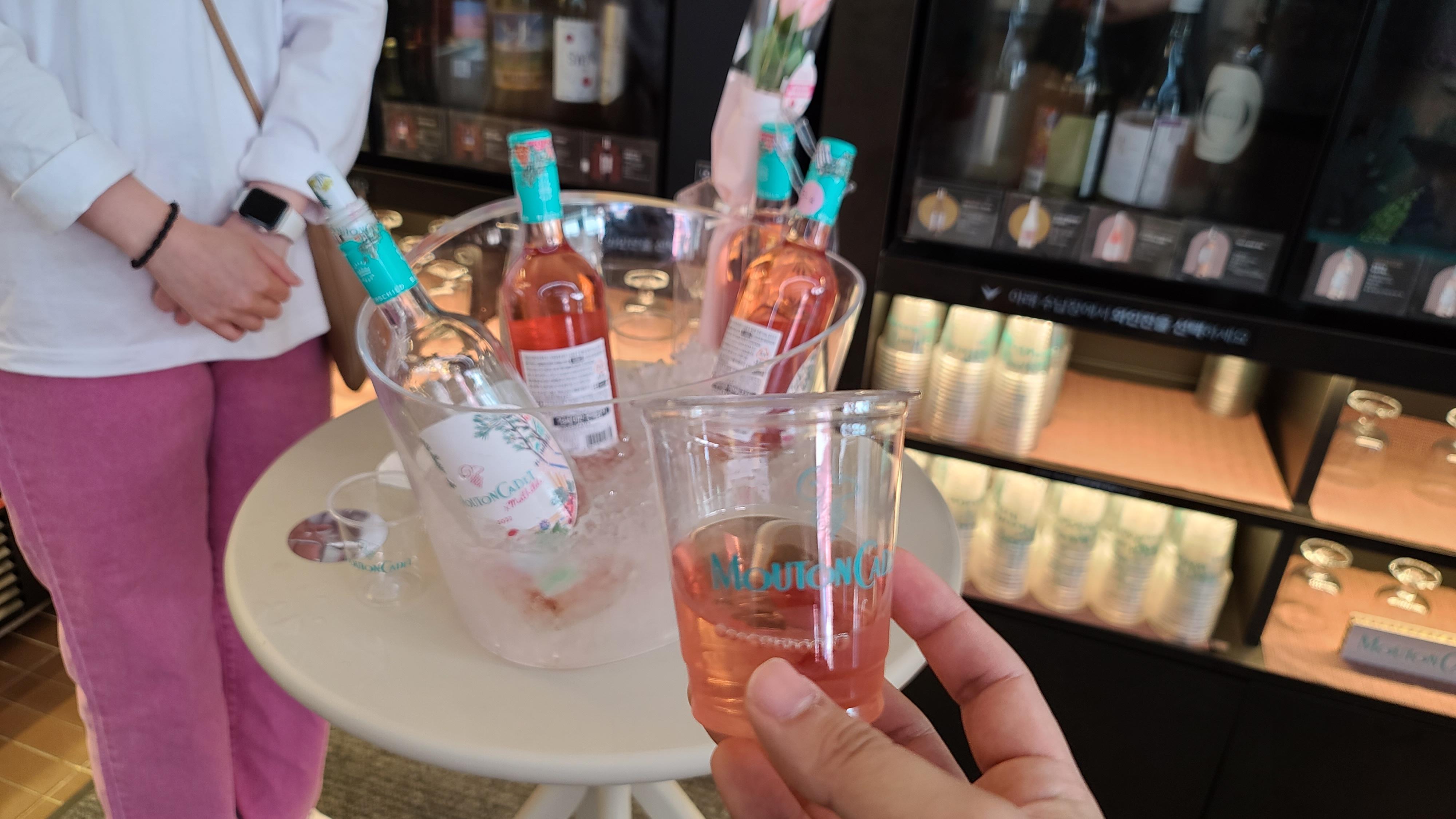 핑크색의 분위기가 너무 좋아서 사고 싶지만 와인의 맛을 모르고 살 수는 없는법 행사 직원분께 요청을 하니 흔쾌히 시음주를 제공해 주십니다. 시음주잔도 아무것도 쓰는게 아닌 MOUTON CADET 로고가 새겨진 플라스틱 잔에 담겨 있는 로제 와인이 참으로 잘 준비한 듯한 모습입니다.