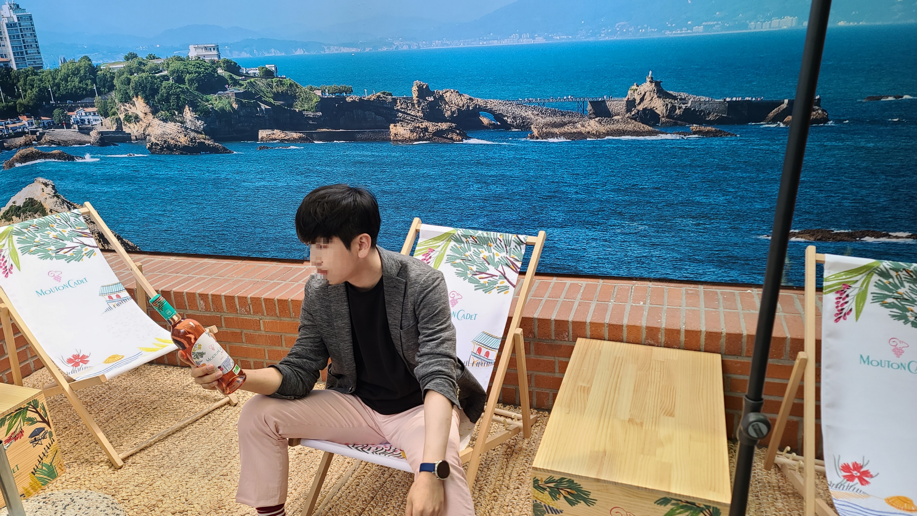 자세히 살펴보니 카페에서 뒤쪽으로 들어가면 야외에 지중해 바닷가를 꾸며놓은 포토존이 구성되어 있는 것을 보게 됩니다. 구매한 와인을 들고 바닷가를 배경으로 설정샷을 찍으니 한결로맨틱한 분위기가 살아나는 것을 볼 수 있으며 이번 여름에 바닷가에서 꼭 마셔봐야겠다는 즐거운 생각을 하면서 성수핫플 도어투성수에서 열린 무똥까데 팝업스토어 방문기를 마무리합니다.