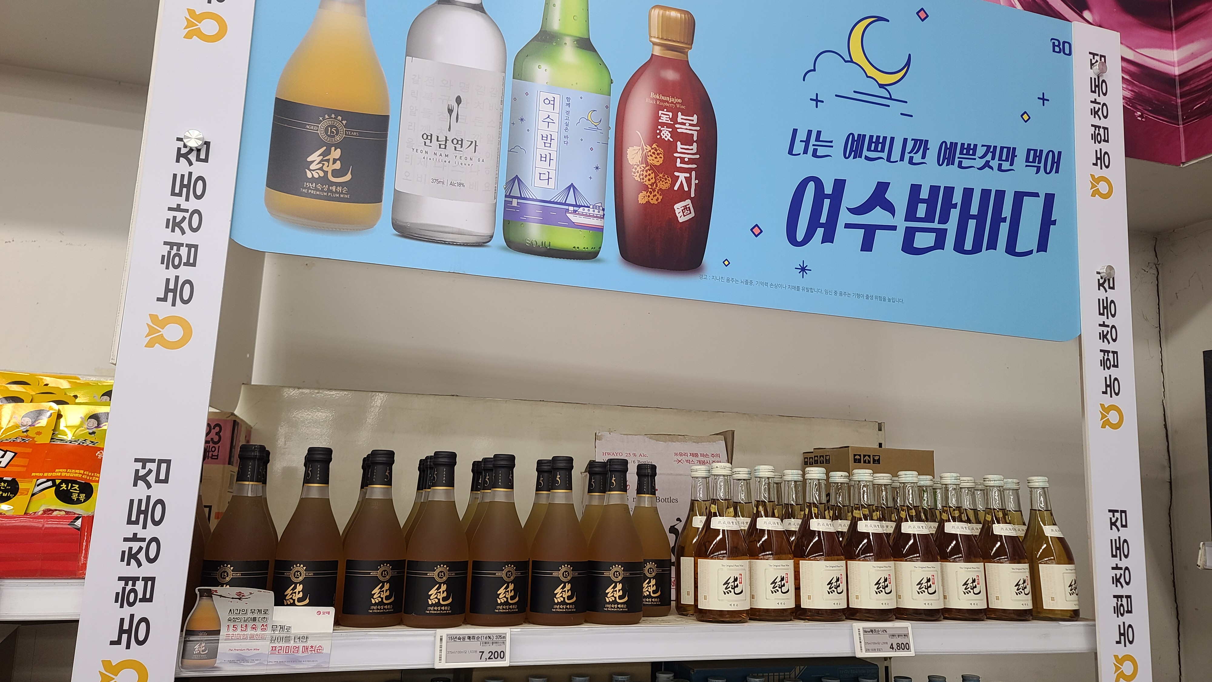 주류코너 진열대 가장 가까운쪽부터 살펴보니 농협이라는 토속적인 특색이 있어서이닞 전통주가 자리잡고 있는 모습입니다. 매취순, 연남연가, 여수밤바다, 보해 복분자 상품의 배너가 걸려있고 아래로는 해당 제품 및 한라산 등 여러 소주가 진열되어 있는 모습이 다른 주류매장이 위스키나 와인을 주력으로 입구에 진열하는 것과는 대조적인 모습입니다.
