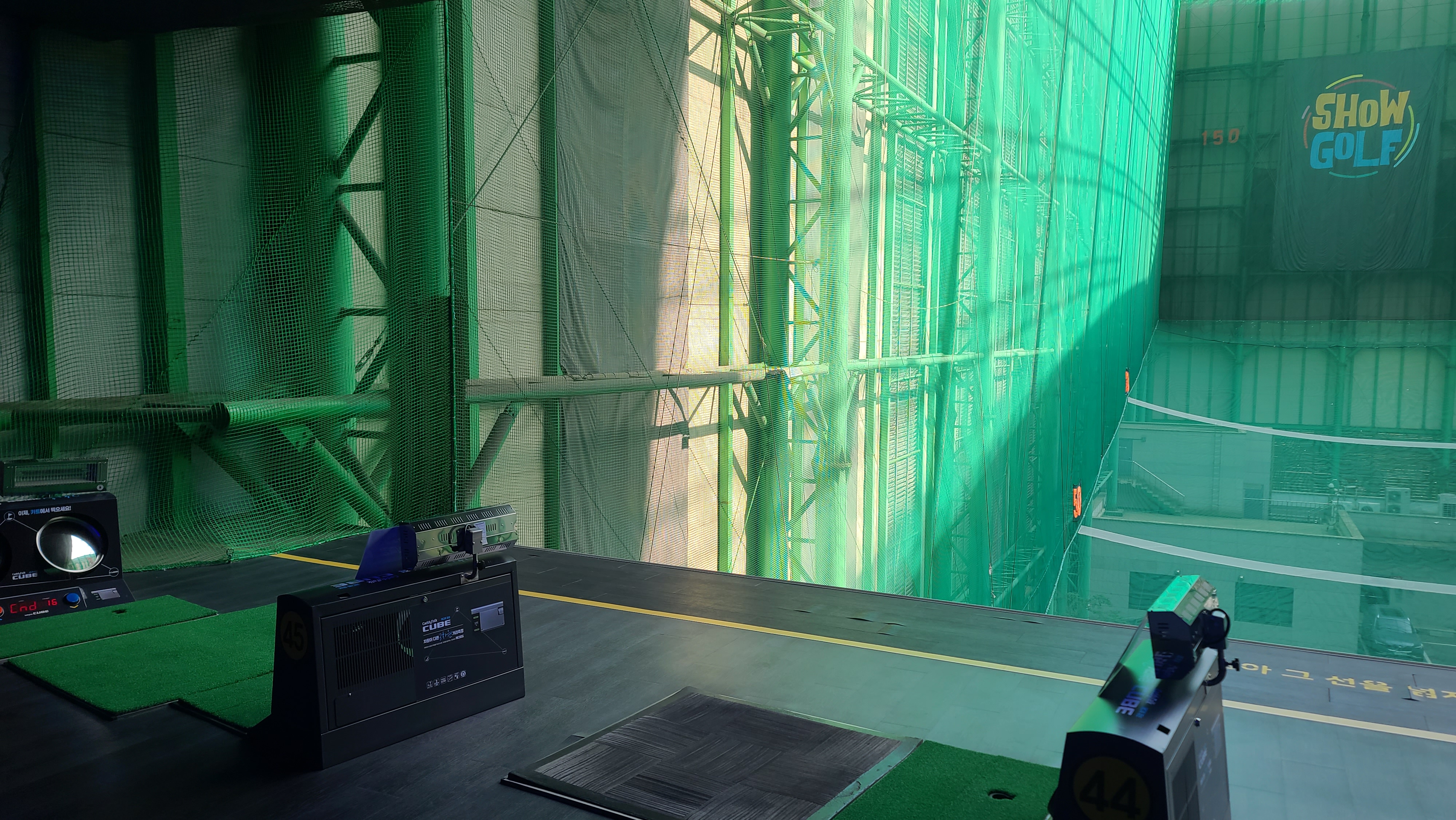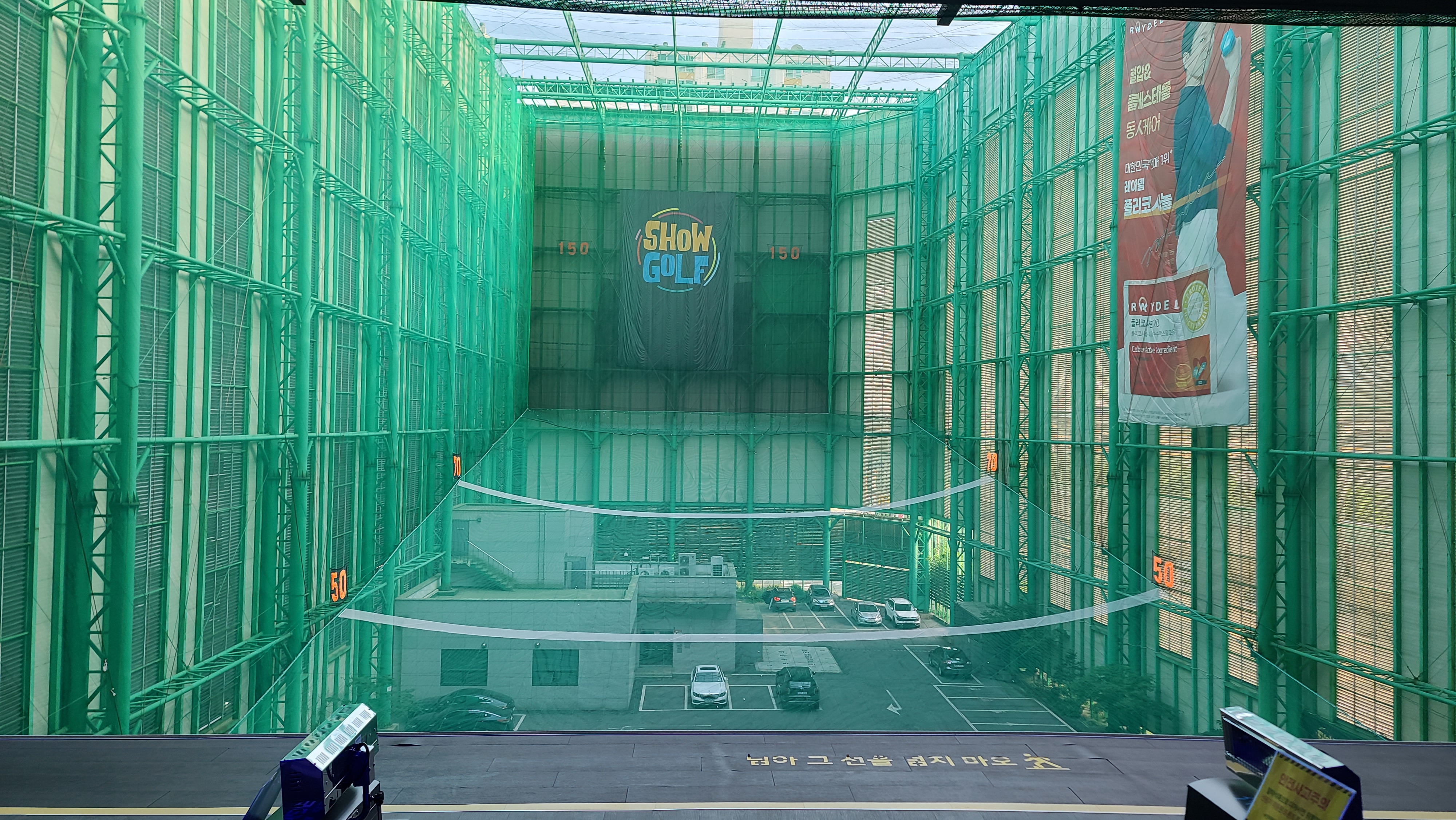 안내를 받아 연습장으로 올라가니 쇼골프 로고가 새겨진 인도어 연습장이 나타납니다. 구조를 살펴보니 천정부분을 제외한 사면이 막혀있어 답답한 느낌이 든다는 생각보다는 공이 매우 잘 보이겠다는 생각이 들게 됩니다. 야외 인도어 골프연습장의 경우 그물 사면이 뚫려 있는 경우 햇볕이나 배경 하늘색의 겹침현상으로 인해 시간에 따라 공이 잘 보이지 않는 현상이 발생하는데 쇼골프 도봉의 경우 그럴일은 없겠다는 생각이 들지만 전장을 살펴보니 상단에 150미터라고 적혀있는 것을 보니 드라이버 보단 아이언을 연습하는데 좋겠다는 생각을 하게 됩니다.