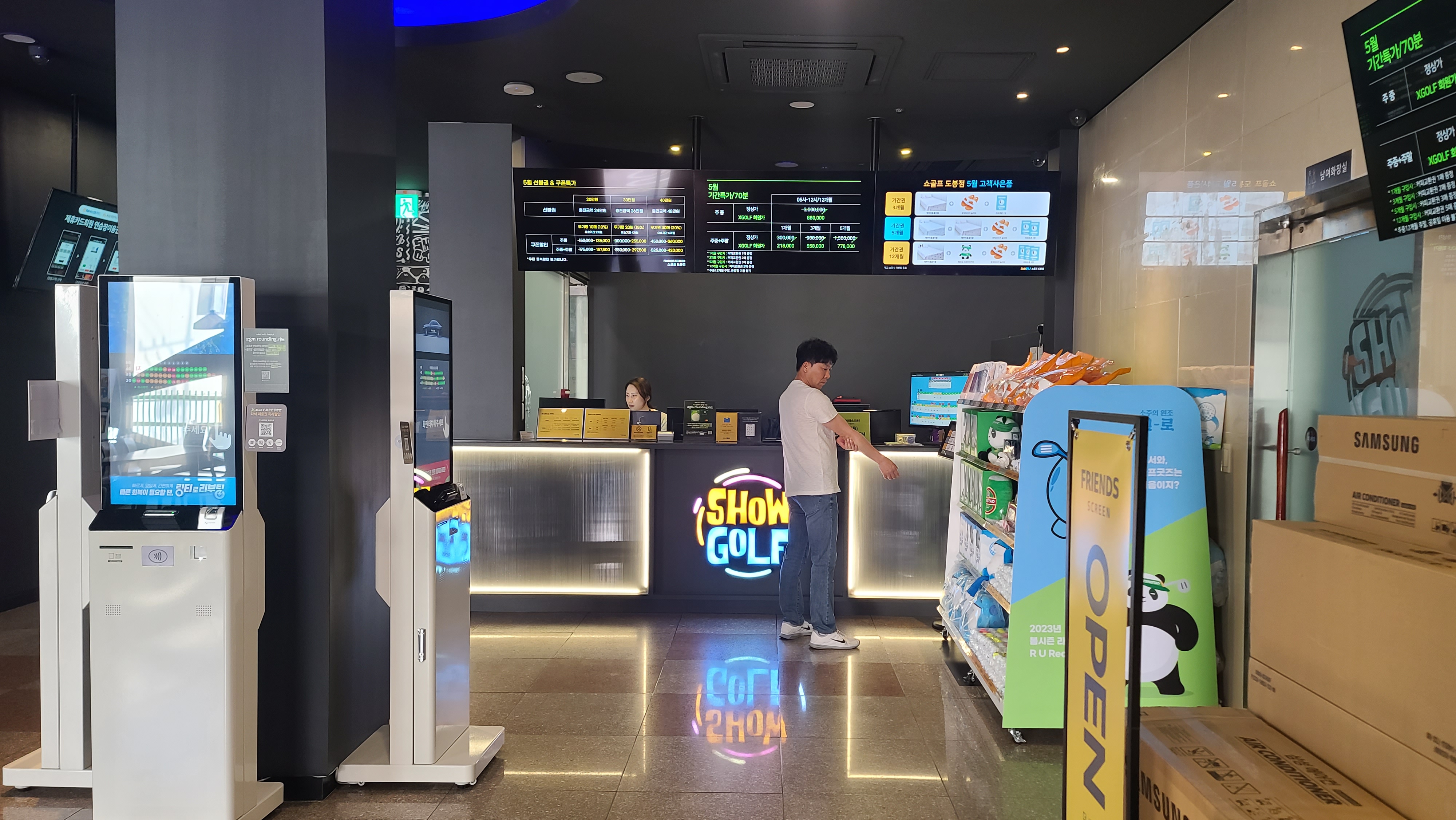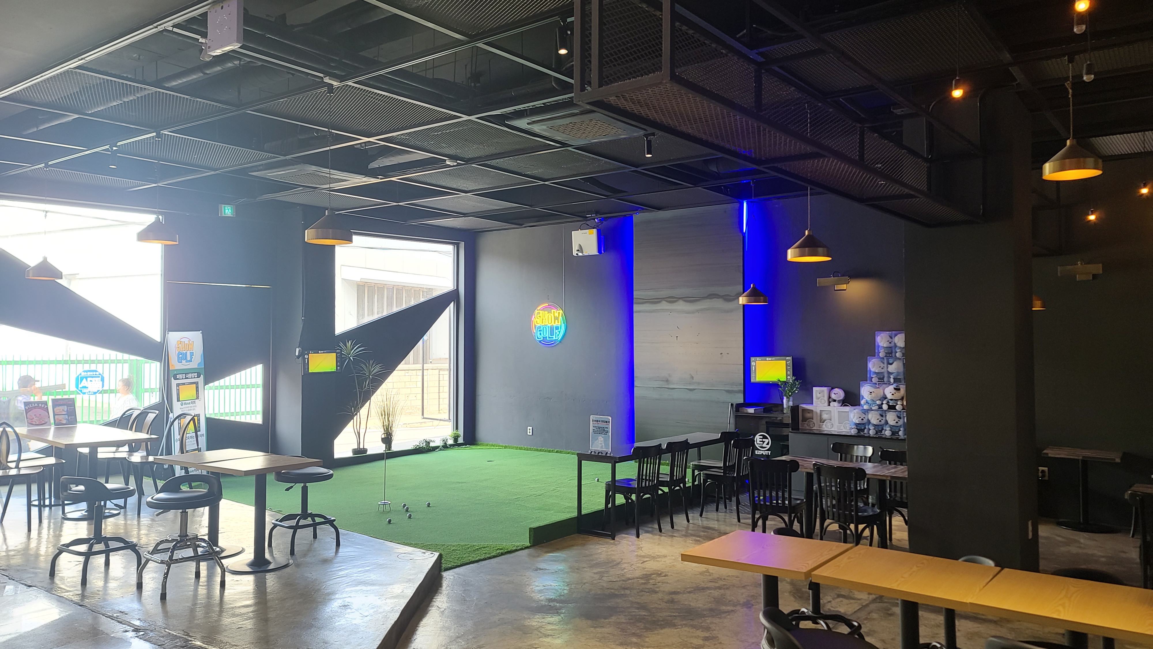입구에 들어가서 카운터를 살펴보니 SHOW GOLF 특유의 캐쥬얼한 분위기가 물씬 풍겨나오고 있으며 1층에 마련된 카페의 중앙에는 골프 퍼팅 연습을 할 수 있도록 세팅이 되어 있는 모습이 골프연습장 테마에 맞도록 참으로 잘 꾸며놓은 모습으로 보입니다.