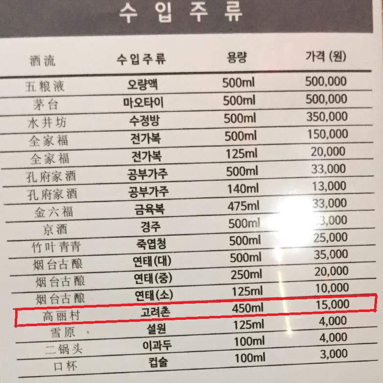 고려촌 백주의 프리미엄 라인업은 별이 많아질수록 고급 제품군에 속하며 더 오랜 숙성기간을 가져 잡맛을 없애고 깔끔한 맛과 향을 내는 것이 특징입니다. 국내에서는 조선족들이 경영하는 식당부근에서 어렵게 찾아보거나 혹은 남대문시장 등에서 발품을 팔아야 찾아볼 수 있는 희귀한 제품들이며 중국 여행시에 쉽게 볼 수 있는 로컬에서 많이 소비되는 이미지의 고량주인 것입니다.
