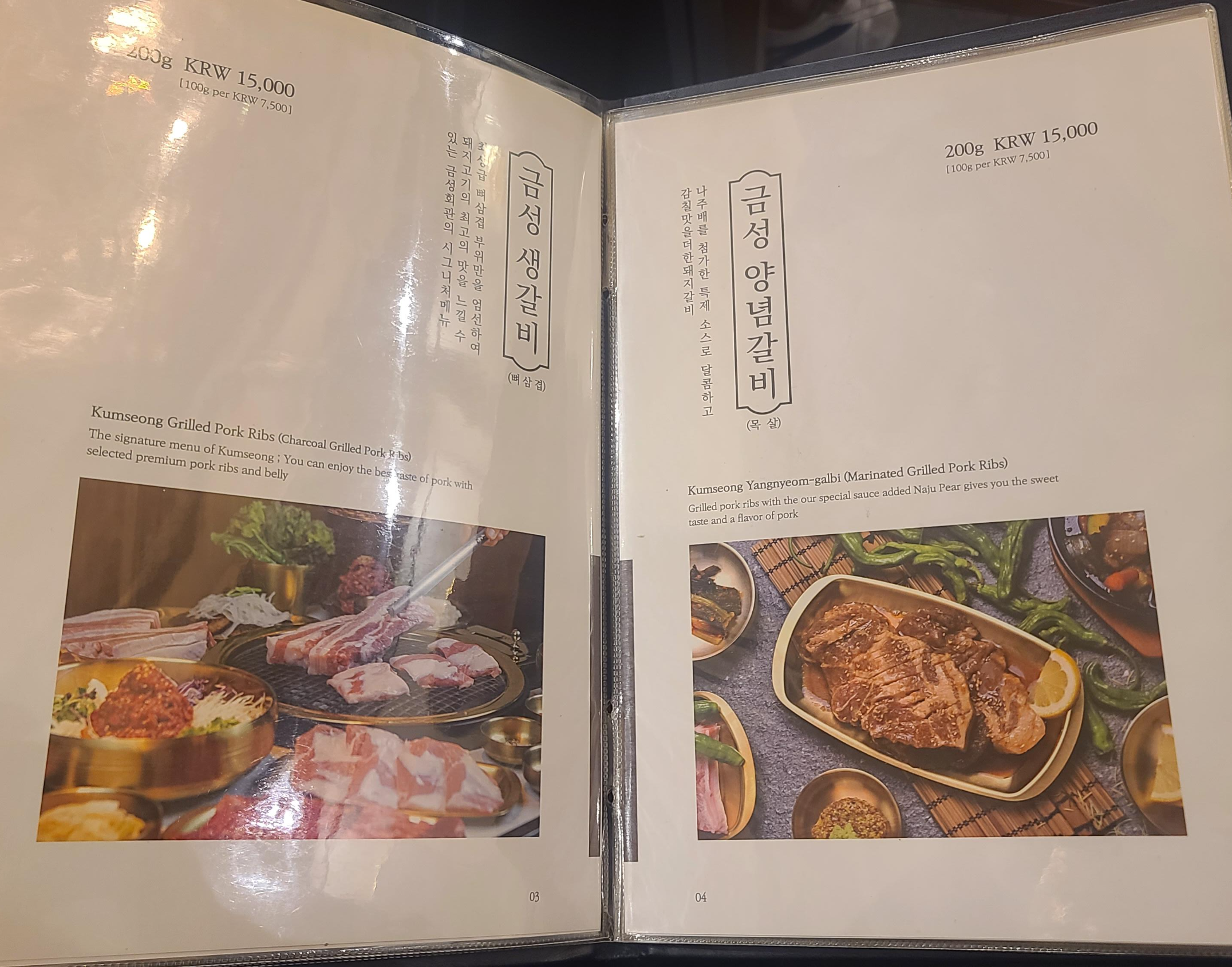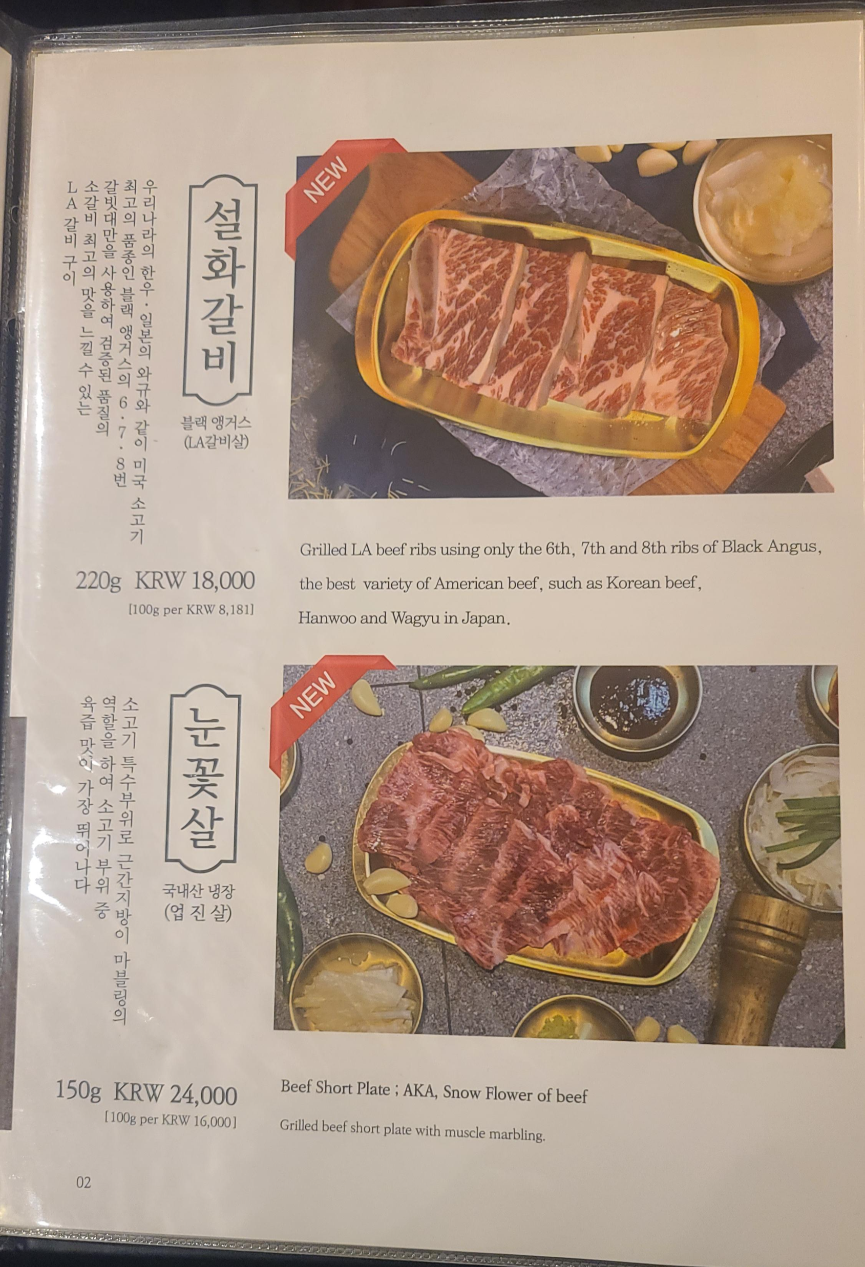 자리를 잡고 메뉴판을 살펴보니 설화갈비, 눈꽃살, 등꽃살, 생갈비, 양념갈비의 5가지 고기종류가 보입니다. 가격대는 돼지가 1인분에 15000원, 소가 24000원을 상당히 저렴한 것이 눈에 들어와서 인기가 있는 첫째 비결은 바로 가격이구나 하는 생각을 해보지만 소고기의 가격이 저렴한 경우 실망을 많이 하는 경험이 많아 도전보다는 가장 기본적인 돼지 생갈비로 주문을 하고 기다려봅니다.