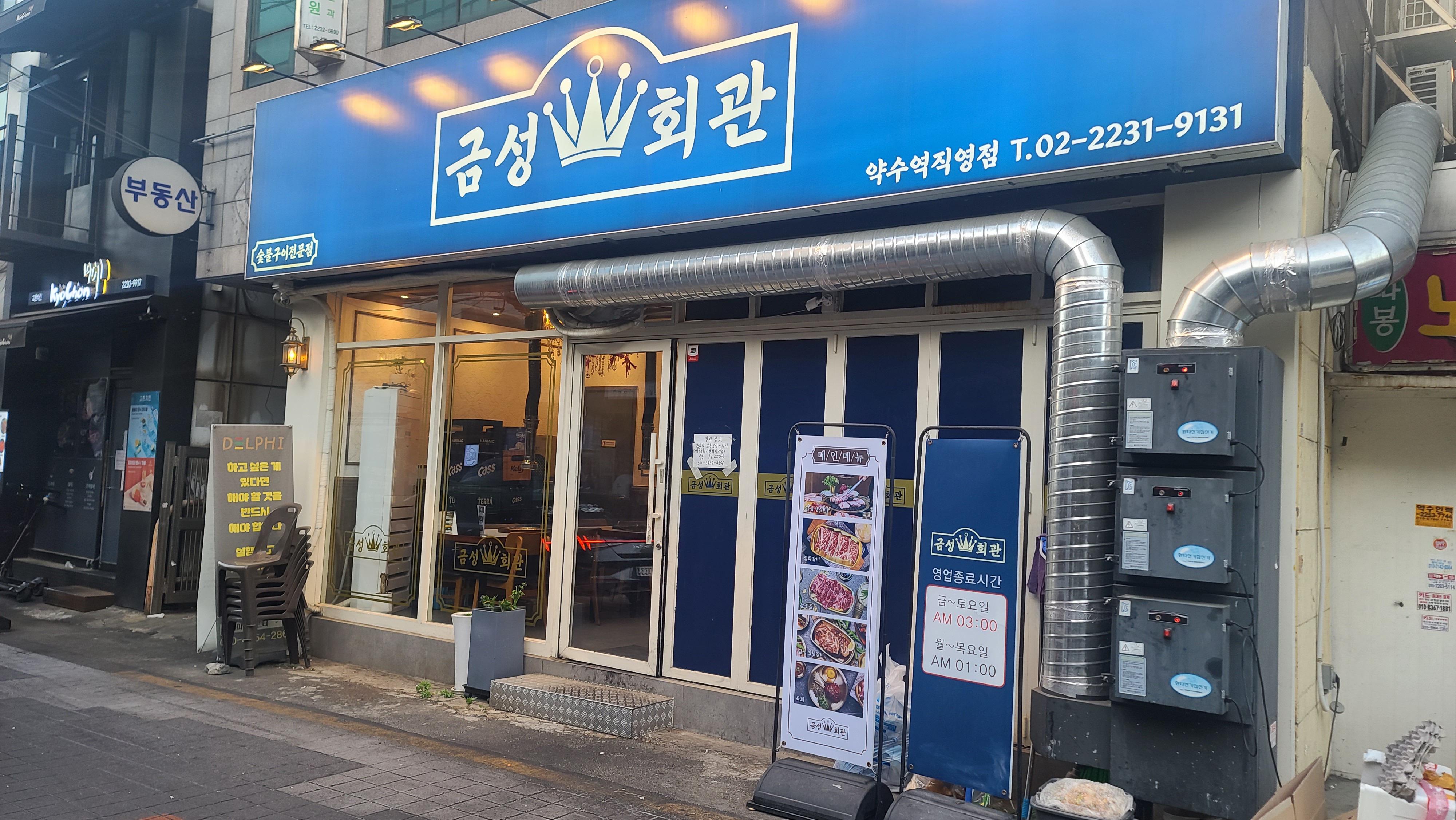약수역에서 자주 저녁약속을 잡는 필자는 맛집을 찾아서 약수시장부터 약수역 1번출구 먹자골목까지 이어지는 거의 모든집을 방문했지만 항상 웨이팅이 많아 들어가보지 못한 집들이 몇개 있는데 금성회관도 그중 하나인 가게였다. 근처 고깃집은 꼬기파파, 금돼지식당을 비롯하여 널리고 널려있는데 금성회관만이 유독 웨이팅이 많고 번창하는 이유가 늘상 궁금했으나 대체재가 많기에 궂이 웨이팅을 하지 않았으나 어느날 또 무엇을 먹을까 고민하며 거리를 둘러보던중 밖에서 보기에도 안에 사람이 없어서 오늘은 이곳이 왜 인기가 많은지 알아봐야겠다는 생각으로 입장을 하게 되었습니다.