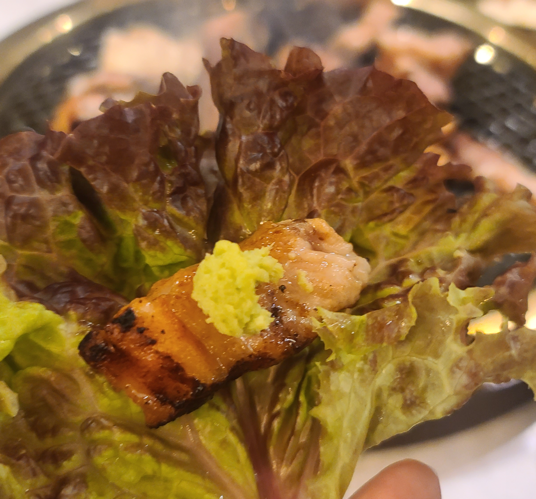 육회로 입맛을 살리고 잘익은 생갈비살을 그냥도 먹어보고 묵은지도 조합해보고 갈치속젓, 쌈장, 와사비, 갓김치 등 여러조합으로 맛을보면서 다각도로 고기맛을 경험해봅니다. 고기질이 좋고 숙성이 되서인지 감칠맛이 상당히 좋고 육즙이 흘러 넘치는 것을 느낄 수가 있습니다. 보통 뼈가 같이 나오는 돈마호크의 경우 뼈가 살에 직각형태로 박혀 있도록 가공을해 삼겹살외에도 하급의 고기 부위가 딸려오는 경우가 많은데 비해 금성회관의 생갈비는 뼈를 수평으로 넣어 가공하기 때문에 삼겹살의 부위 그대로의 맛과 육즙을 느낄수가 있습니다. 뼈에 붙은 고기도 맛을 보니 정말로 생갈비를 뜯는듯한 탄력과 농축된 고기맛을 보여주고 있어서 감탄을 하게 됩니다.