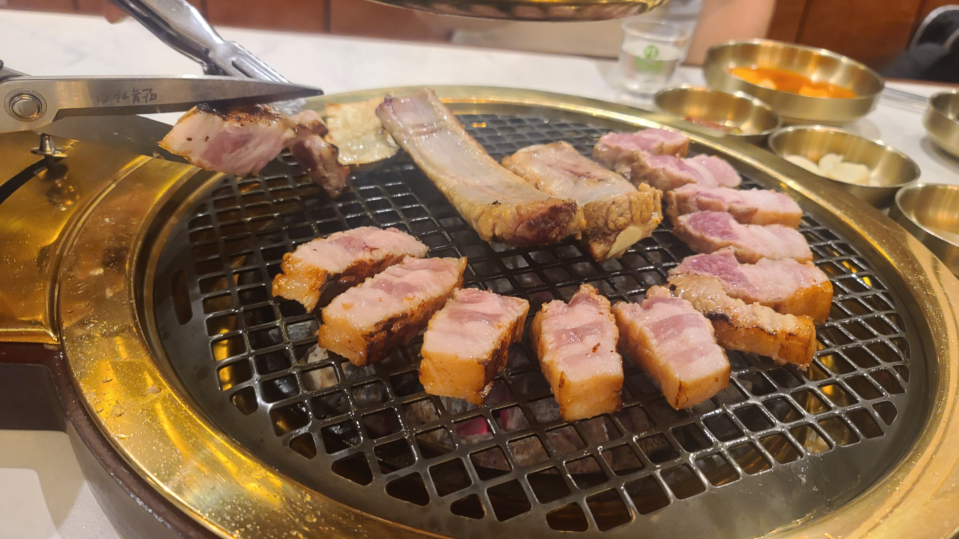 숯불이 세팅되고 잠시 기다리자 직원분께서 친절이 고기를 구워주시는 것을 볼 수가 있습니다. 가격에 이어서 고기를 구워주는 서비스까지 사람들이 많은 두번째 포인트를 알게되었습니다. 숯불에 고기를 구울때는 특히 타는것에 신경이 쓰여서 대화에 집중하지 못하는 경우가 있는데 손수 구워주시니 이야기에 집중을 할 수가 있고 먹는 흐름이 깨지지 않아 더욱 주문을 많이하게 되는구나 하고 느끼게 됩니다. 고기를 굽는 모습을 보니 겉면을 바짝익혀서 육즙을 가둔후 뼈부위를 잘라내 다시 통째로 굽는 숙련된 솜씨를 보게됩니다.