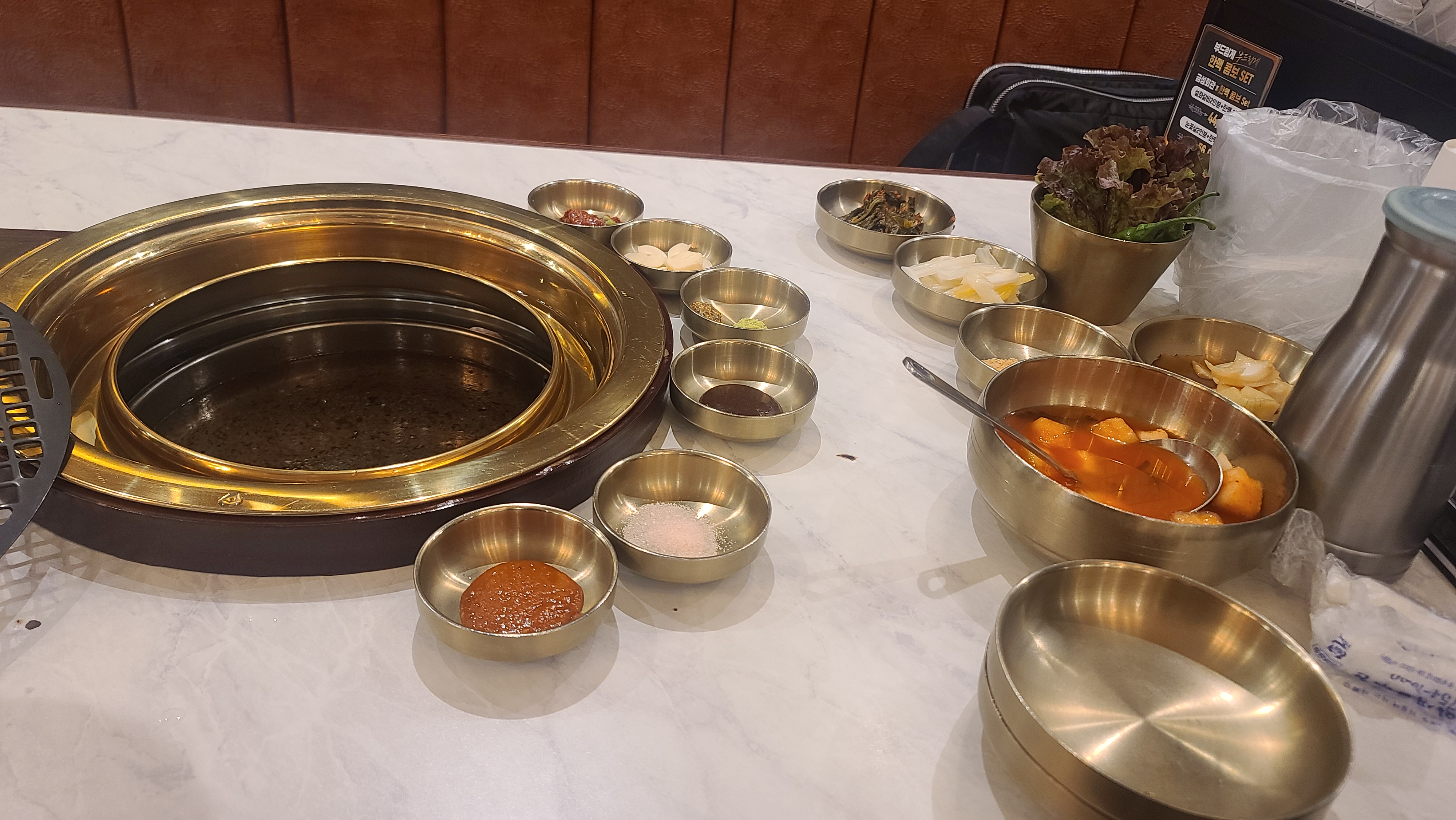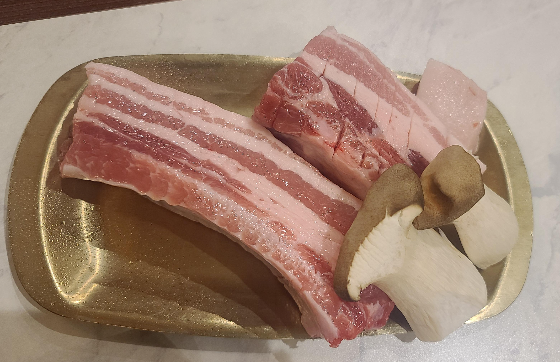 가게 로고와 네이밍에 대해서 잠시 생각해보는 도중 주문한 고기와 밑반찬이 세팅되었습니다.생갈비 생고기의 상태를 체크해보니 냉동이 아니라 선홍빛 고기의 색이 그대로 느껴지고 삼겹살 부위를 갈비뼈가 붙어있도록 가공하여 뜯는 재미를 선사하면서도 뼈의 중량으로 고기양은 줄일 수 있는 상당히 독창적인 고기 가공 기술을 보여주고 있습니다. 뼈가 붙어 있는 스테이크 토마호크에서 착안하여 갈비뼈가 붙어 있는 돈마호크 고기도 많이 맛보았지만 역시 양을 줄이겠다는 목적이 있는 호불호가 갈리는 가공법인며 양이 줄어들 경우 무엇보다 중요한 것은 바로 맛인데 과연 금성회관은 어떠한 맛을 보여줄지 고기를 보니 가장먼저 맛에 대한 생각이 들게 됩니다.