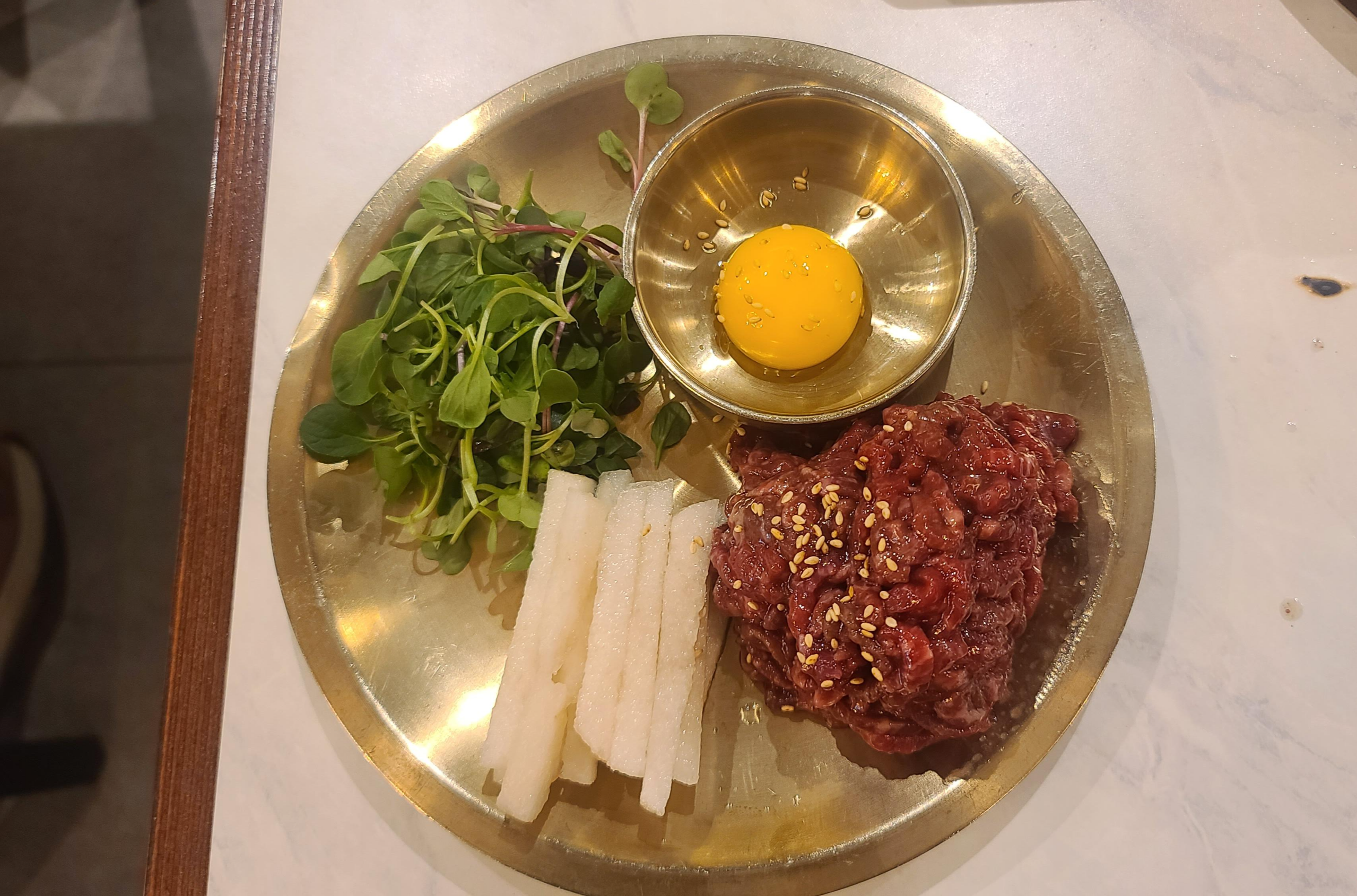 룰렛 행운 서비스로 받은 육회의 모습을 담아봅니다. 맛있게 양념된 생고기와 아삭한 배, 그리고 새싹채소, 계란 노른자까지 세팅되어 먹음직스러워보이는 육회의 비주얼이 저절로 침샘을 자극하여 식욕이 폭발하고 있습니다. 설레는 마음으로 아삭거리는 새싹, 배까지 곁들여서 한입 먹어보니 소고기집 육회보다는 떨어지지만 이자카야의 메뉴로 나오는 육회보다는 맛있는 느낌, 그래도 배가 고플때 식욕을 돋구는 훌륭한 에피타이저의 역할을 하는데는 아무런 지장이 없는 정도라 육회를 안주삼아 고기가 익는동안 술한잔을 기분 좋게 기울여봅니다.