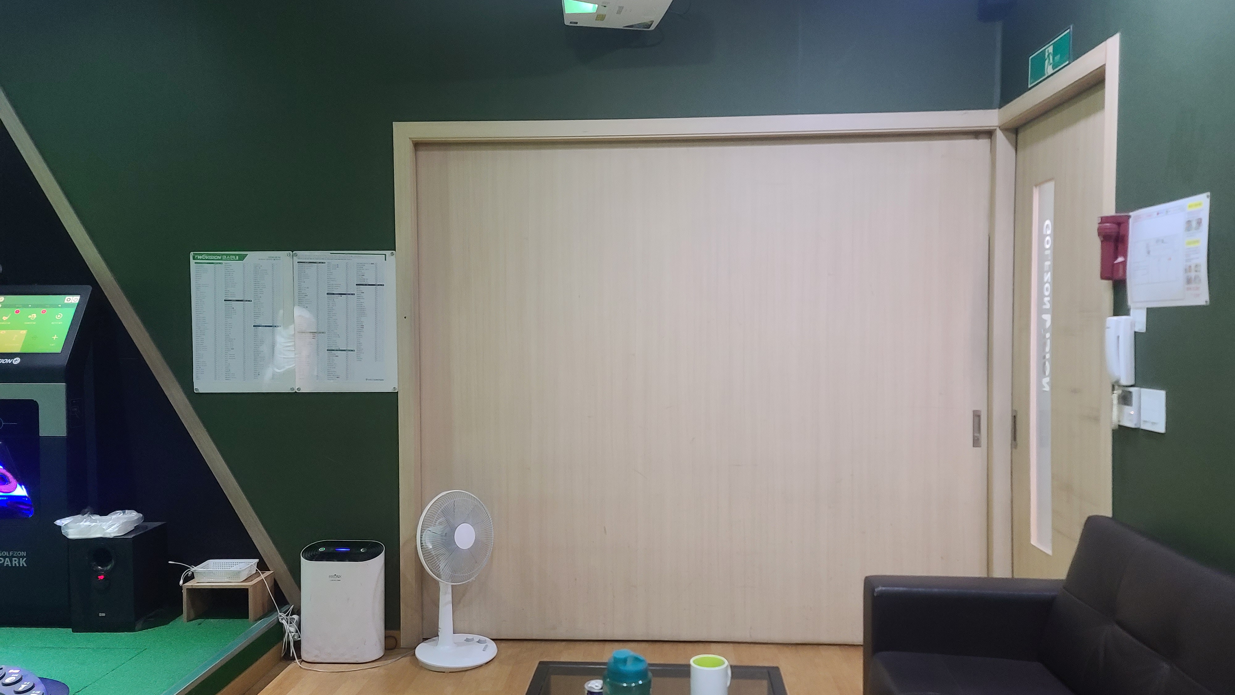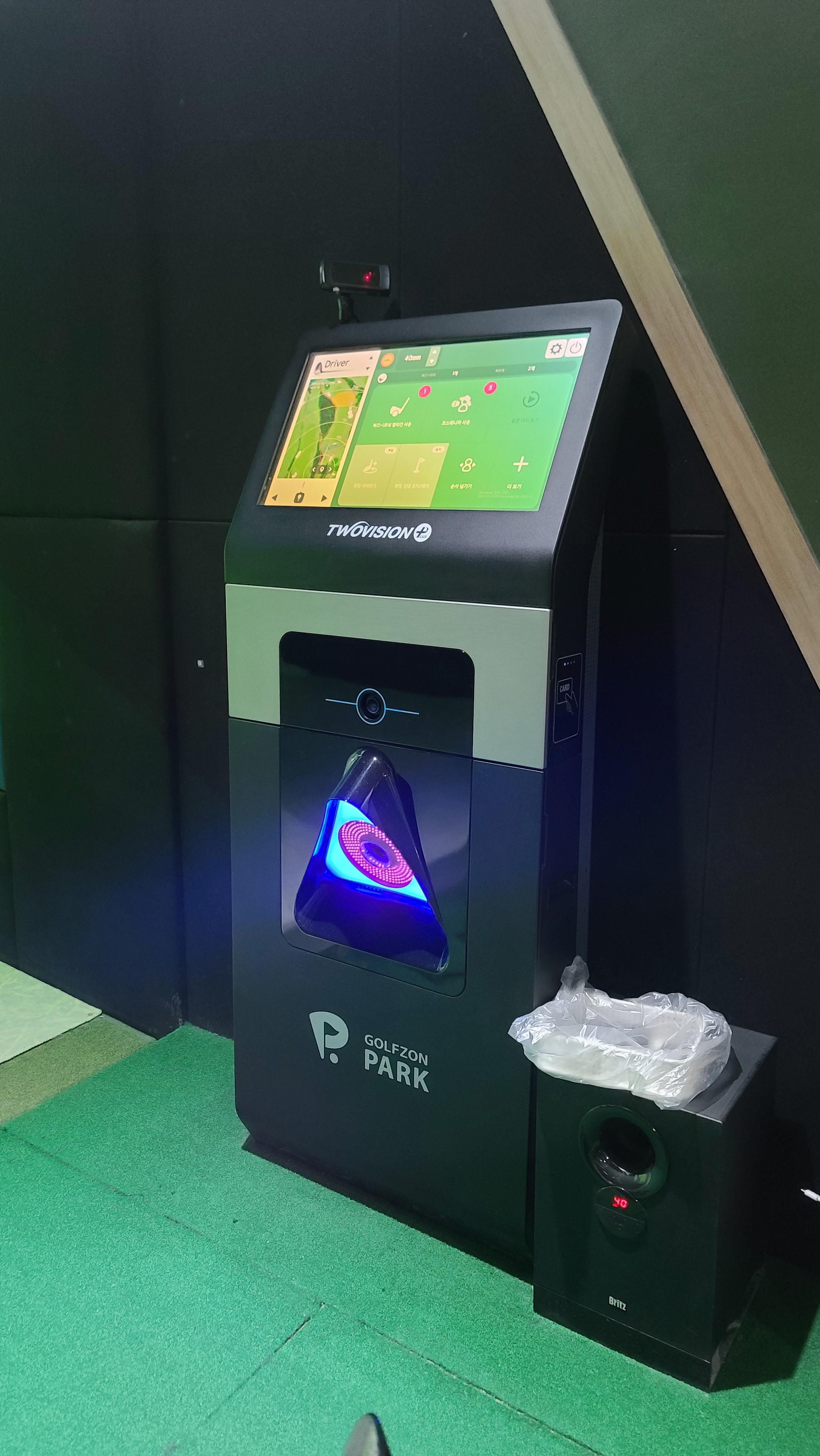 방에 들어가서 시설을 살펴봅니다. 골프존 투비전 플러스 최신 시스템이 깔려있어 바닥은 이중 플레이트로 독립적으로 움직이는 구조이며 센서는 천장과 키오스트와 같이 생긴 컴퓨터에 일체형으로 달려있는 모습을 보게 됩니다. 가볍게 연습과 플레이를 하면서 센서의 감도와 반응 정도를 살펴보니 바꾼지가 얼마되지 않아서인지 매우 좋은 응답속도 및 컨디션을 보여주고 있습니다.