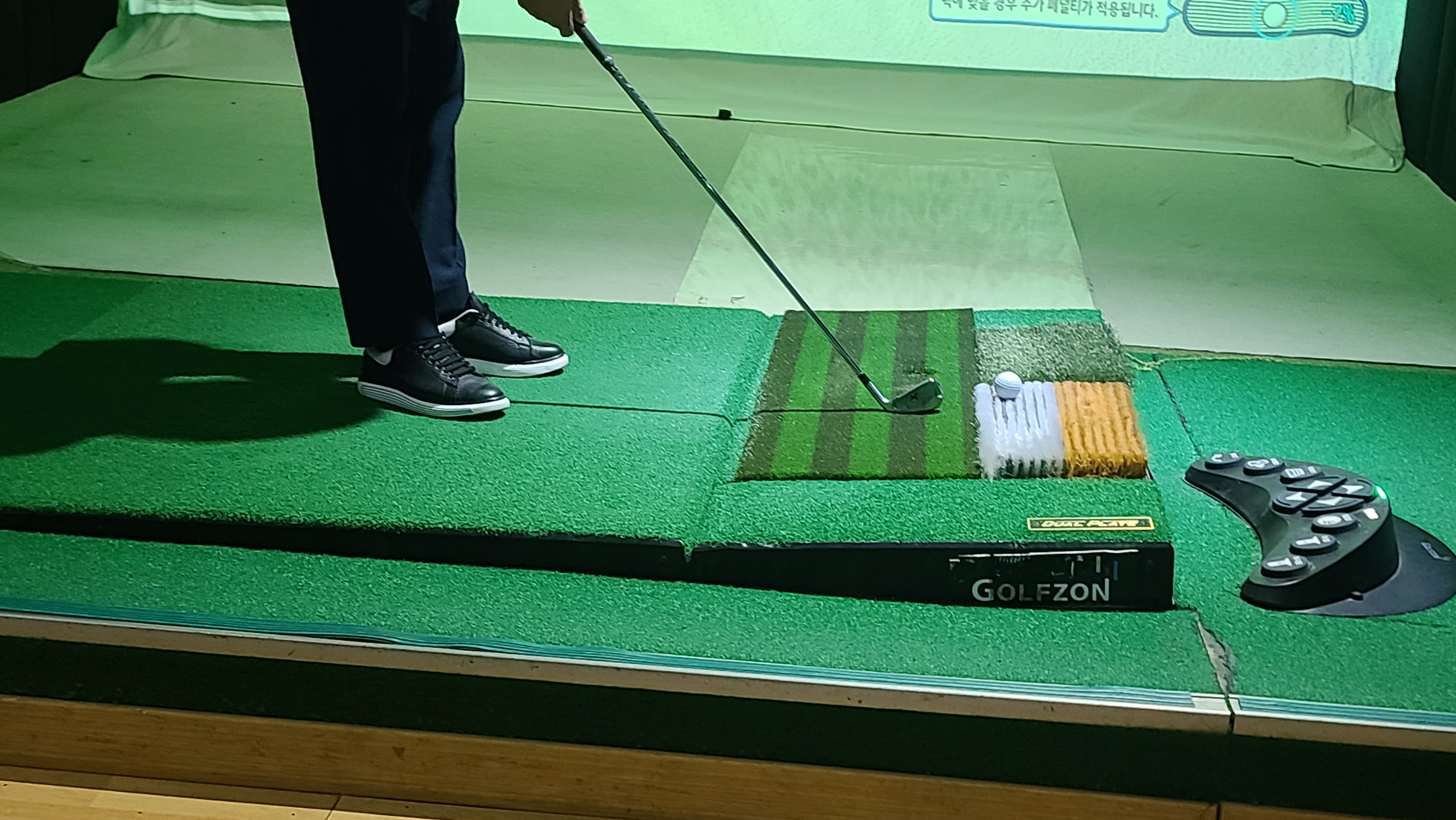집중해서 비즈니스 골프를 하면서 매트를 보니 페어웨이나 그린 상태에 따라 이중바닥이 미세하게 라이를 조절하는 것을 볼 수 있습니다. 스크린 골프와 필드의 가장 큰 차이인 언듈레이션과 라이를 비교적 비슷하게 구현해내주는 점이 투비전 플러스 시스템의 가장 큰 장점이며 특히 세컨샷과 숏게임에 영향을 크게 주기 때문에 필드에서 잘치고 싶다면 투비전 플러스 시스템에서 연습을 하는 것이 많은 도움이 됩니다.