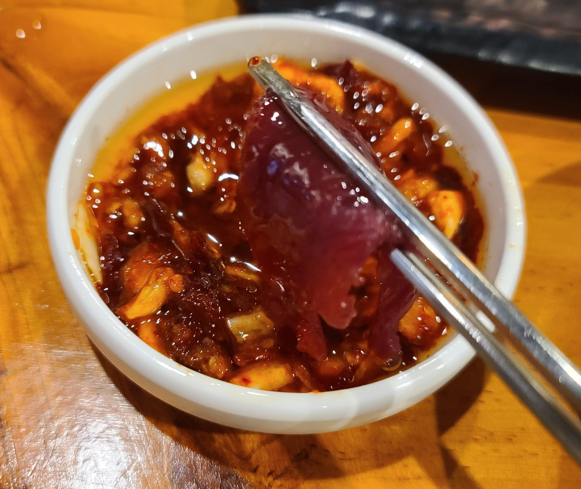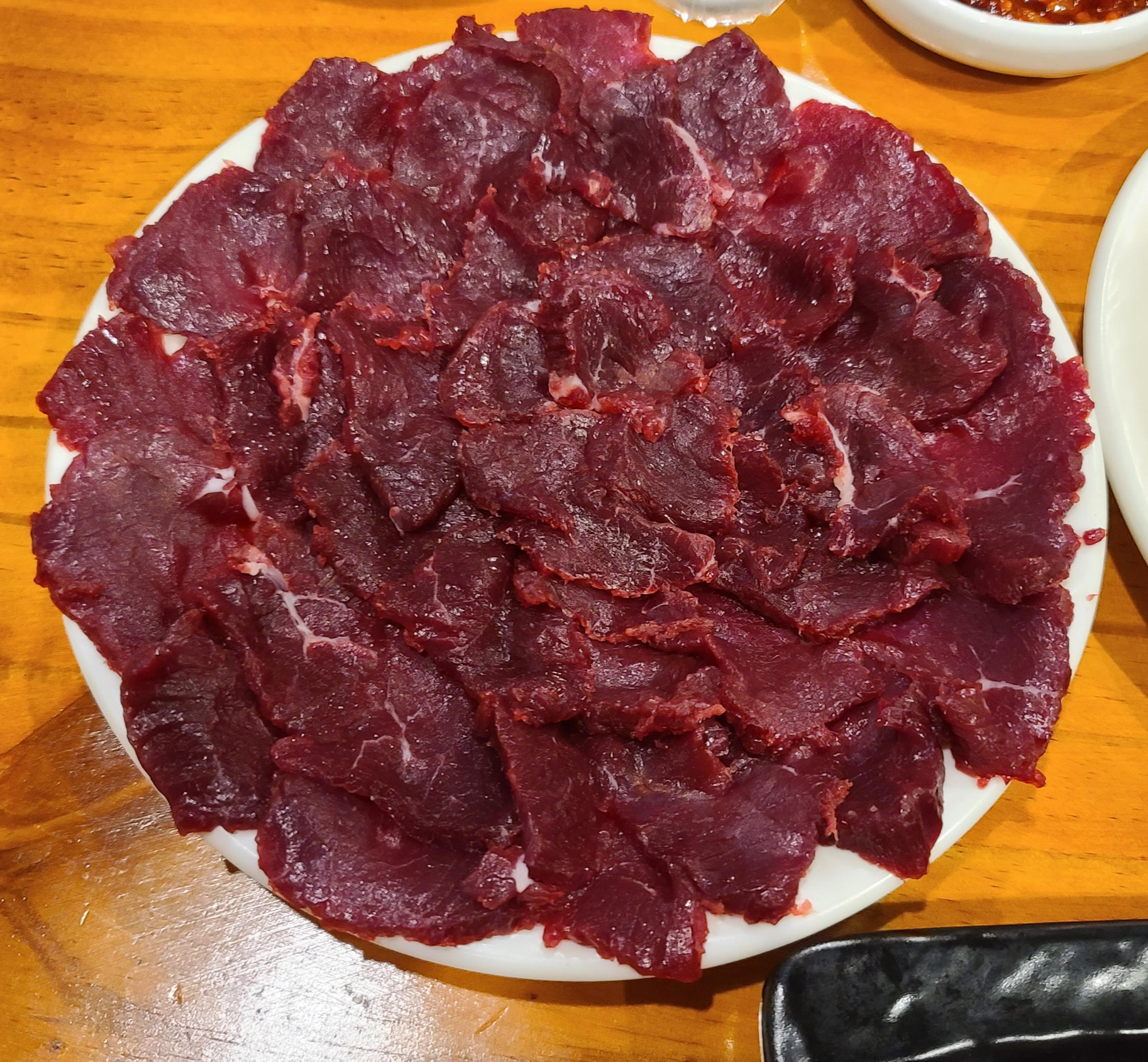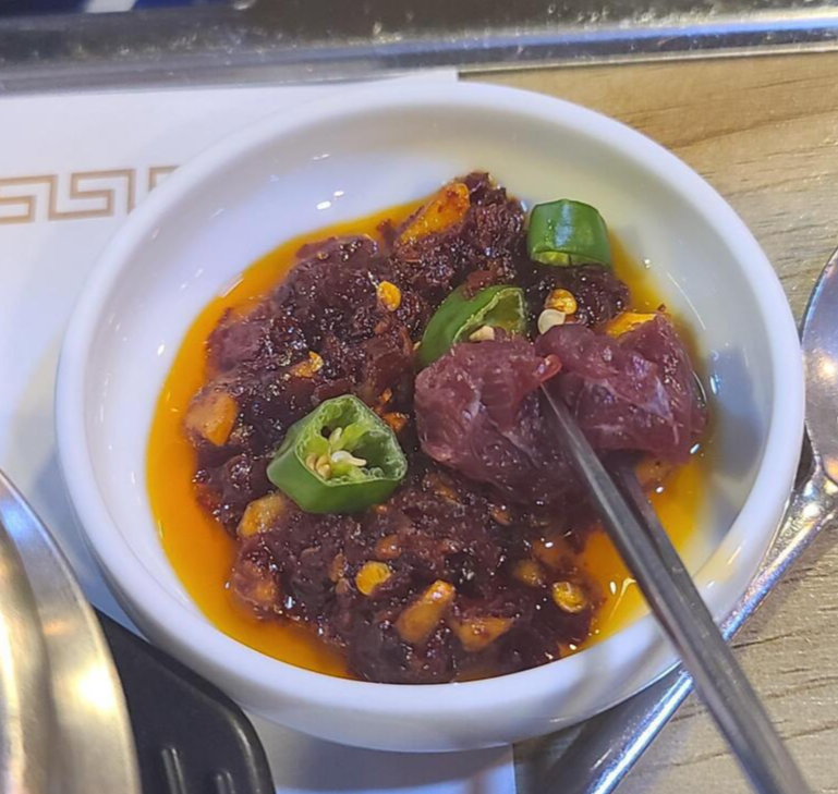 뭉티기는 찍어먹는 장 혹은 소스가 중요한 역할을 차지합니다. 소스도 겉으로 살펴보기에는 비슷해보이지만 맛을 보면 더뭉티기는 기름과 어우러져 더욱 담백하게 느껴지는데 반해 자인뭉티기는 조금 더 매운맛을 살려 입안이 얼얼할 정도로 매운 느낌을 전해줍니다. 매운맛은 호불호가 갈리기 때문에 소스는 더뭉티기가 내츄럴하며 자인뭉티기는 매운맛을 좋아하는 사람들에게 인기가 있을 것 같습니다.