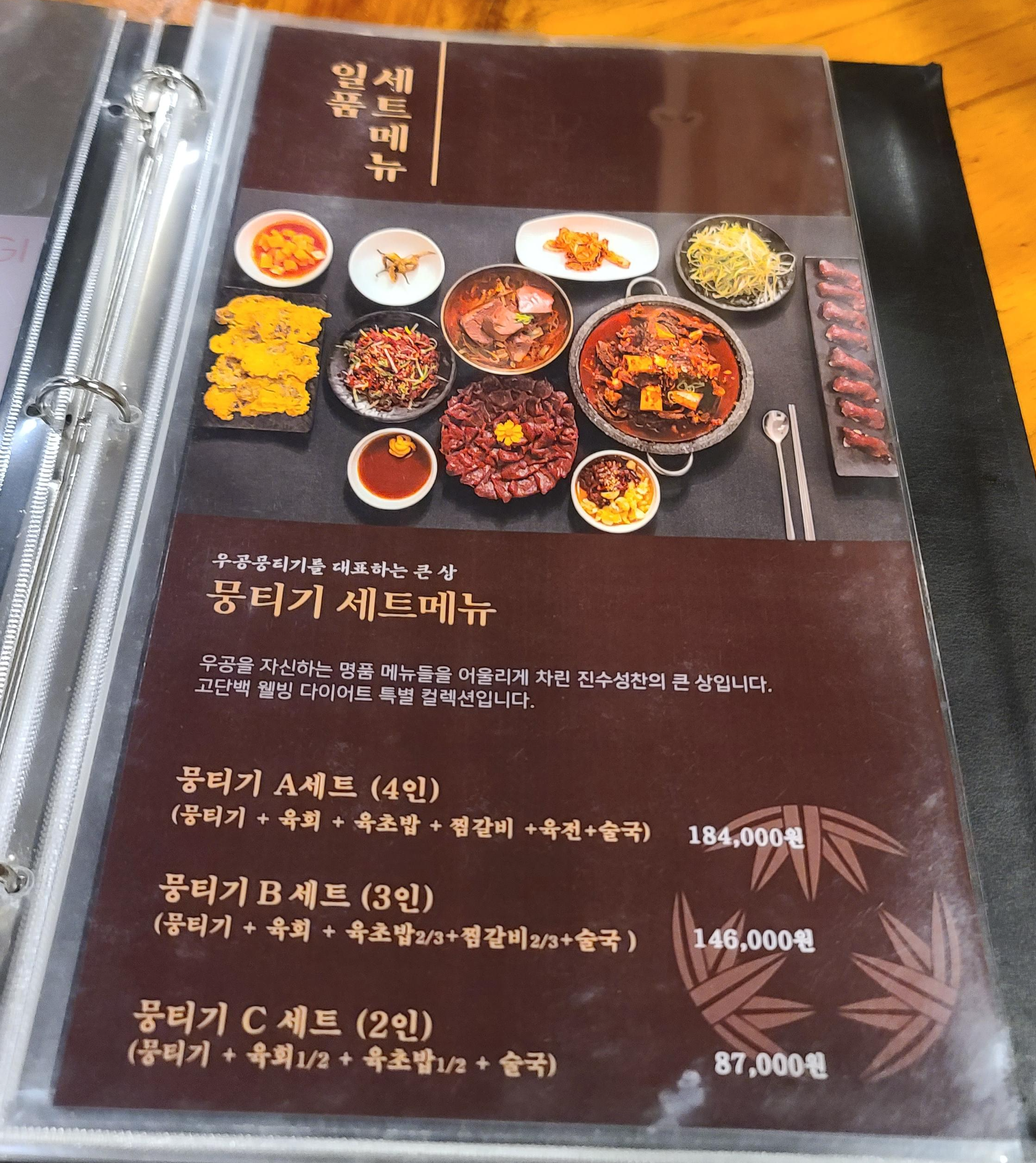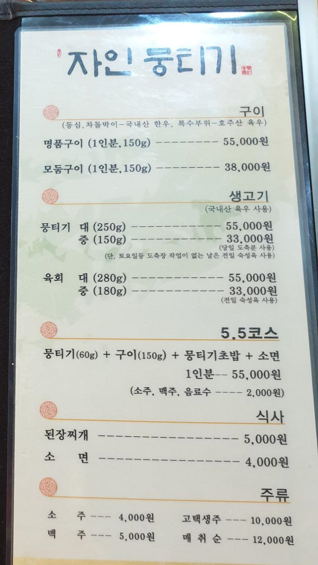 더뭉티기부터 메뉴를 살펴보면 주력세트메뉴가 인원별로 구분되어 있으며 4인세트 기준 184000원의 비교적 높은 가격대를 보여주는 것을 볼 수가 있습니다. 자인뭉티기 역시 세트메뉴로 비교를 하면 1인 기준 55000원으로 더뭉티기보다 가격대가 더 높게 책정되어 있는것이 보입니다. 메뉴구성이 뭉티기와 소고기 초밥은 똑같지만 더뭉티기는 육회와 술국 그리고 가격이 높아질 수록 찜갈비와 육전이 추가되는 것을 볼 수 있으며, 뭉티기는 기본적으로 들어가 있는 것이 보입니다. 추가적인 메뉴는 찜이냐 구이냐에 따라 취향이 나뉘기 때문에 우열을 가릴수는 없지만 구성의 다양함이나 가격대는 더뭉티기가 다소 높은것으로 보여집니다.