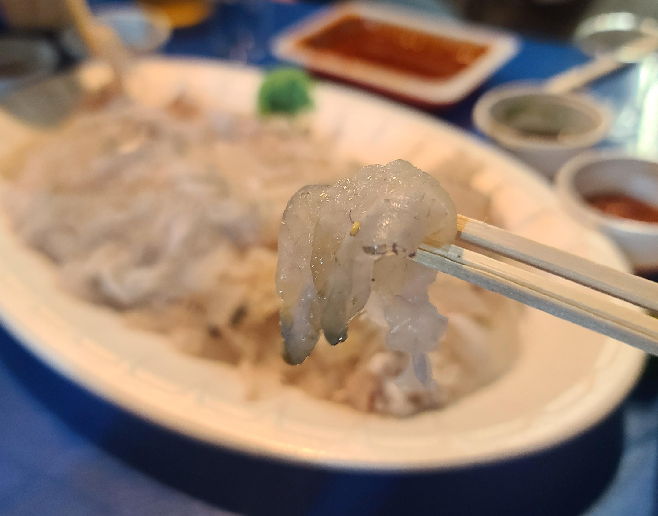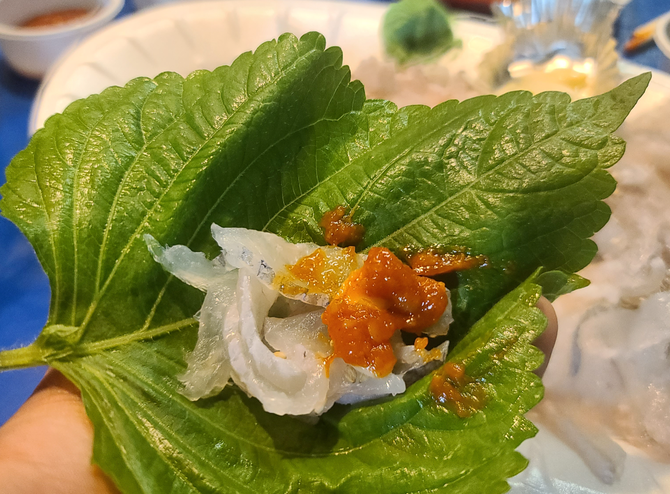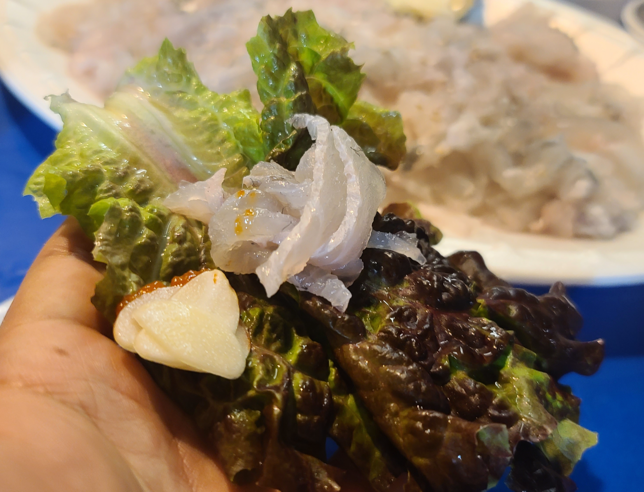 주문한 도다리 새꼬시가 나왔습니다. 뼈째길게 썰어놓은 도다리의 모습이 매우 먹음직스러워 보이고 직접잡는것을 보았기 때문에 신선함이 더욱 느껴지고 있습니다. 비주얼을 보기만 해도 씹으면 씹을수록 고소해지는 도다리세꼬시의 맛이 상상이 되며 입안에 벌써부터 침이 고이는 것이 느껴지고 있습니다.