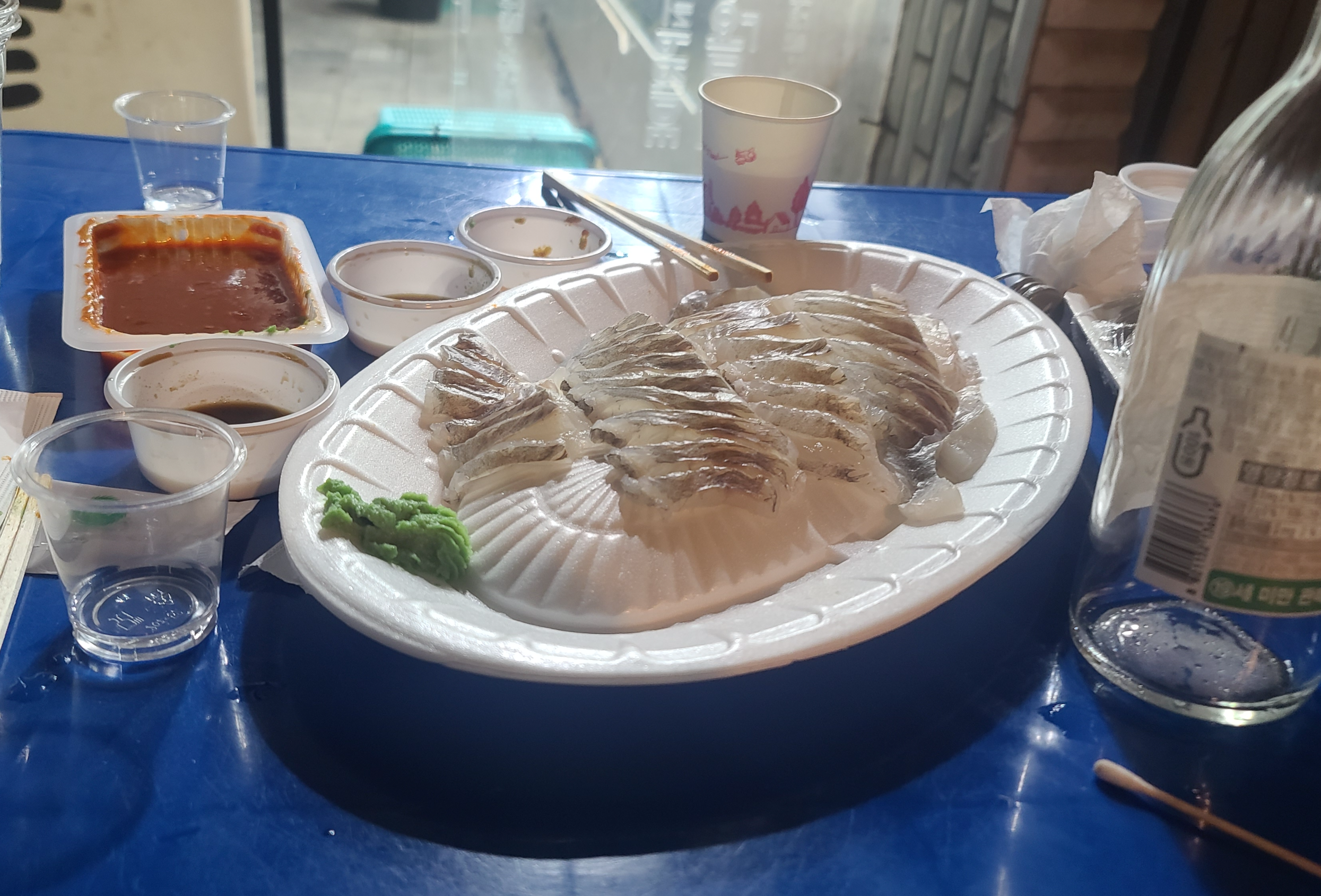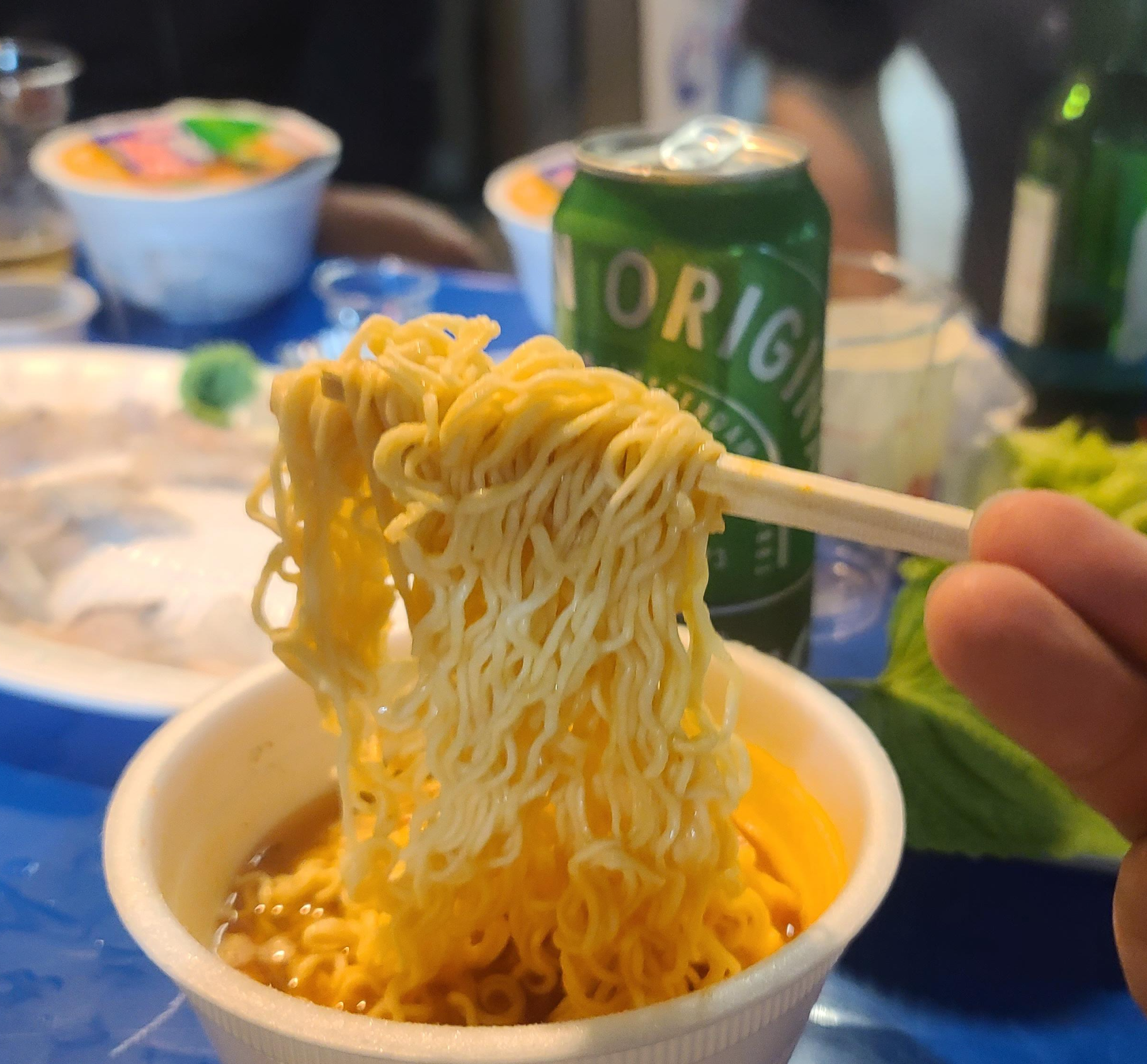 매운탕대신 사온 라면으로 식사를 마무리합니다. 회를 먹고 라면까지 먹으니 포만감에 더욱더 기분이 좋아지고 있습니다. 가격도 저렴한데 위치도 좋고 술도 자기마음대로 사서먹고, 심지어 사이드안주나 국물까지 자기마음대로 마무리하고 술꾼에게는 최고의 서비스를 제공해준 대동원회시장에 감탄하며 즐거운 밤이 깊어갑니다.