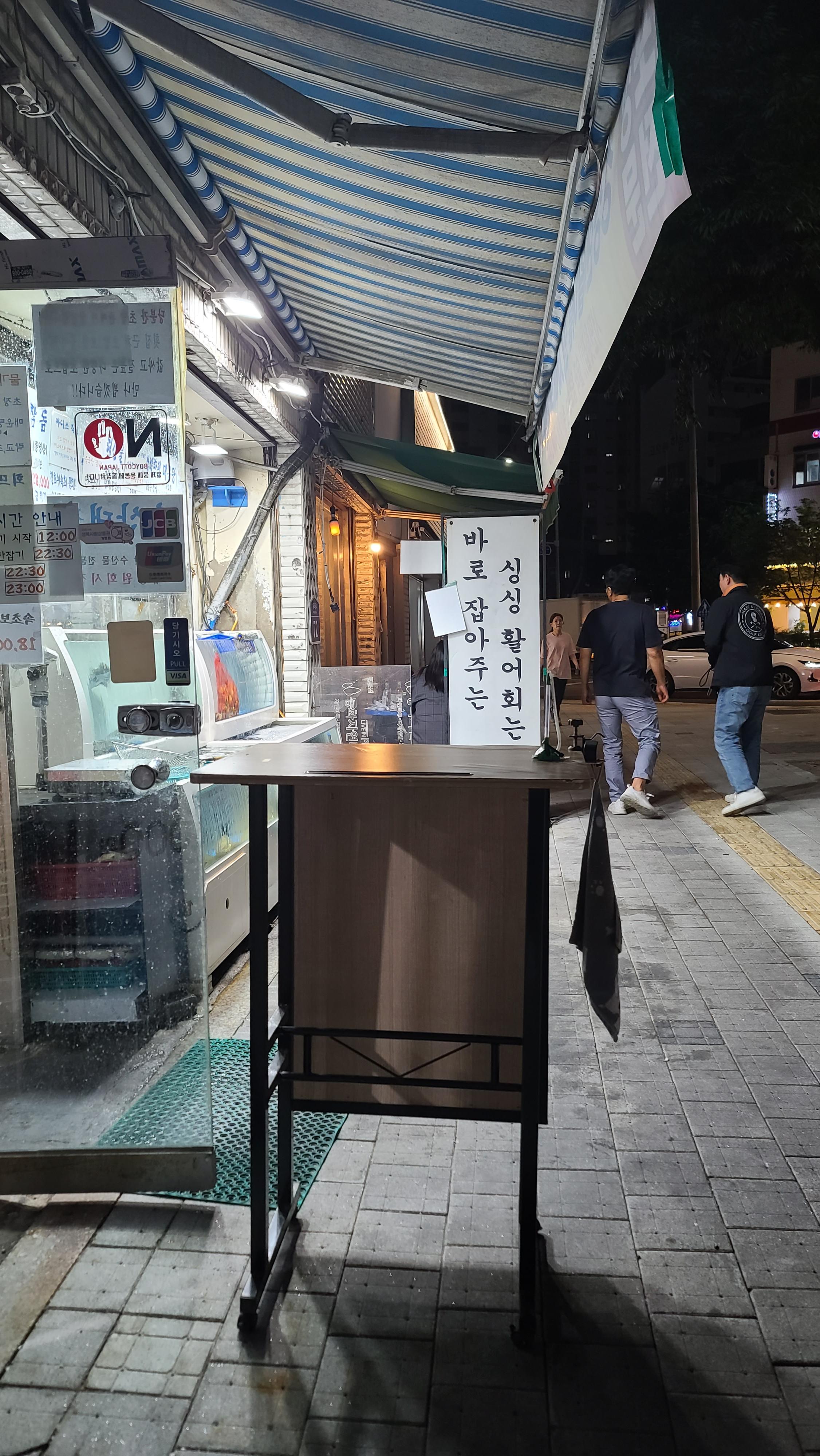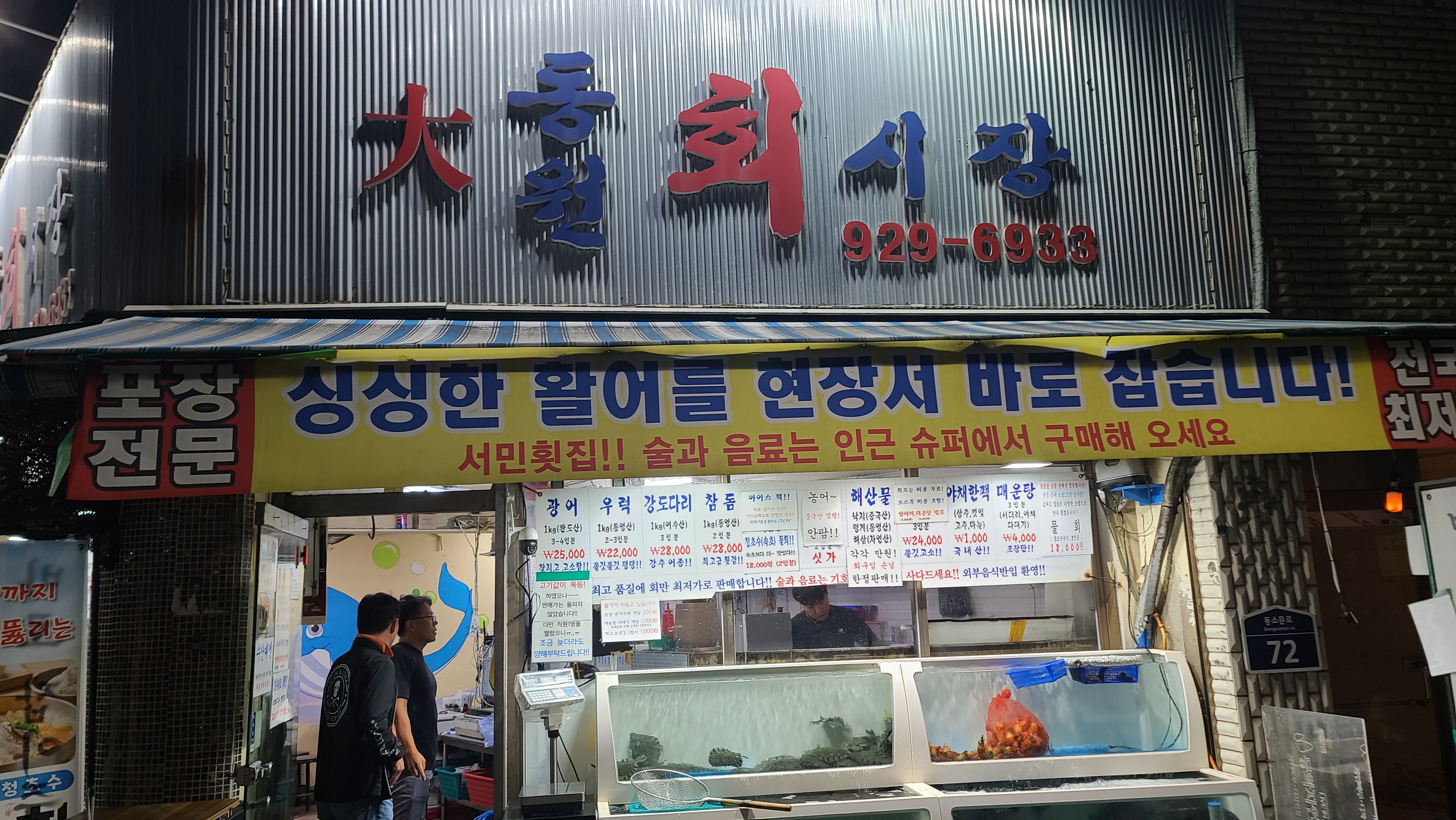 대동원회시장에서 회를 한점 먹어보기로 결정도 내렸겠다 효율적이고 빠른 주문을 위하여 한사람은 가게에서 주문과 테이블을 잡고 다른일행은 근처 마트를 방문해서 술과 음료 그리고 사이드 안주까지 사오기로 합니다. 사장님께 국물을 사와도 되냐고하니 흔쾌히 승낙하셨기 때문에 회를 먹고 매운탕 대신 라면으로 마무리까지 해보기로 합니다.