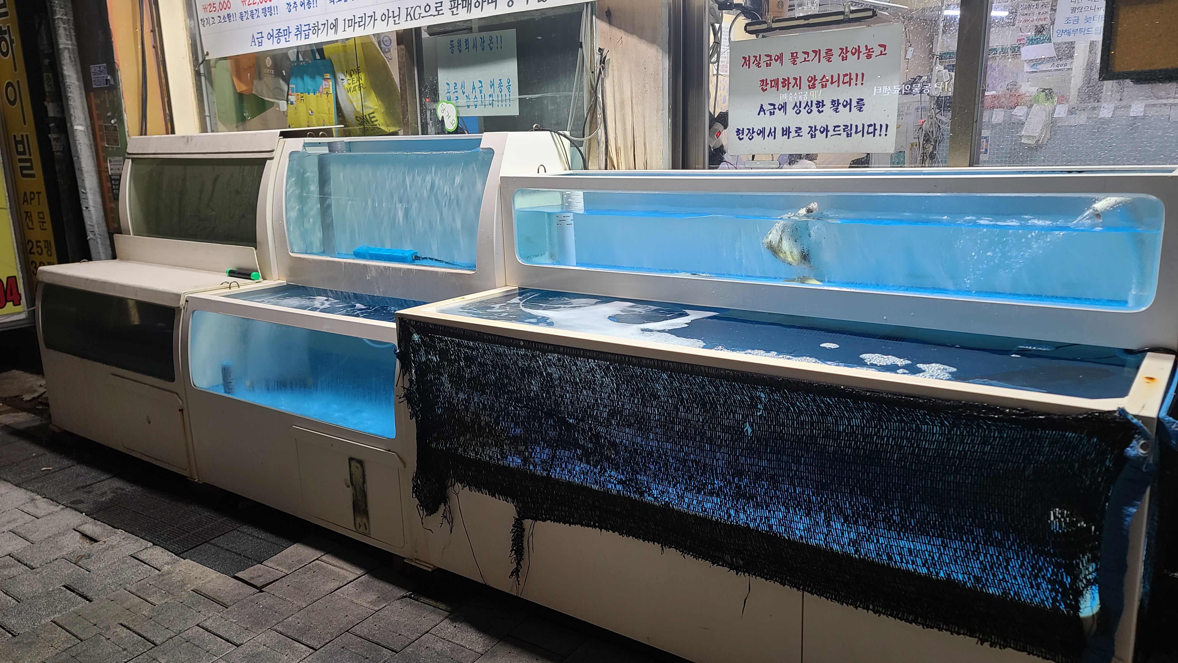 가게의 분위기와 서비스를 보기만해도 완전히 홀려서 주변을 더 살펴보게 됩니다. 수족관을 살펴보니 가게앞과 측면까지 8개 이상의 수조가 있는 것으로 보아 상당히 해산물을 많이 취급하는 것과 또한, 사람이 이렇게 많은데도 수족관에 해산물이 쌓여있지 않은 것은 회전율이 좋다는 것을 나타내주는 것을 유추하게 되어 더욱 관심이 생겨 회를 한점 먹어보기로 합니다.