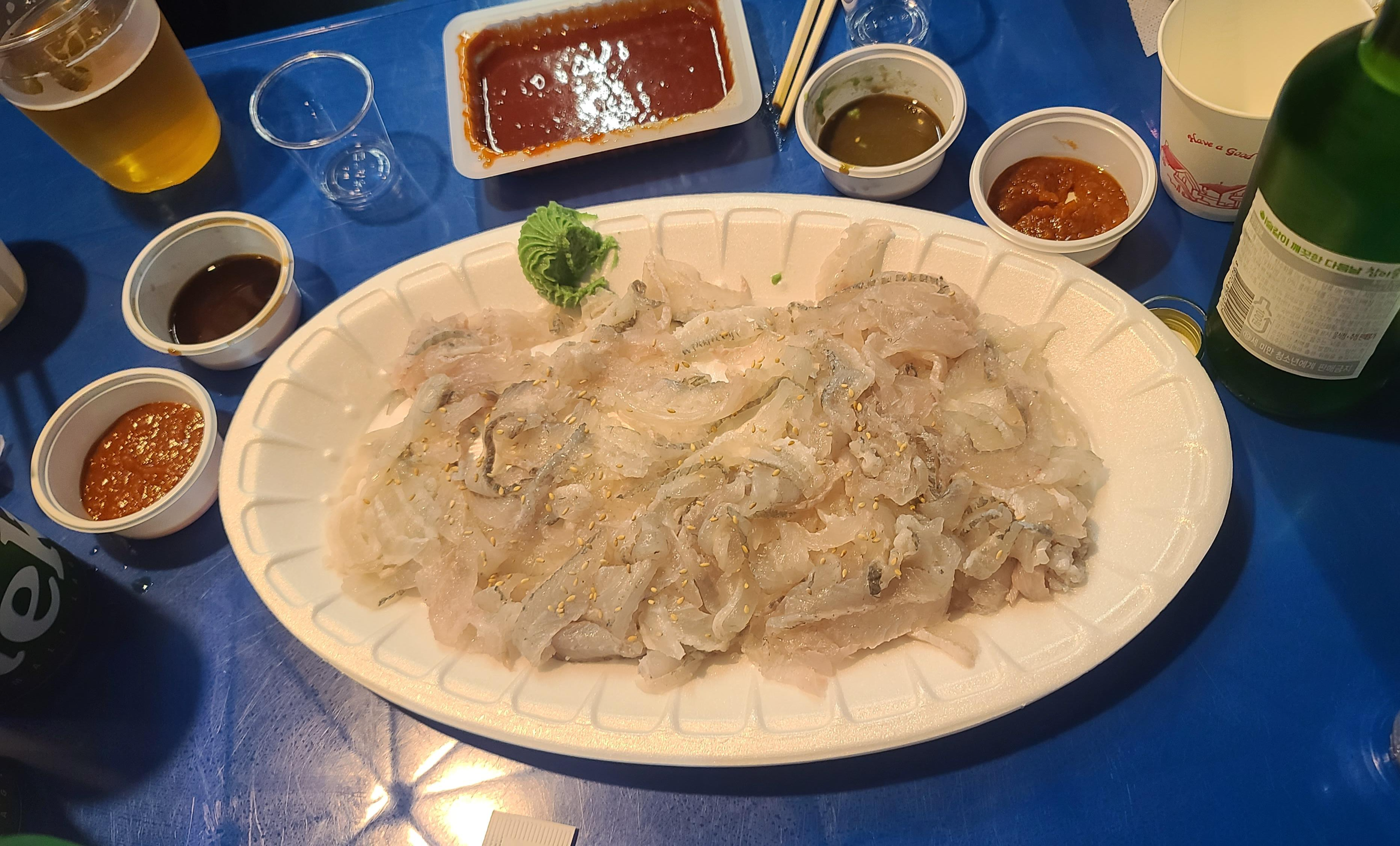 맛있어 보이는 도다리 세꼬시를 그냥도 먹어보고 간장도 찍고, 상추에 마늘도 곁들여보고, 깻잎에 고추도 얹고 다양한 방법으로 즐겨봅니다. 역시 뼈째썰기한 세꼬시의 오독한 식감과 여러가지 양념, 채소가 어우러지니 물리는 일이 없이 계속해서 들어가게 됩니다. 시원한 저녁바람을 맞으며 지나다니는 사람들 구경도 하고 맛있는 회도 먹고 역시 인기가 많은 이유를 알것 같습니다.