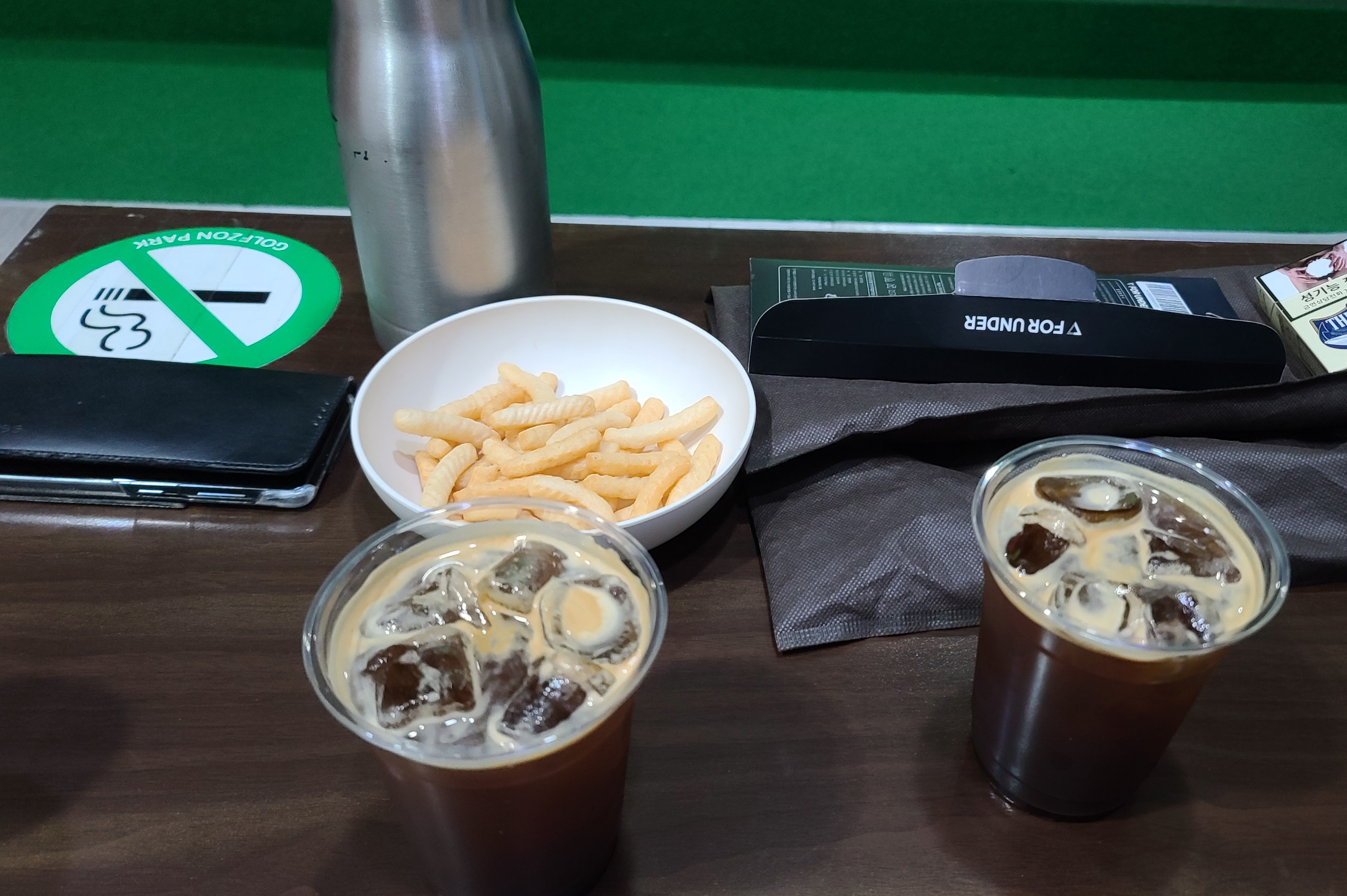 플레이를 시작하니 사장님께서 맛있는 아이스 아메리카노와 새우깡을 가져다 주십니다. 화려하진 않지만 소박한 정이 느껴지는 웰컴음료로 새우깡까지 몇조각 집어먹으니 낯선곳에서의 스크린골프 플레이가 기분이 좋아지고 있습니다.