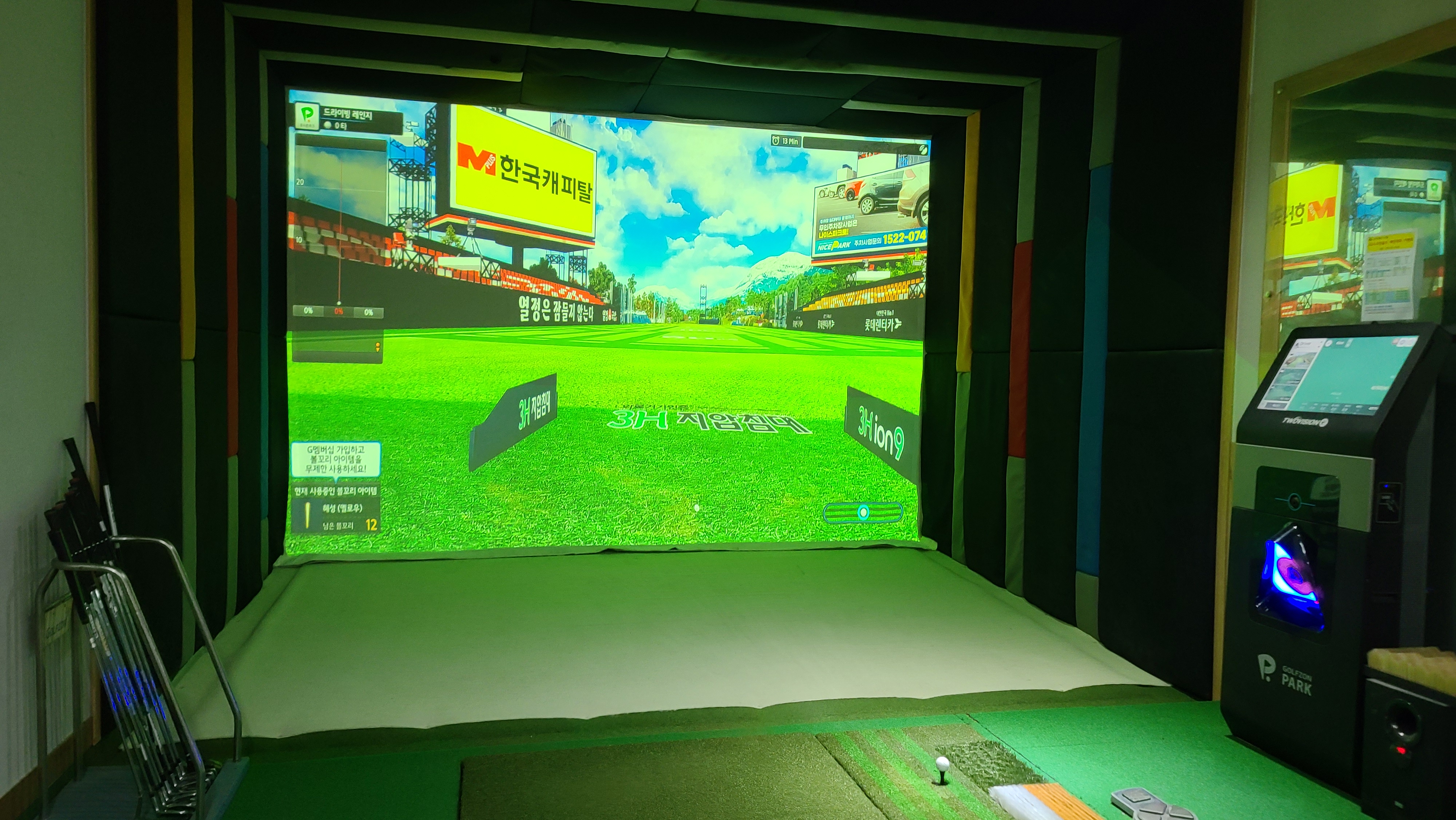 연습을 하면서 센서의 반응속도, 공의 타구음, 구질, 스크린 소리 등 다양한 요소를 체크해봅니다. 스크린골프 시스템이 센서를 통해 컴퓨터로 계산되는 과정이므로 매장에 따라 반응속도와 센서의 감도가 상이하므로 연습때 체크를 해보고 맞춰서 플레이 하는게 즐거운 게임을 위한 필수조건이 아닐 수 없습니다.