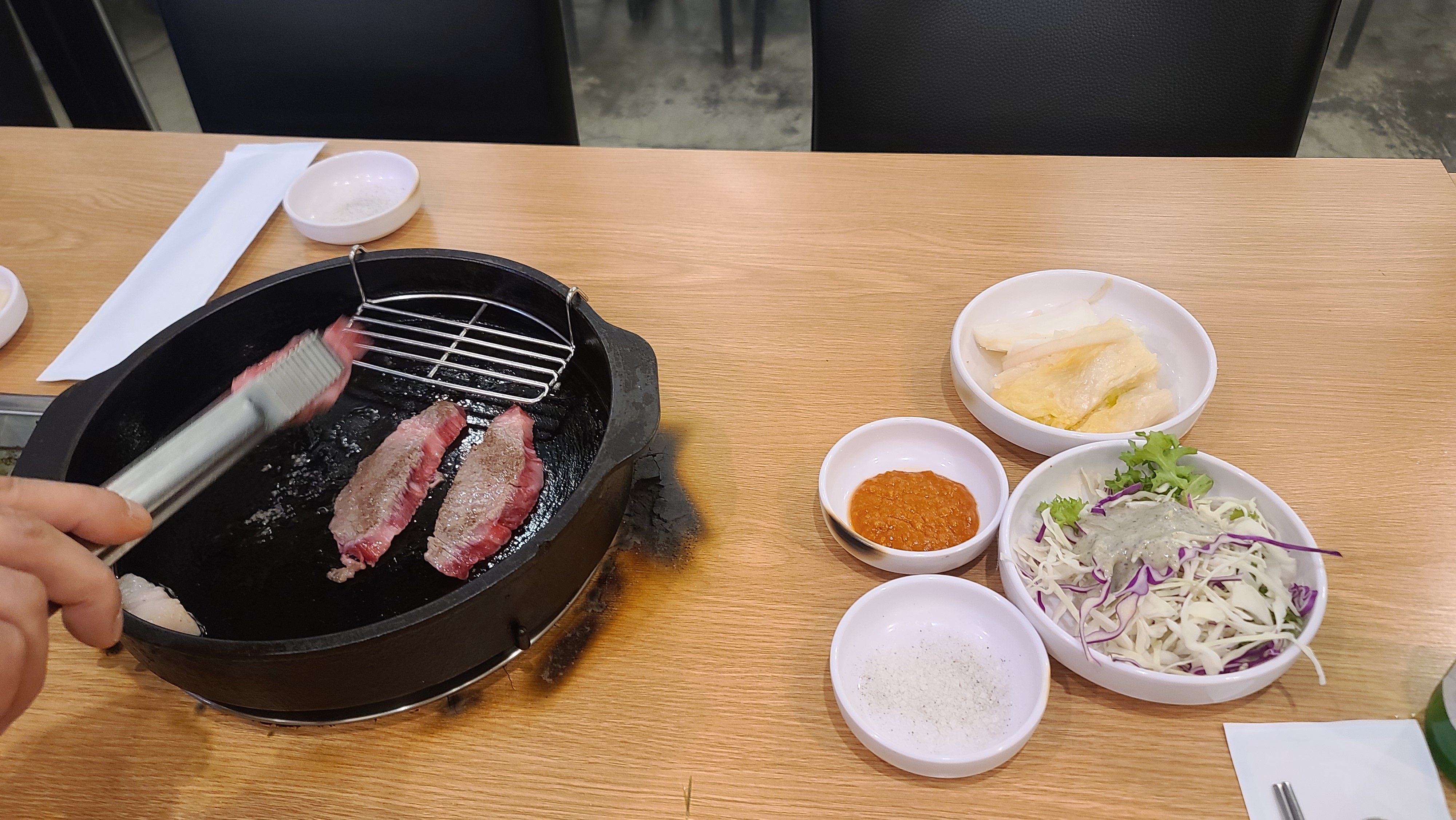 잘 달궈진 팬에 차돌박이를 올려놓고 빠르게 색만 바꿔지면 소금에 찍어 집어먹어봅니다. 소고기의 지방맛이 씹으면 씹을 수록 흘러나와 입안에 가득하게 퍼지는게 저절로 술맛이 나고 있습니다. 오늘 회식은 정말로 장소를 잘 골랐구나 하는 생각을 하게 됩니다.