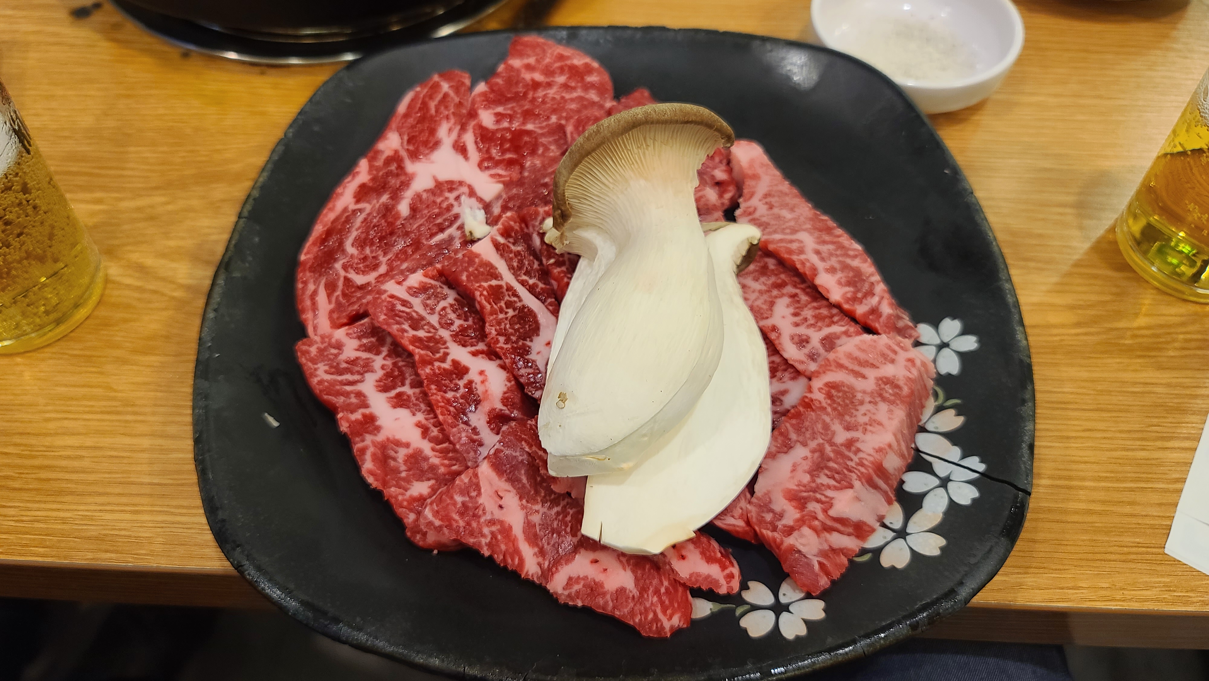 소고기 여러부위를 시켜 먹어보다가 가장 반응이 좋은 차돌박이를 추가로 주문해서 비주얼을 살펴봅니다. 선홍빛의 돌돌말린 차돌박이의 선명한 자태와 지방의 비주얼이 보기만해도 참치뱃살을 연상시켜서 입안에 침이 고이게 됩니다.