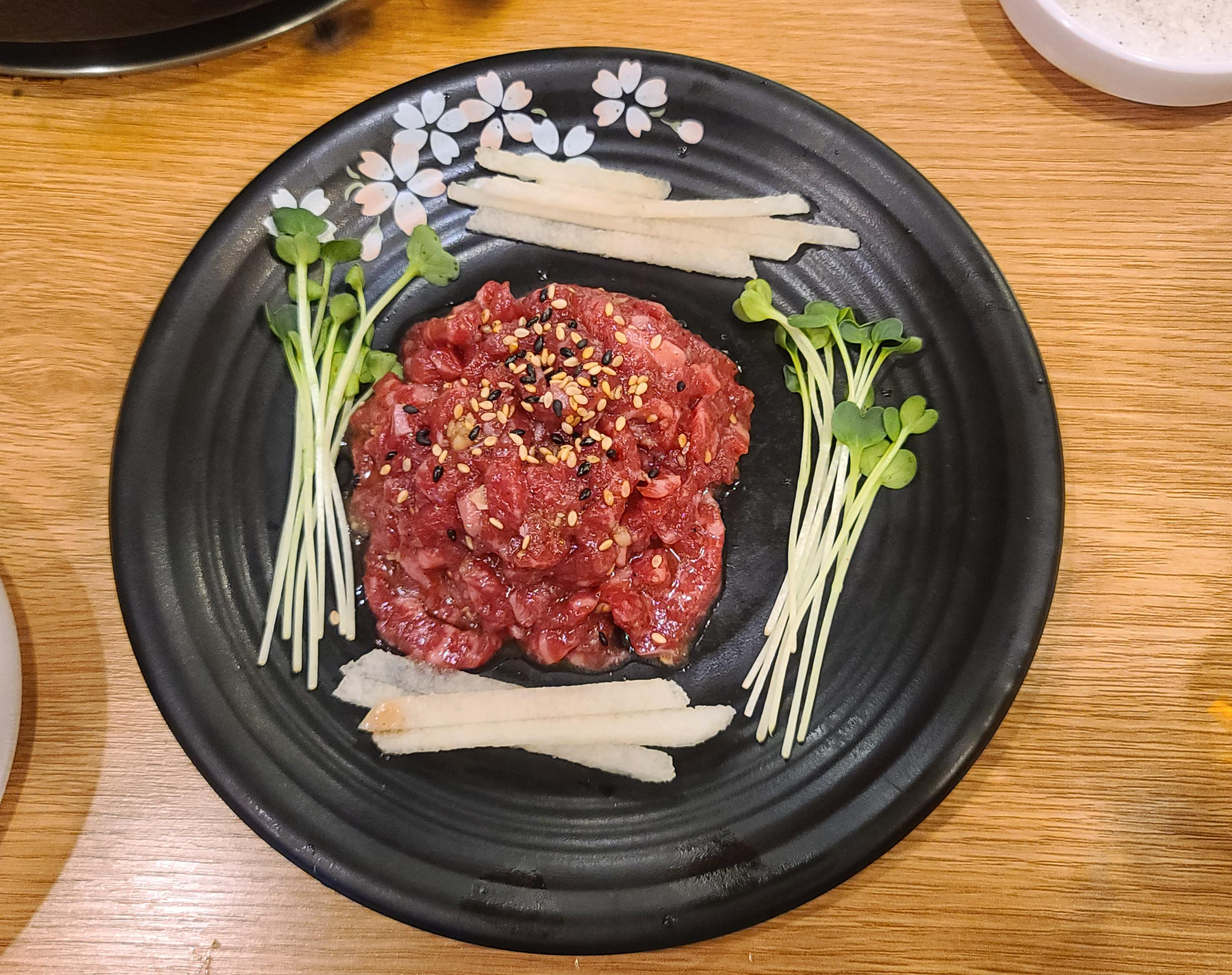 소고기는 또한 생으로 먹는 즐거움을 버릴 수 없는법 맛있게 구이를 먹으면서 육회를 주문하여 소고기를 생으로도 즐겨봅니다. 육회 맛을보니 그렇게 감동적이지는 않은게 고기의 육질보다는 양념이 특별하다고 생각되지 않는게 문제인 것 같습니다. 모든부분에 만족할 수는 없는법 장소와 서비스 그리고 구이 맛이 좋으니 별다른 문제가 되지 않게 느껴집니다.