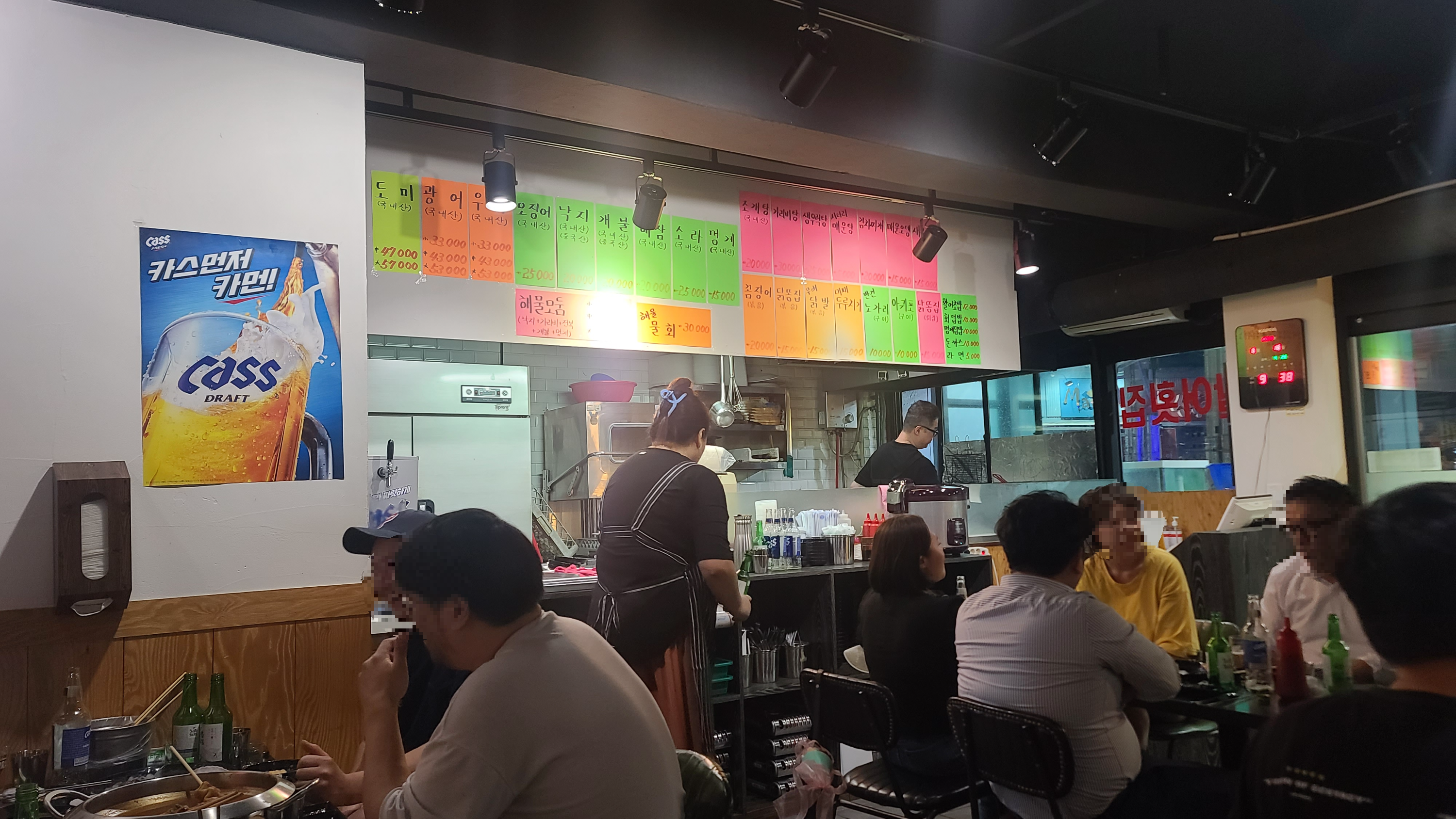 주문을 하고 가게분위기를 체크해봅니다. 오픈형 주방에 사장님이 쉴새없이 주방을 보고있는 모습이 보이고 늦은시간인데도 빈자리가 없을 정도로 테이블이 채워져있고 손님들의 회전이 계속 되는게 주변술집에서 배부르지 않게 2차를 하기에 매우 잘 알려진 장소인가 보다 하는 느낌을 받게 됩니다.