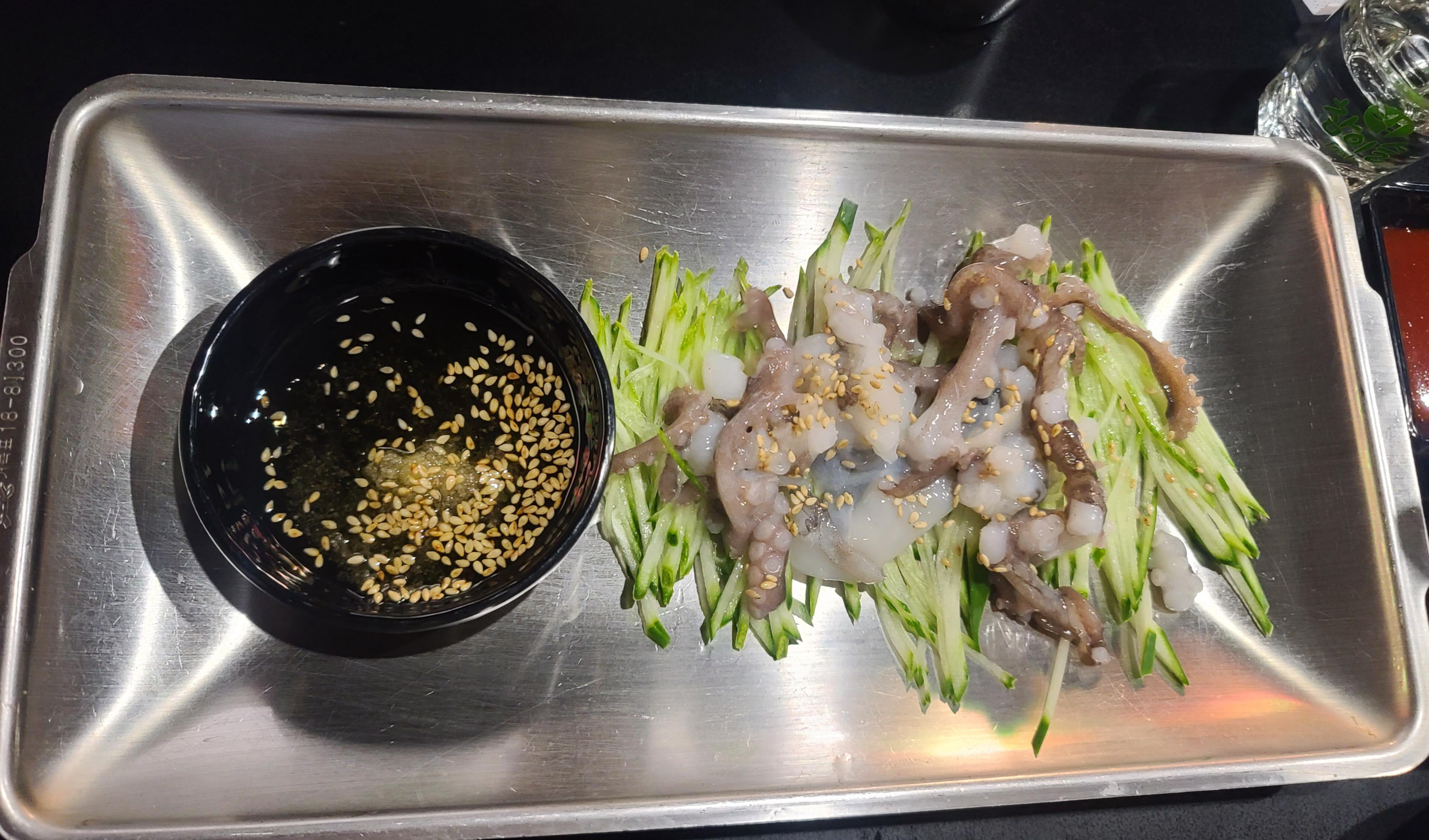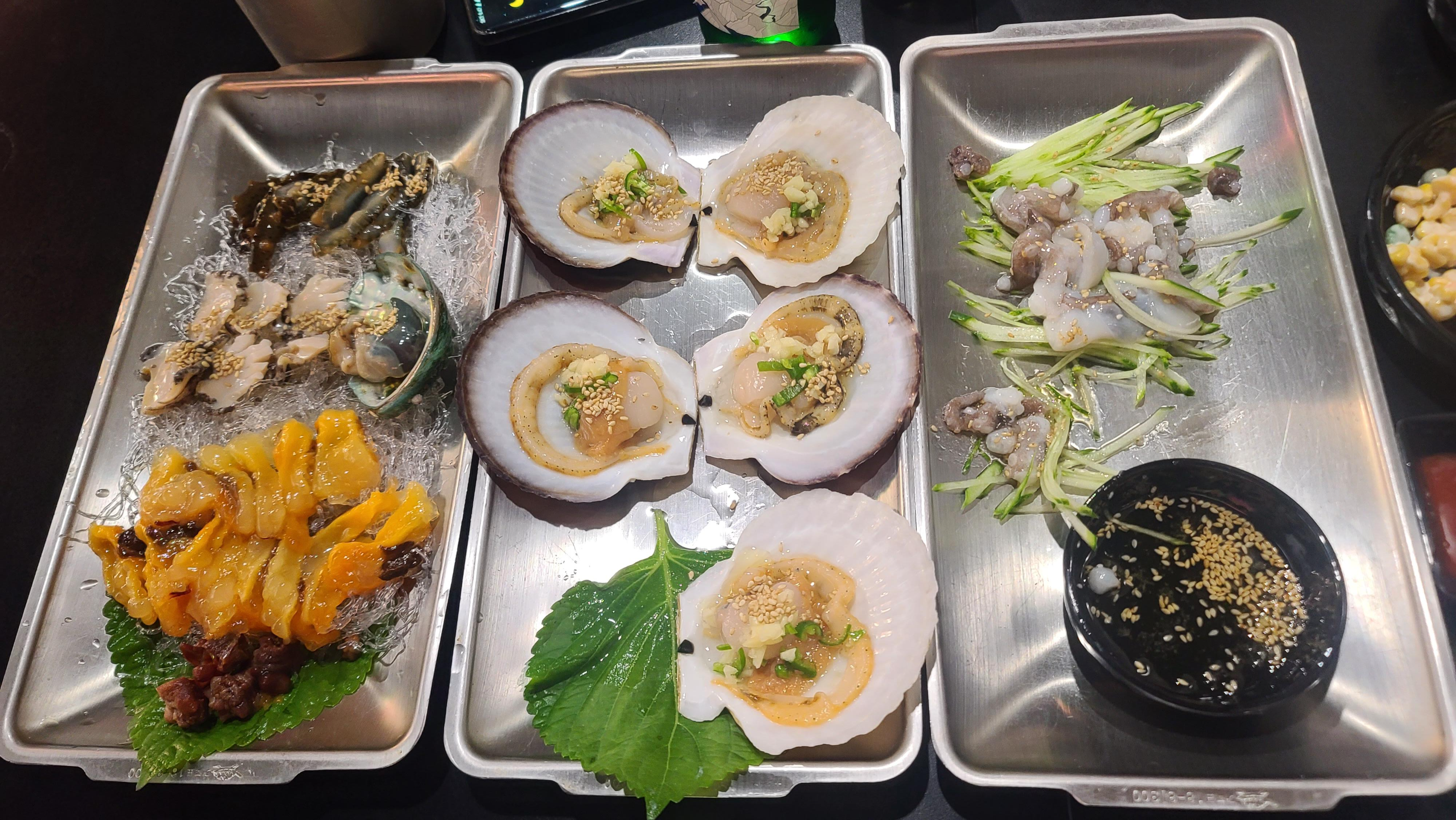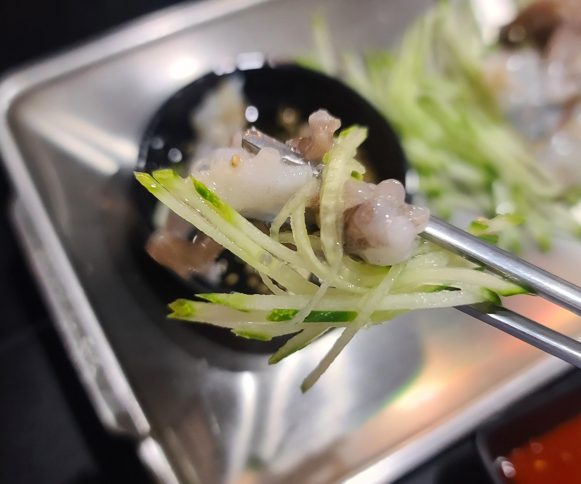 산낙지의 뒤를 이어 모양이 이쁘게 담긴 가리비가 나왔습니다. 소박하지만 신선도가 좋아보여서 양념을 찍어서 한입 넣었더니 탱글탱글한 가리비의 식감이 상쾌하게 전달되며 씹으면 씹을수록 우러나오는 단맛의 가리비 엑기스가 입안에 퍼지며 상당히 좋은 상태인 것을 느끼게 됩니다.