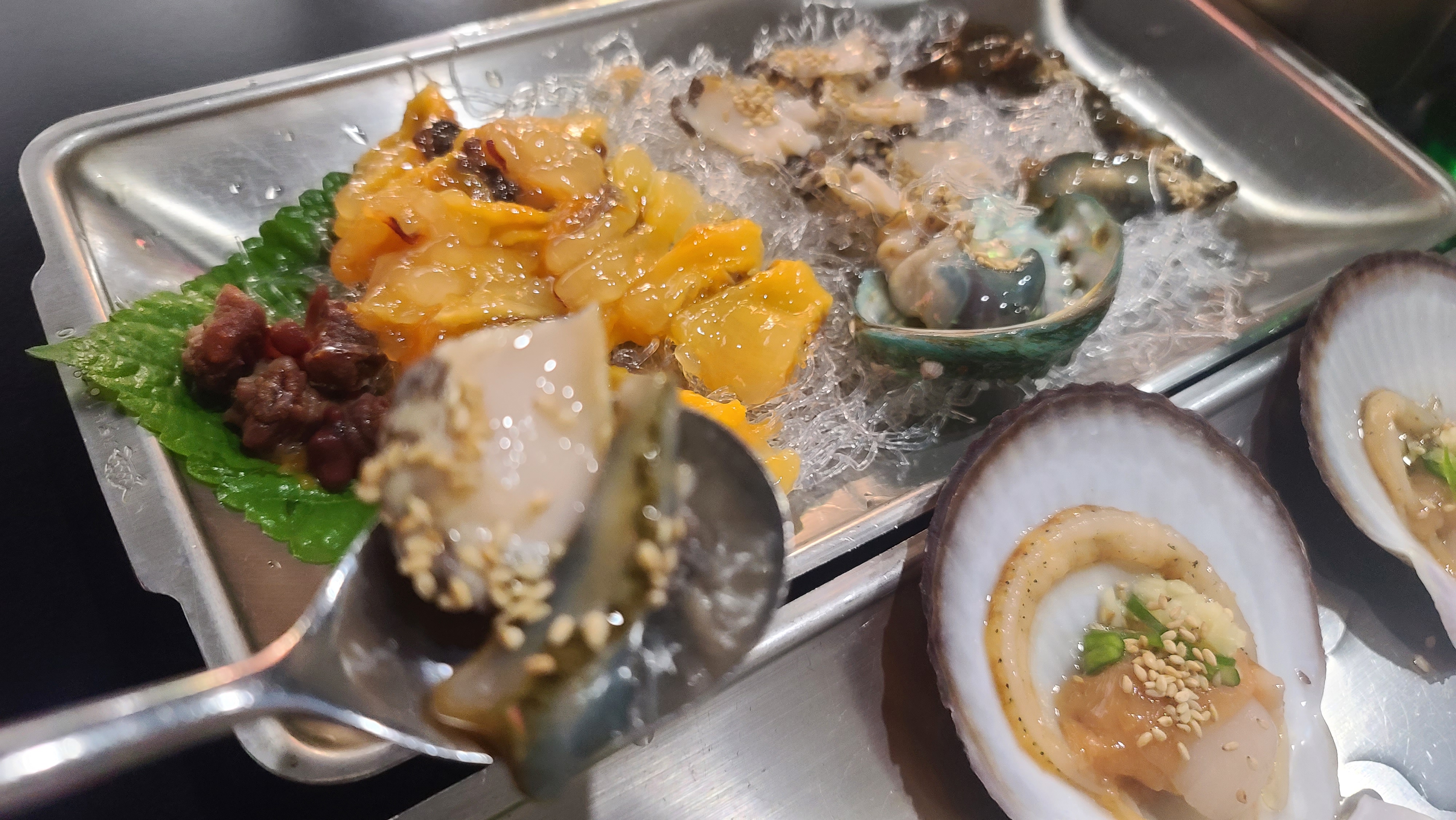 조금 더 기다리자 마무리로 멍게, 해삼, 전복의 3종세트가 나와 해물모듬이 완성되었다고 말씀을 해주십니다. 해삼 한마리, 멍게 한마리, 전복 작은것 한마리 소박해보이는 구성이 아닐 수 없습니다.