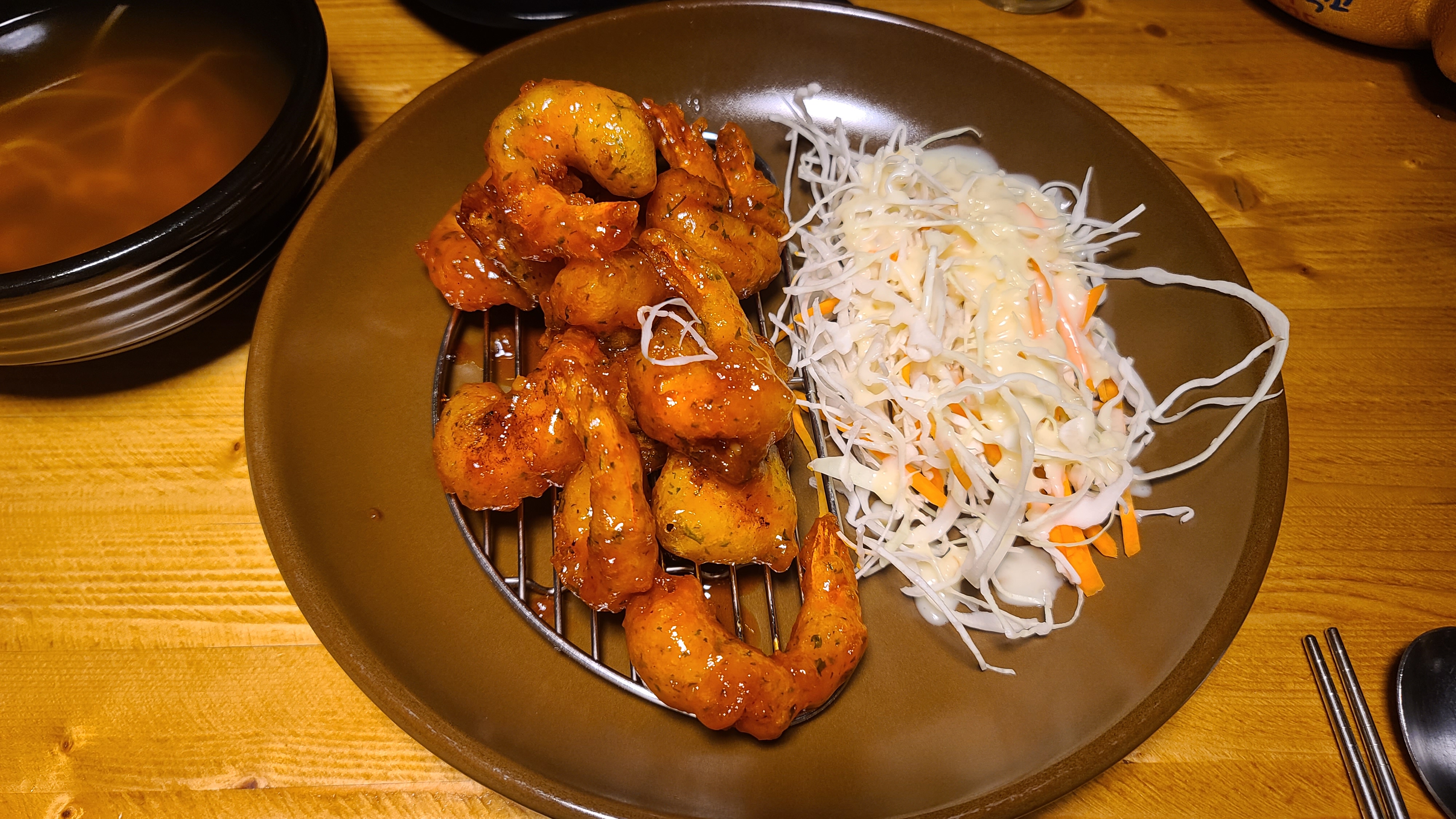 잠시 기다리자 주문한 안주 깐쇼새우가 나왔습니다. 새우와 맥주를 한잔하며 들이키고 싶었지면 대동집의 가장 큰 약점은 바로 생맥주가 없다는 점입니다. 따라서 모든 맥주는 병으로 즐겨야 하며 이런 것을 보니 더욱 막걸리나 소주를 들이키게 되는 전통주점이 아닐까 생각해보게 됩니다.