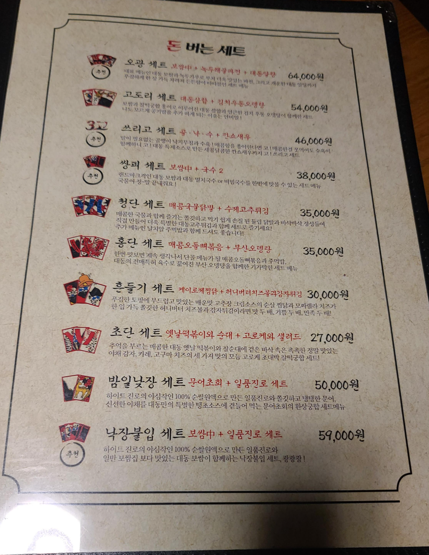 들어가서 자리를 잡고 메뉴판을 좀더 세심히 살펴봅니다. 오광세트, 고도리세트, 쌍피세트, 낙장불입세트 등 다양한 화투용어를 사용하여 세트구성을 해놓은 것이 가장 처음에 보이고 탕, 튀김, 전, 볶음 등 다양한 한식메뉴가 이미지와 함께 있어서 알아보기도 쉽고 외국인 한식 접대를 할때 데려와봐야겠다는 생각을 하게 됩니다.