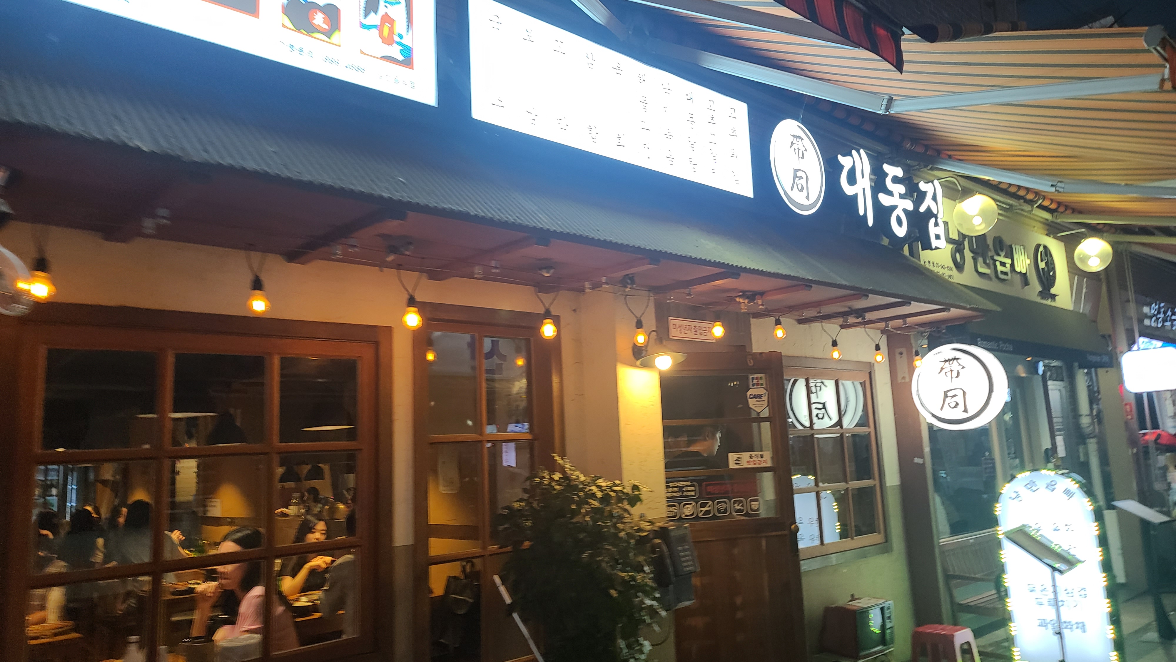 영동시장 안으로 들어가서 걷다가 시선을 사로잡는 간판이 있어서 살펴보기로 합니다. 간판에는 대동집이라고 쓰여있고 화투 5광으로 복을 전한다는 문구가 마음에 드는 가게입니다. 호기심이 생겨서 가게 분위기과 메뉴를 살펴보기로 합니다.