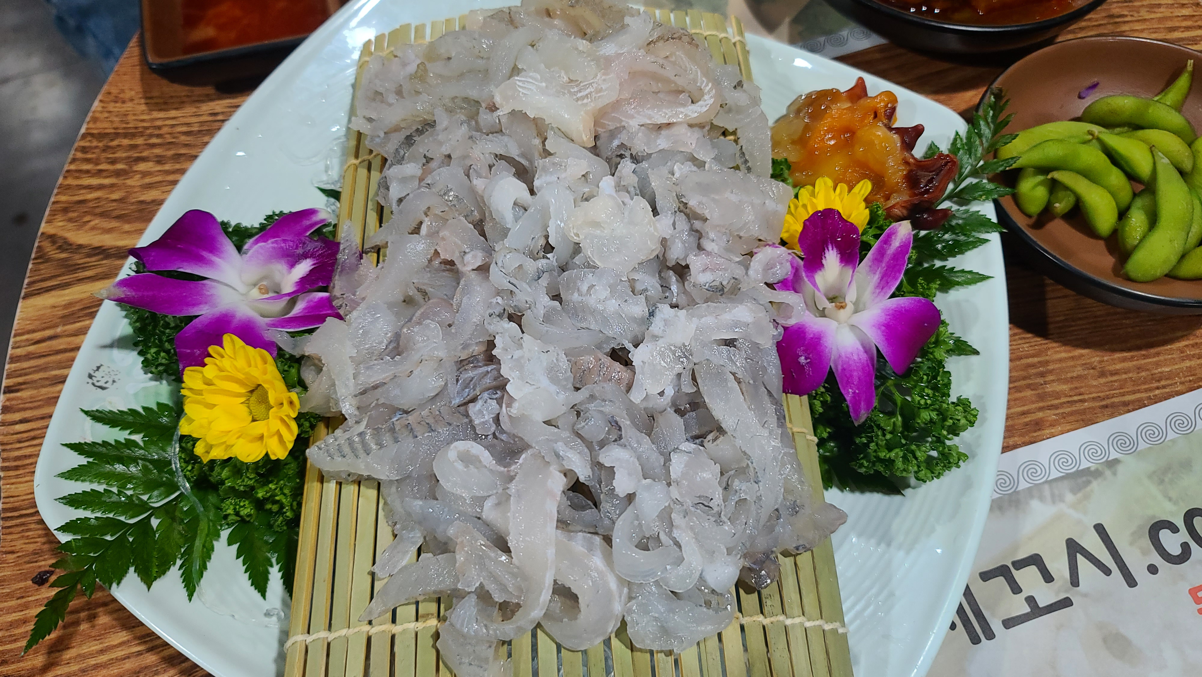 가게 안을 둘러보면서 잠시 기다리자 밑반찬 스키다시가 나오는데 멍게의 비주얼이 예사롭지가 않습니다. 사장님께 여쭤보니 동해안 자연산멍게이며 양식과는 맛자체가 다를거라고 호언장담을 하십니다. 살이 통통 오른 자연산 멍게를 하나 잡아서 맛을 보니 오오 넘쳐나는 바다내음과 멍게 특유의 식욕을 자극하는 맛성분이 양식과는 비교가 되지 않을 정도로 입속에서 춤을 추며 환상의 맛세계를 경험하게 해줍니다. 스끼다시로 나온 자연산 멍게 하나에 이렇게 휘둘리는 모습을 보며 가자미 또한 자연산일 확률이 높을 것이라는 기대감이 들어서게 됩니다.