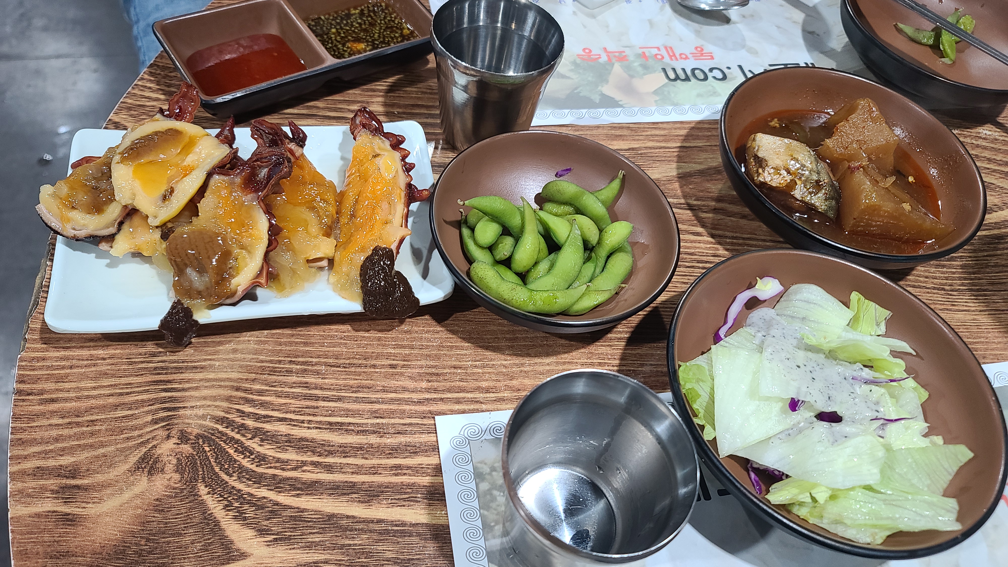 세꼬시를 기다리는 동안 끝없는 스끼사디의 행렬을 계속되고 있습니다. 가리비, 계란찜, 무조림, 김치전 그리고 빠지면 섭섭한 콘치즈까지 여러가지 밑반찬을 맛보다가 배가 먼저 불러올 것 만 같은 다양한 구성이 아닐 수 없습니다.