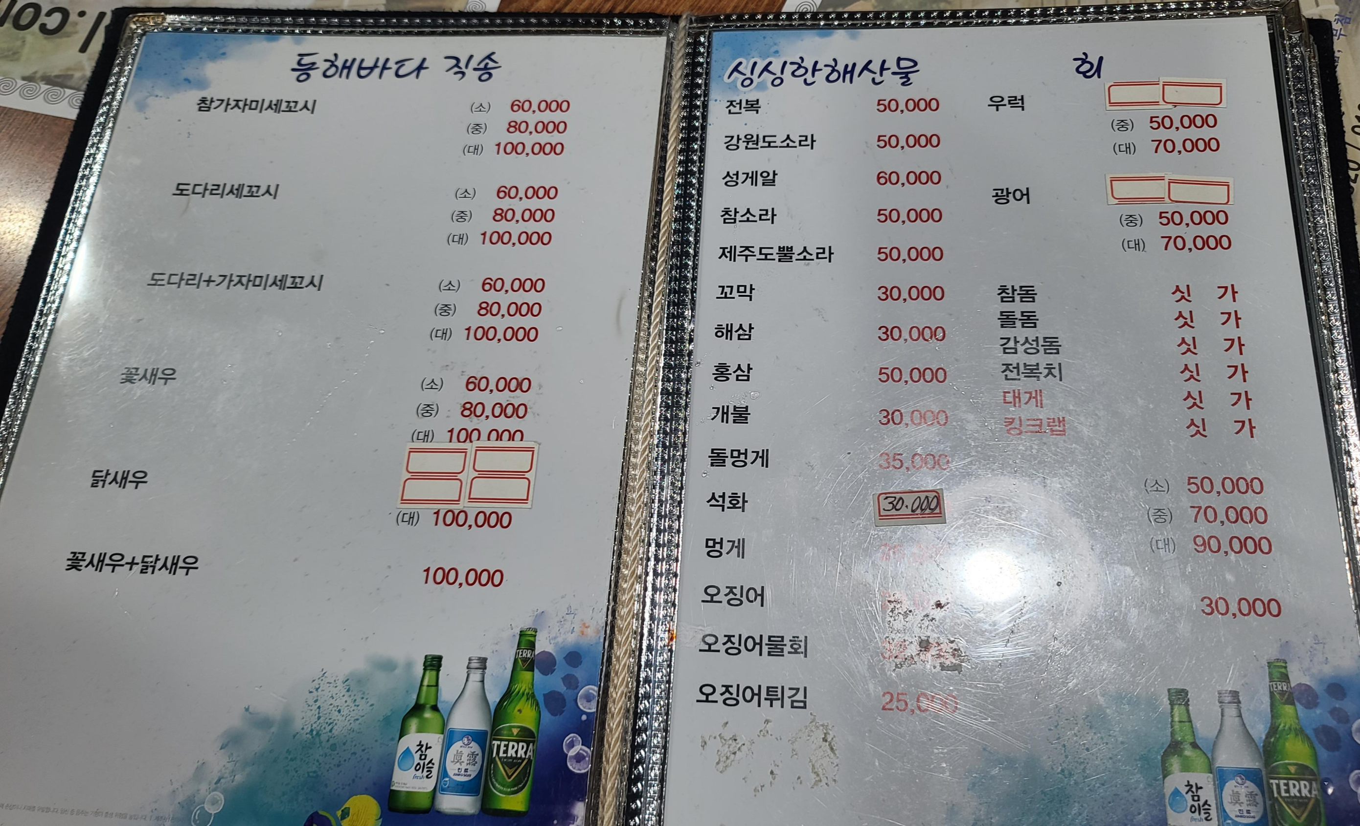 가게 안으로 들어와서 자리를 잡고 메뉴판을 살펴봅니다. 대표메뉴로 참가자미와 도다리 세꼬시가 보이고 수조에서 보았던 꽃새우와 닭새우가 대표메뉴로 자리잡고 있는 것이 보입니다. 무엇을 먹을까 한참 고민하다 결국 가게이름대로 세꼬시를 도다리와 참가자미를 사이좋게 썰어서 맛보기로 합니다.
