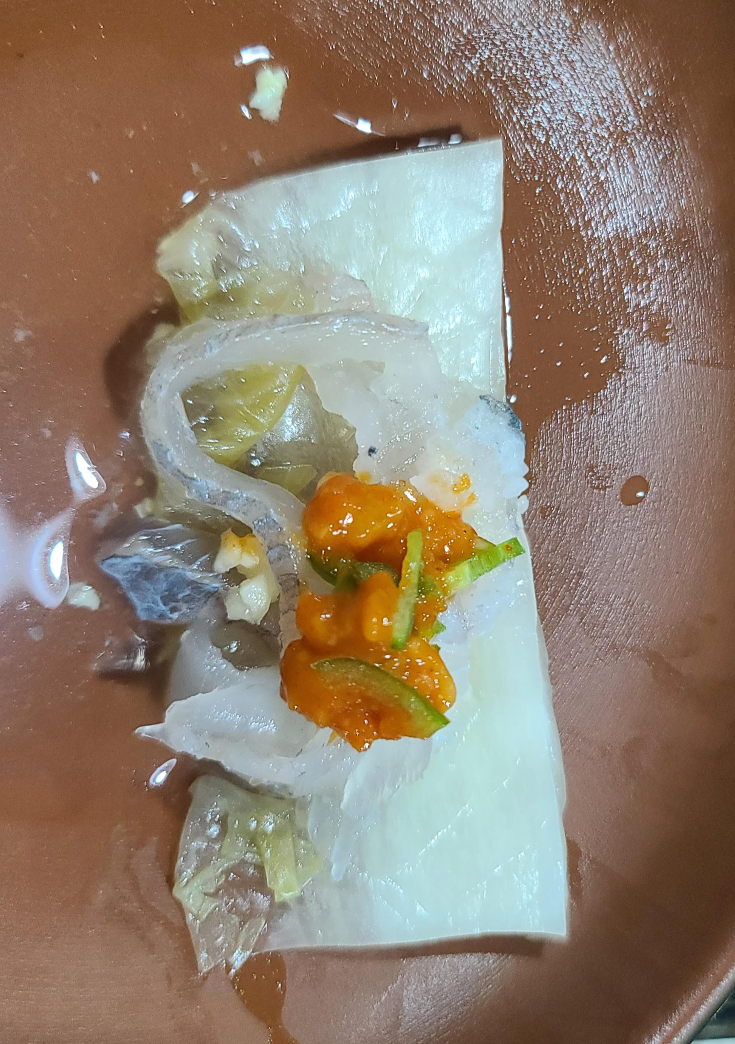 세꼬시를 간장만 찍어서 순수하게 맛을보니 씹으면 씹을수록 고소한 맛이 배어나오며 뼈와 함께 있어서 오도독거리는 식감도 액센트를 줘서 더욱 맛있게 느껴지게 됩니다. 지방이 물이 올라서 한점한점 집어먹을때 마다 마치 광어의 지느러미인 엔가와를 맛보는 것 처럼 물오는 맛이 매우 감동적으로 다가오고 있습니다.