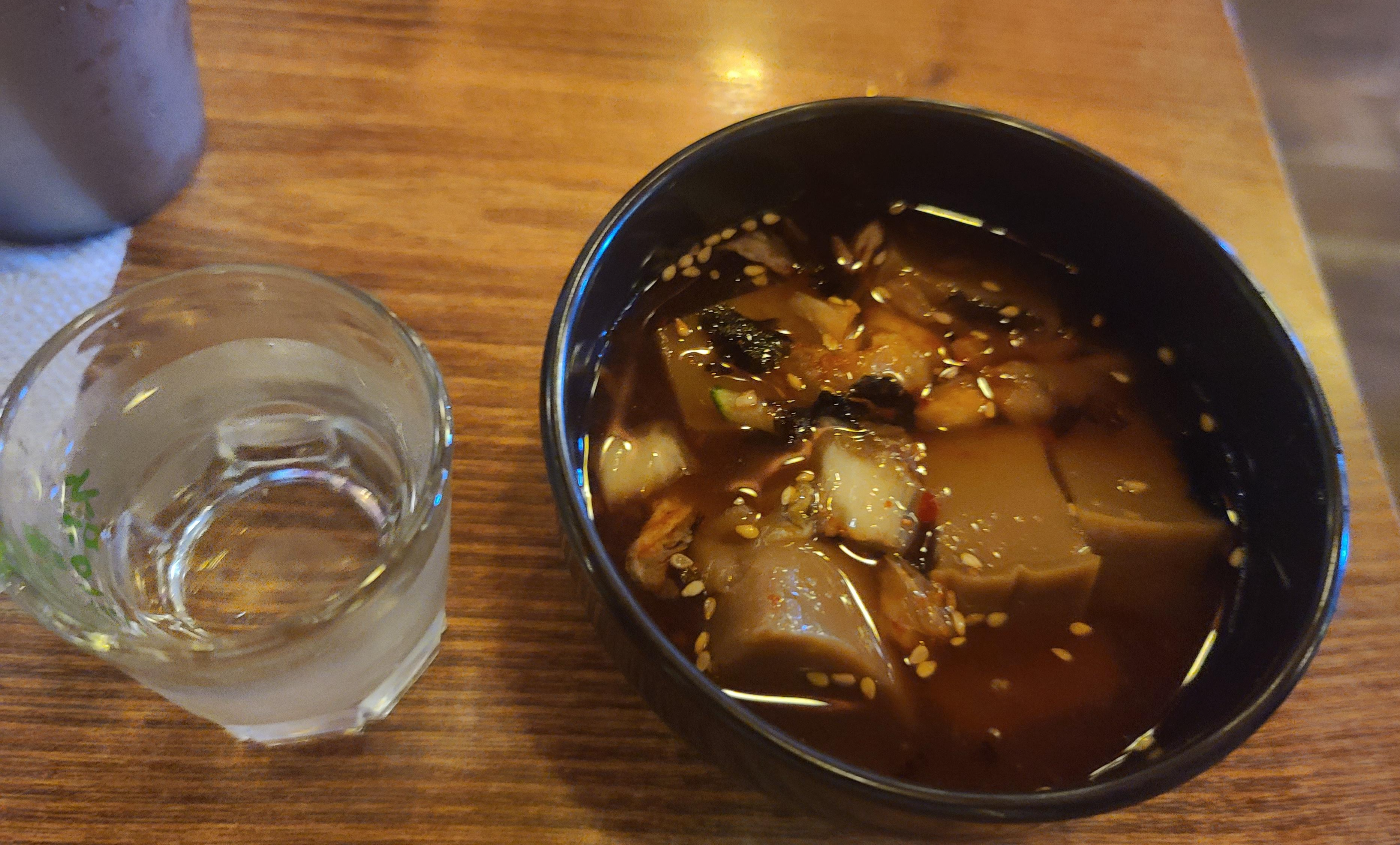 잠시 분위기를 구경하는 사이 에피타이저로 묵사발이 먼저 나왔습니다. 덜어서 맛을 보니 조미료의 진한 감칠맛과 묵사발 그리고 양념맛이 어우러지며 입안에 침이 저절로 고이게 됩니다. 훌륭한 에피타이저에 소주를 들이키며 메인안주가 나오기전 좋은 식전주를 즐기는 타이밍이 되어 기쁘게 됩니다.
