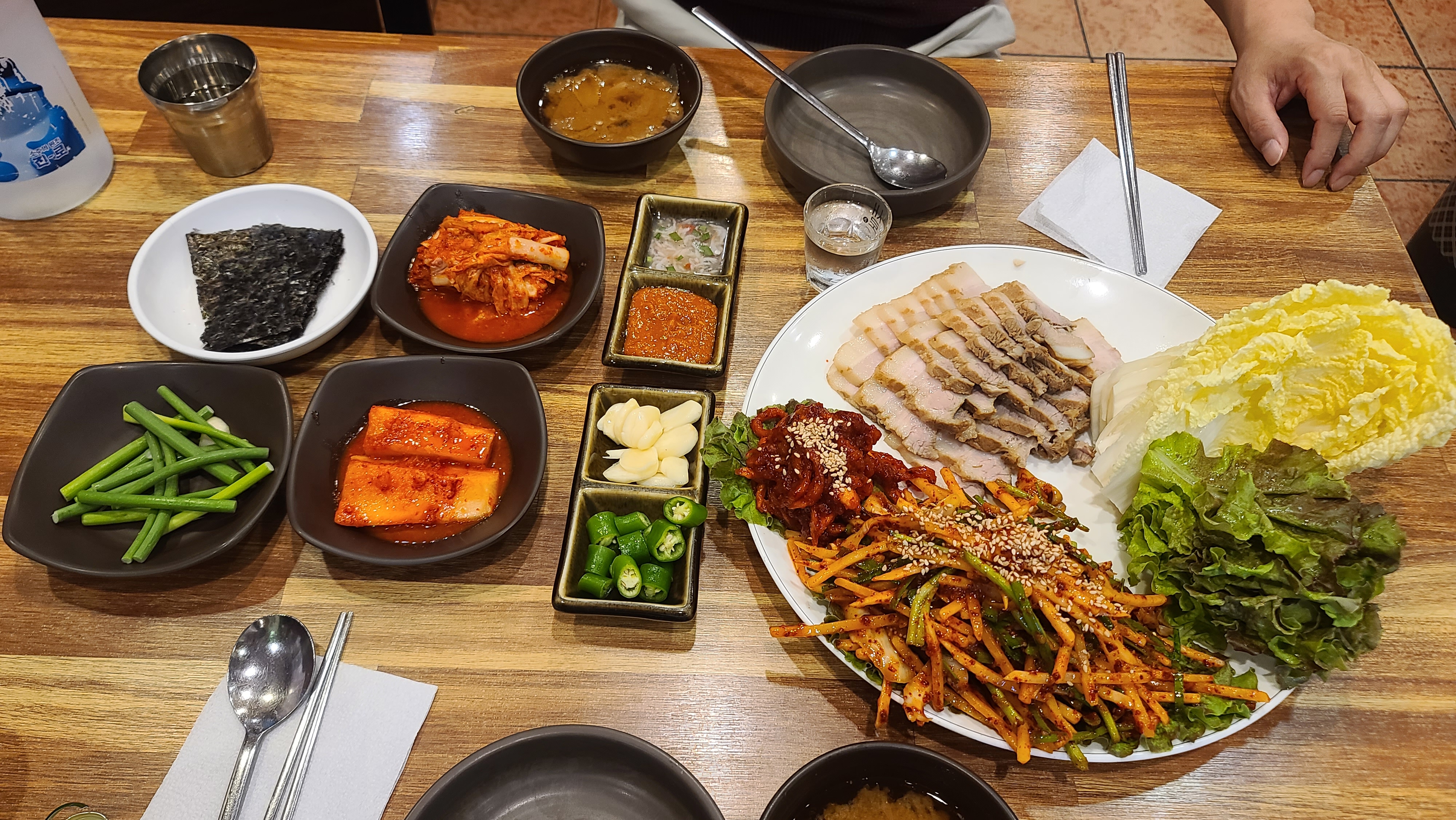 보쌈세트를 자세히 살펴보니 굴대신 오징어무침으로 보이는 재료가 아낌없이 올라와서 마음에 들지만 고기는 조금 퍽퍽한 상태로 보이고 있습니다. 아무튼 푸짐한 한상에 기뻐하며 먹을 준비를 해봅니다.