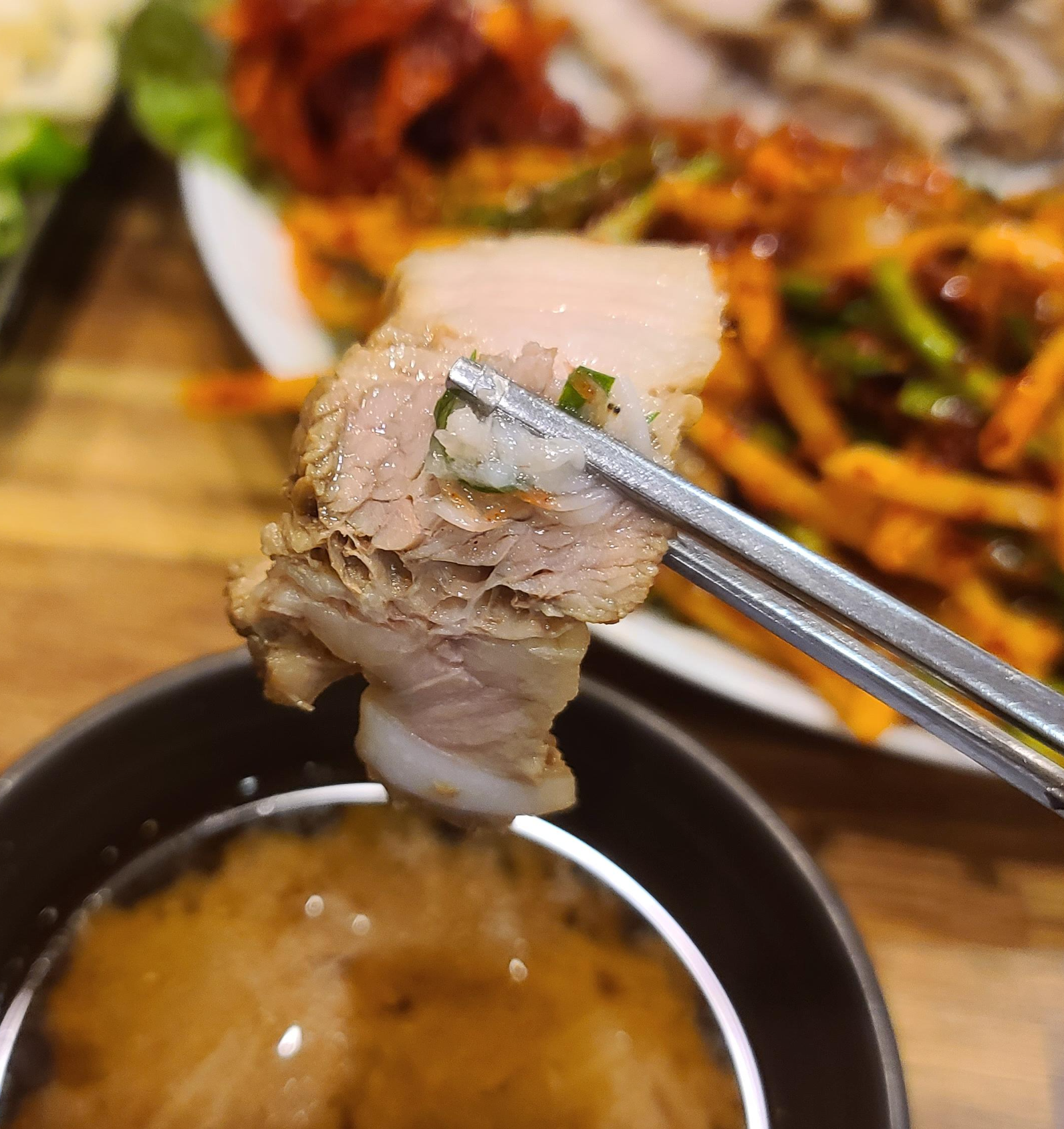 맛있어보이는 보쌈을 새우젓에 찍어 그냥도 먹어보고, 보쌈김치와 상추에 싸서 마늘도 곁들여서 먹어보고 배추잎에 올려서 오징어무침과도 조합해서 다양한 맛의 조합으로 먹어보니 제법 괜찮은 맛을 보여주고 있습니다. 여름이라 굴보쌈대신 오징어 무침을 내어주셨는데 양념의 달콤하면서도 새콤한 맛이 악간은 퍽퍽한 고기의 식감과 매우 잘 어울리는 모습을 보여주고 있습니다. 굴보쌈대신 먹는 오징어무침 보쌈도 꽤나 맛있다는 것을 깨달으며 쉴새없이 보쌈을 여러가지 조합으로 흡입하게 됩니다.