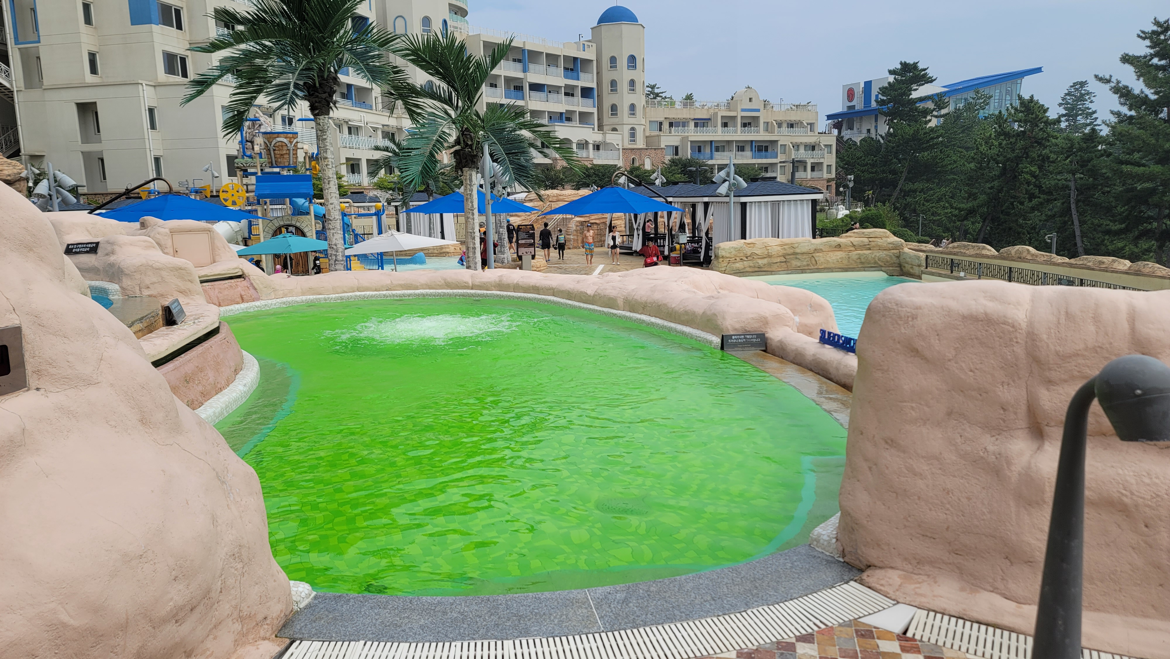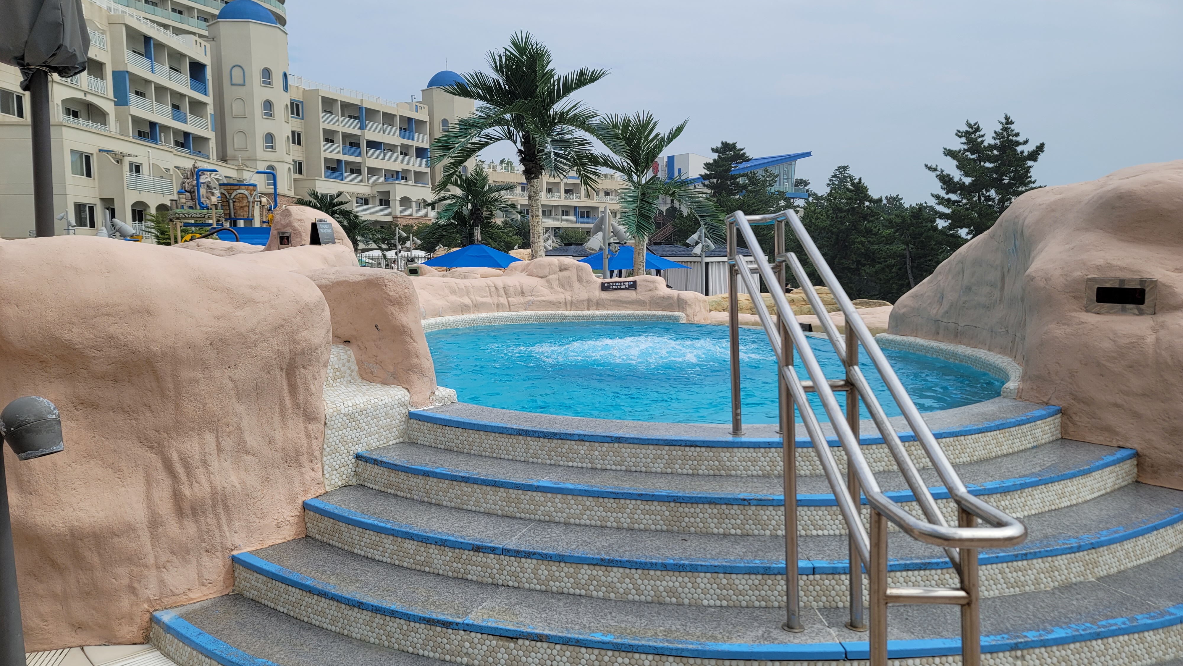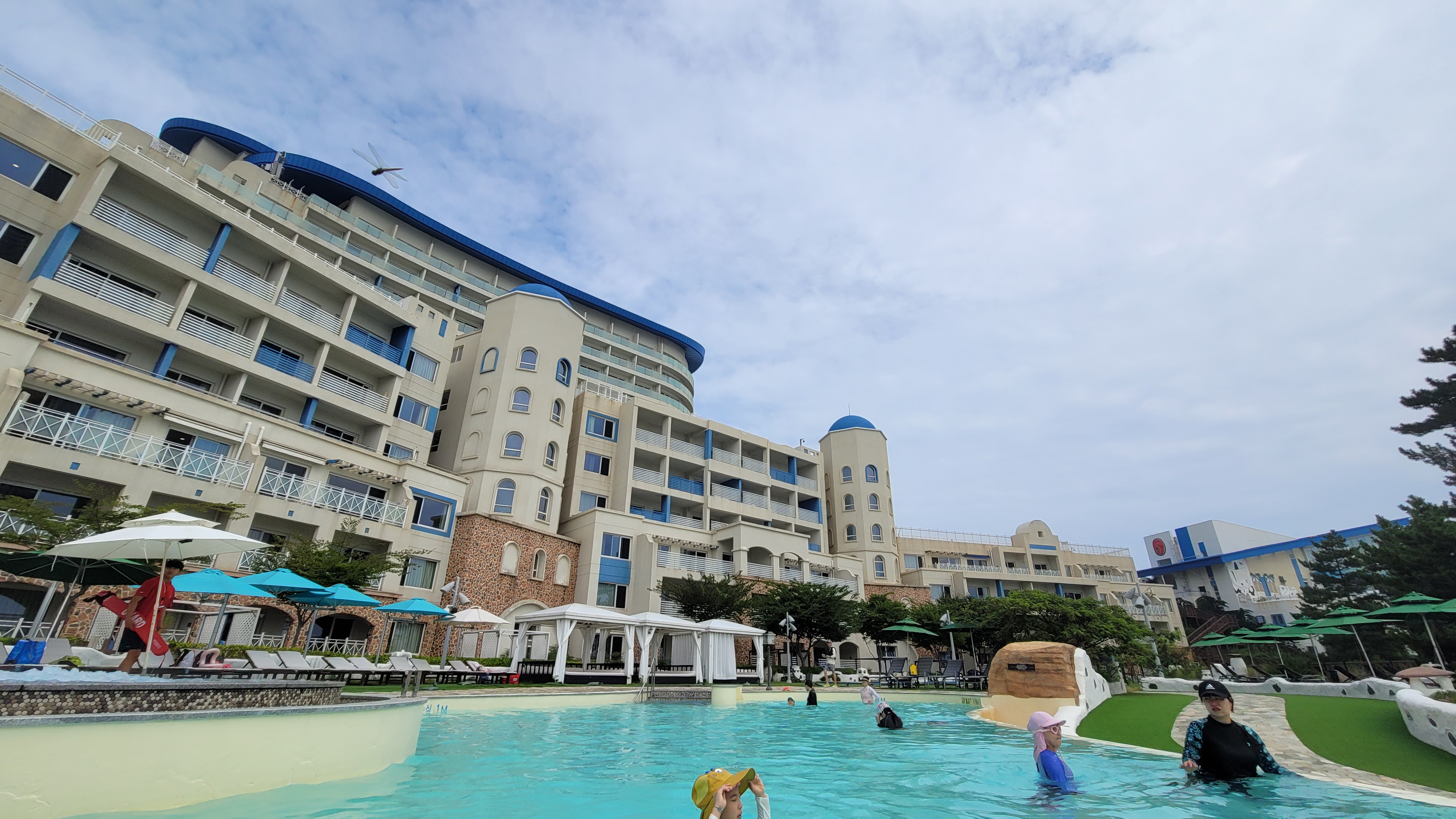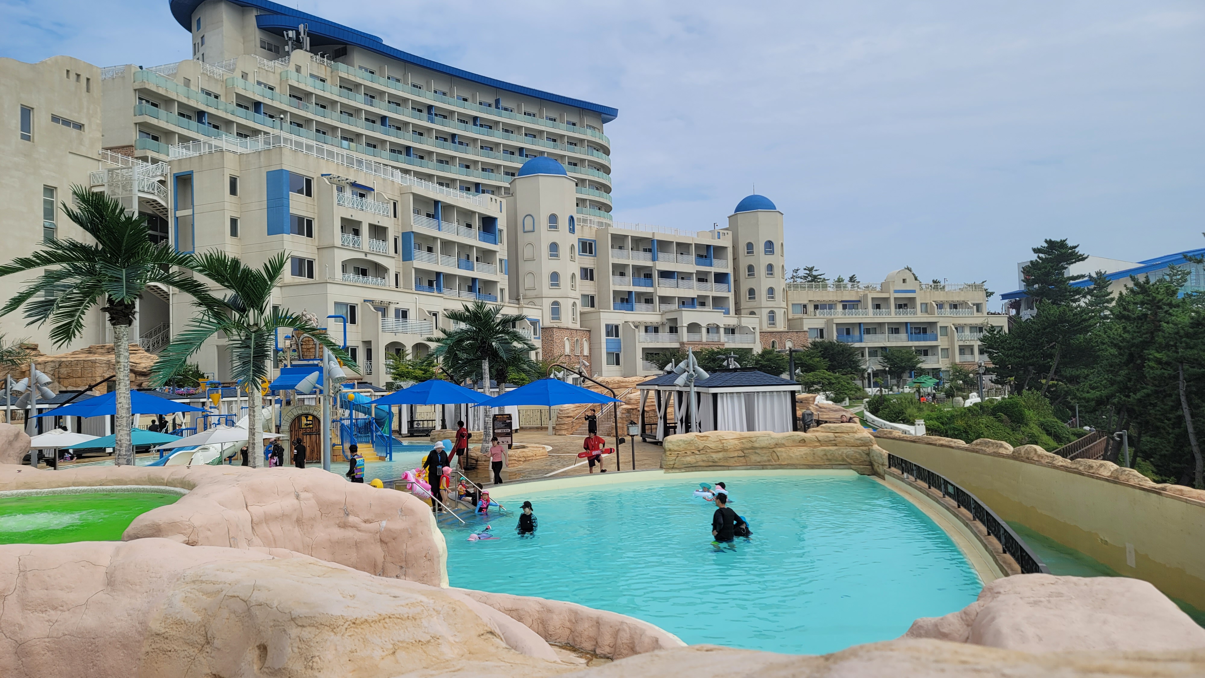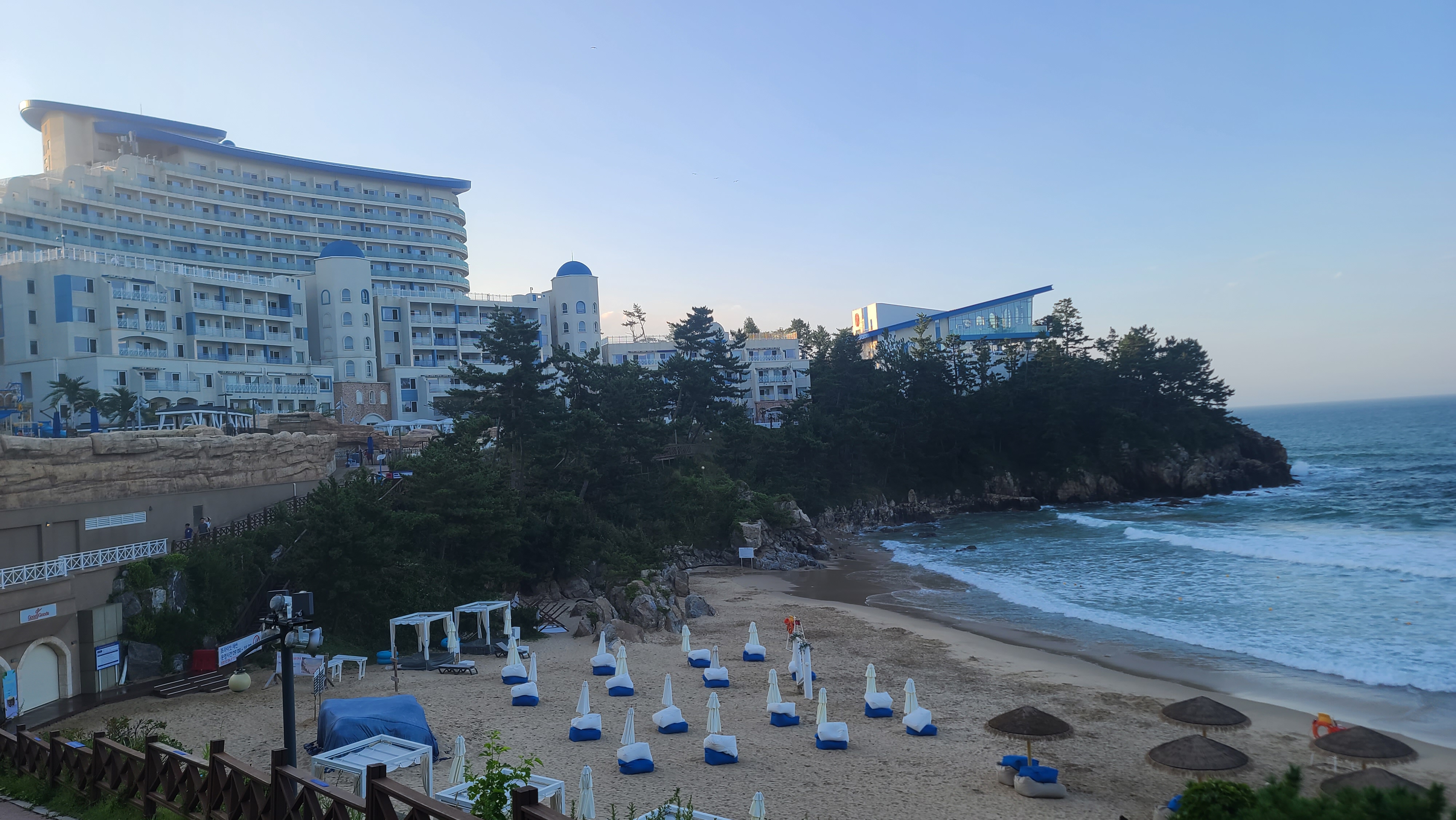 노천탕 구역에서 숙소를 바라보니 파란색과 흰색이 그리스 산토리니를 연상시키는 분위기를 자아내고 있습니다. 삼척쏠비치 자체가 원래 지중해의 분위기를 내도록 설계를 한 리조트이기 때문에 그렇지만 여름이 되니 더욱 해변과 잘 어울리는 모습을 보여주고 있습니다.