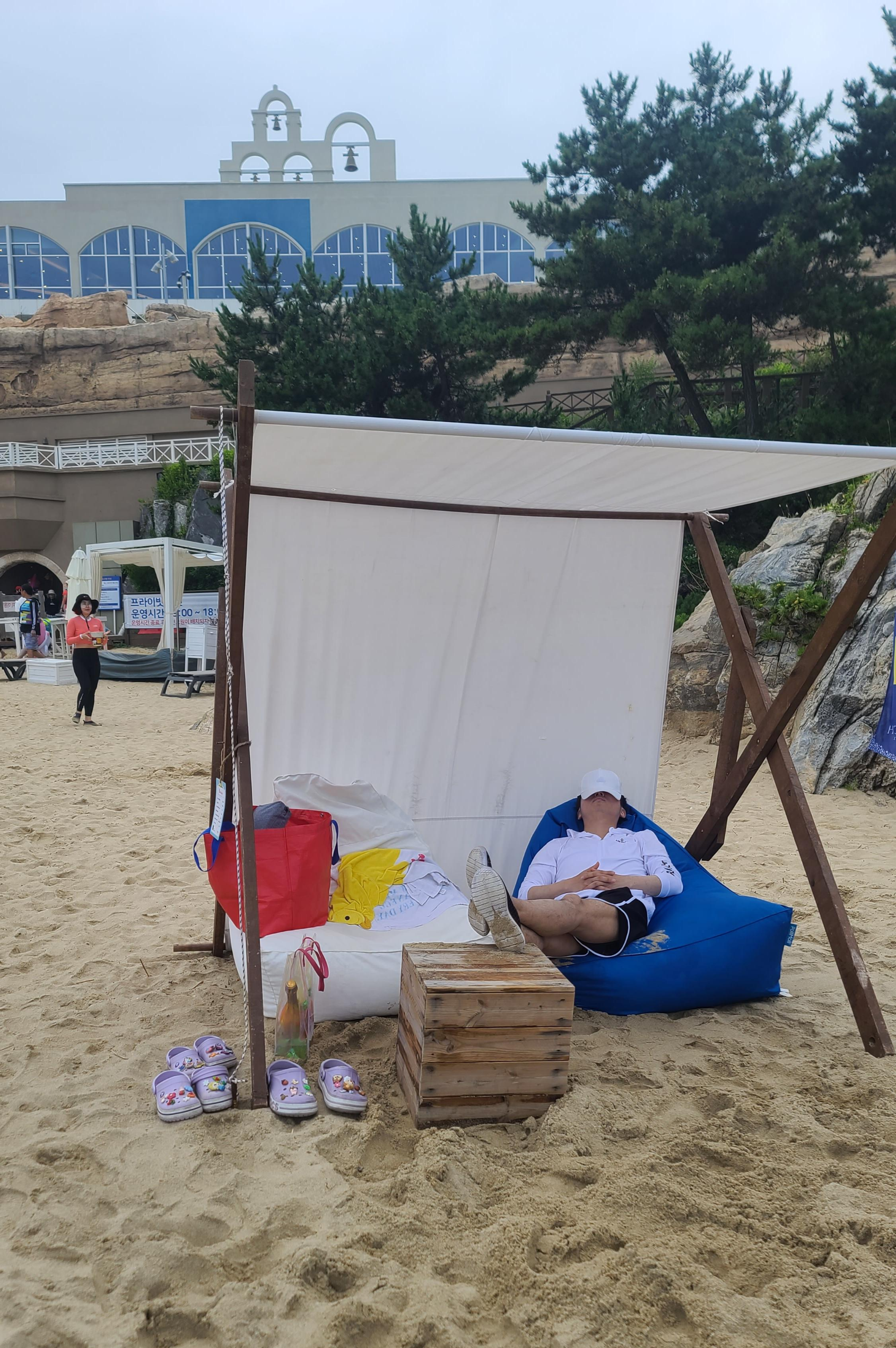 그늘막의 경우 천과 쿠션으로 이루어져 있으며 2인이서 사용할 수가 있는 구조입니다. 가장 싼 그늘막의 대여료도 오후 2시 이후에나 5만원 정도 이기 때문에 일반적인 해변 파라솔 대여값보다 2배나 높은 금액을 유지하고 있습니다. 돈이 많다면 상관없지만 매우 불합리한 가격이라고 생각되는 곳입니다.
