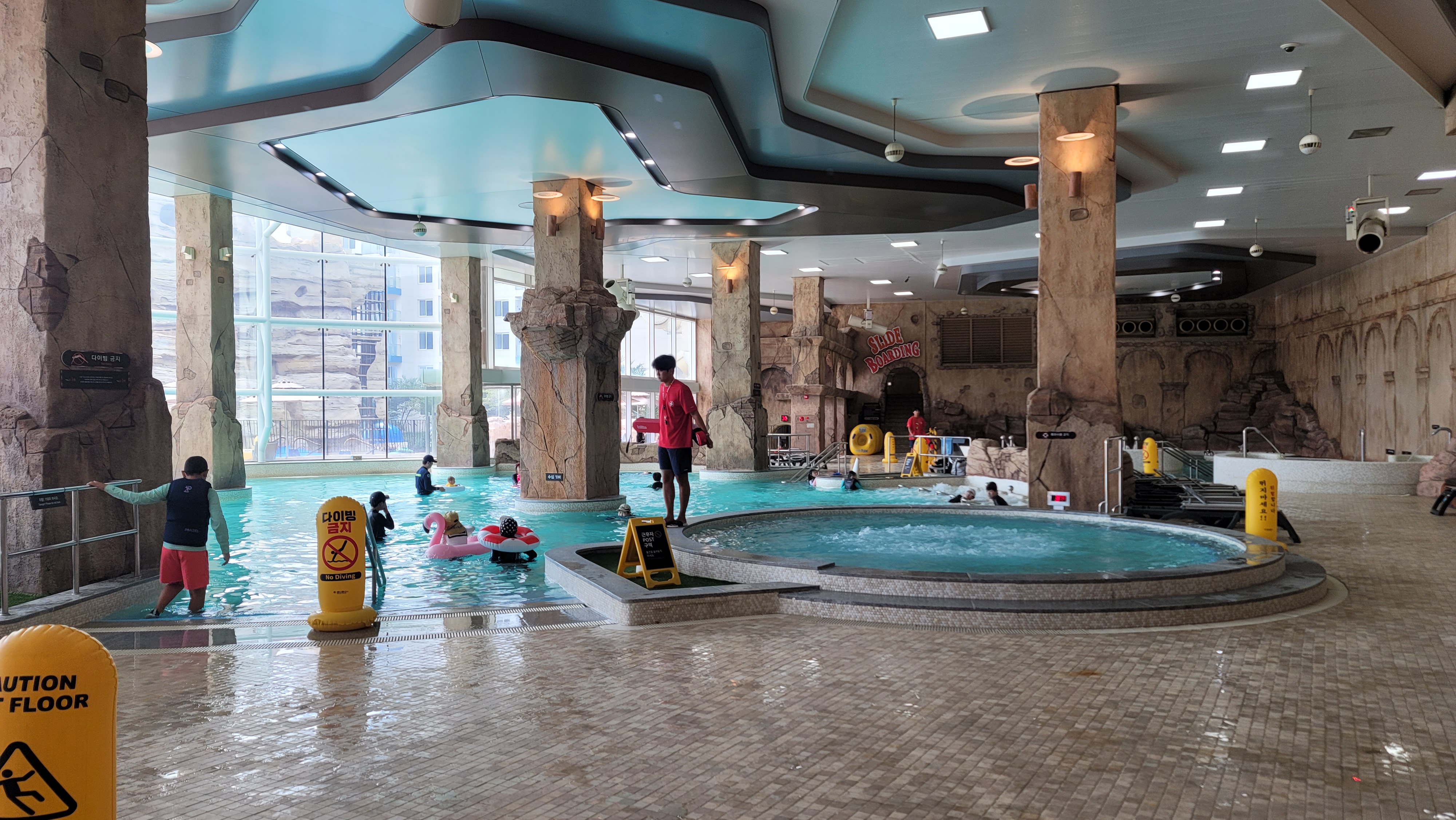 락커룸에서 옷을 갈아입고 오션플레이 입구로 나오면 실내 풀이 가장 먼저 눈에 들어옵니다. 수심이 낮고 수온이 따뜻한 구역으로 미취학아동과 같이 매우 어린 친구들을 위해 좋은 시설이며 안전하게 물놀이를 즐길수가 있는 구조입니다.