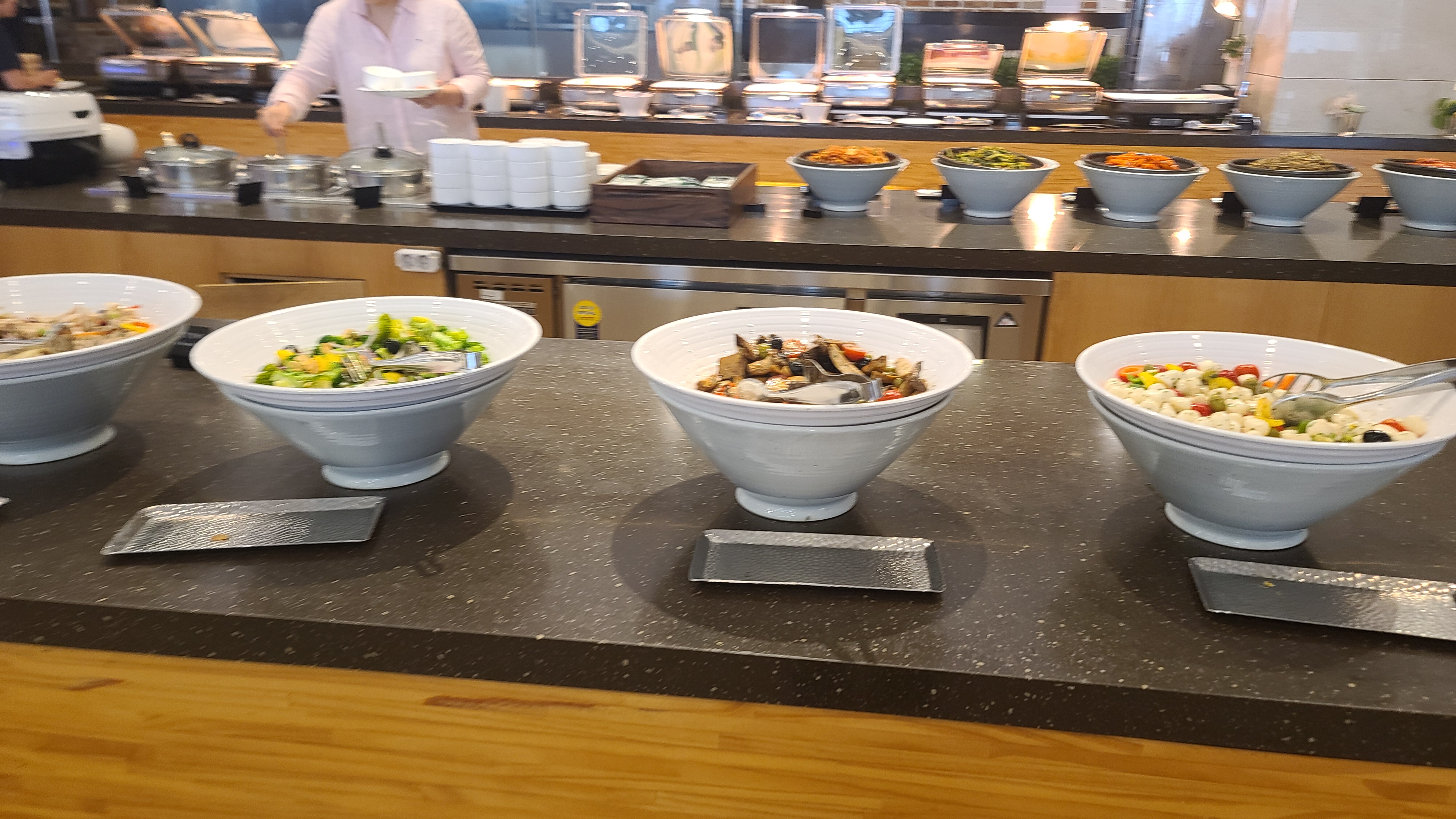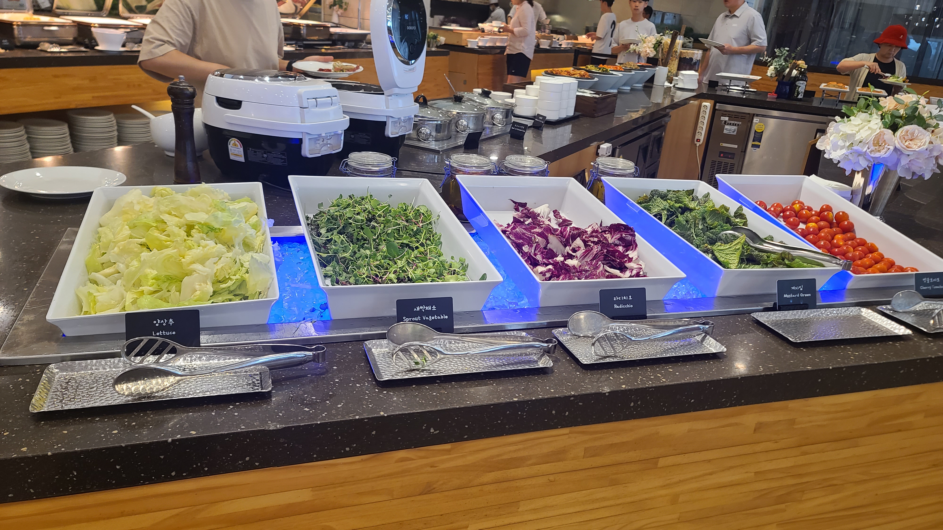 다른쪽 방향으로 살펴보니 다양한 야채와 샐러드 그리고 버섯등 몸에좋은 채소류가 보이고 있습니다. 한가득 덜어서 맛을 보니 신선함이 좋고 드레싱 3가지도 잘 어우러지기 때문에 야채를 가득 담아 건강식으로 맛을 봅니다. 야채는 어딜가나 뷔페에서 좋은 메뉴이지만 드레싱이 약간 부족한건 단점인것 같습니다.