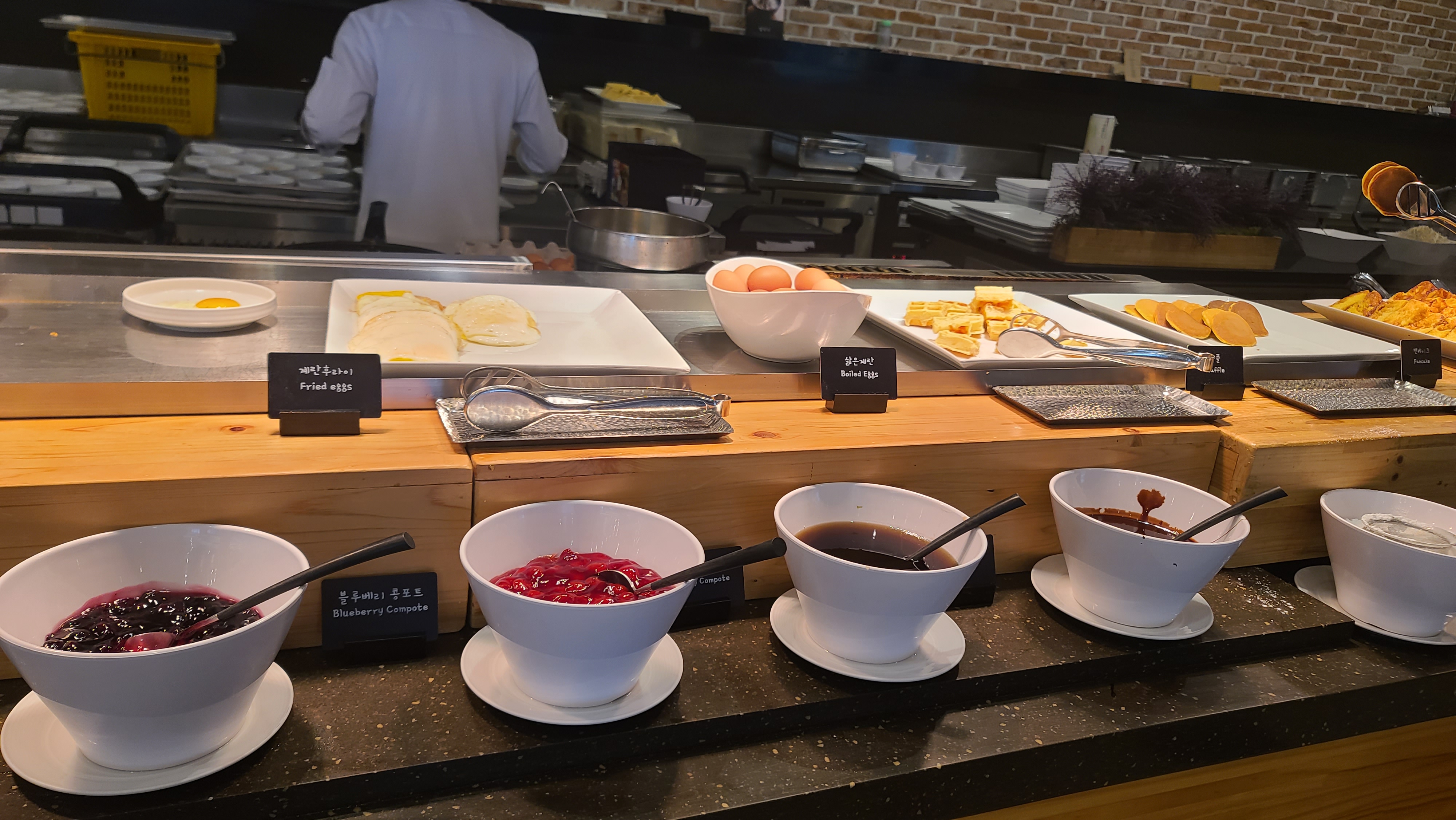 뷔페자리 끝쪽으로는 여러가지 즉석 요리 메뉴가 보입니다. 베트남 쌀국수와 같은 국물요리부터 계란, 팬케익, 고기류 등 주방이 뒤에있고 다양한 즉석요리를 쉴새없이 만들어주는 모습이 매우 정성스러워 보여 보기 좋았습니다. 여러가지 즉석요리를 맛보자 슬슬 배가 불러오기 시작합니다.