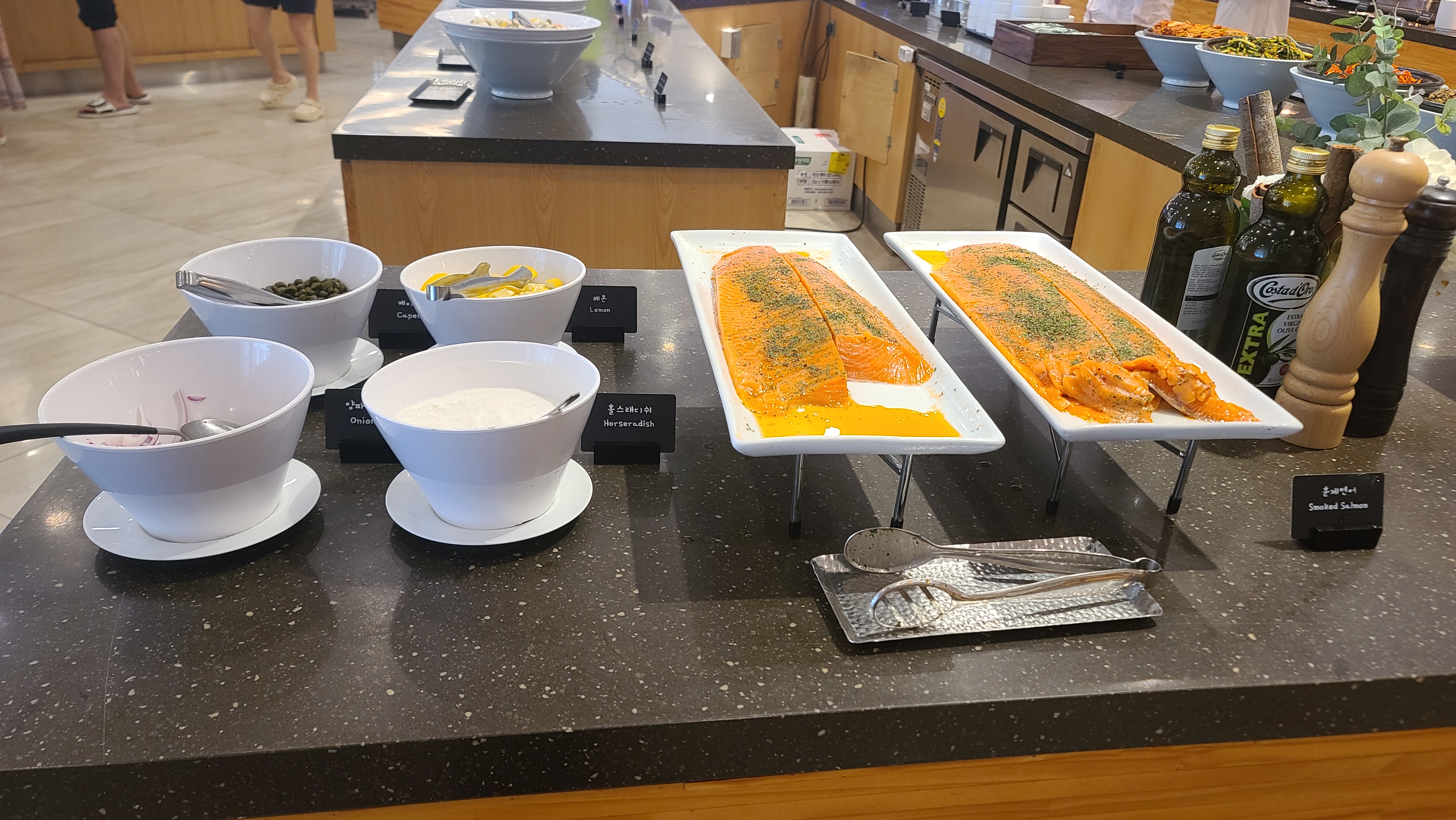 가장 먼저 눈에 들어오는건 아메리칸 조식 스타일의 시리얼과 여러가지 빵이 보입니다. 빵이 매우 먹음직스러워보이고 몇가지 덜어서 맛을보니 크로와상이 가장 먹을만하고 나머지는 그냥 그럭저럭한 기성품의 맛을 보여주고 있습니다. 빵으로 아침을 하기에는 약간 부족해보이는 그런 메뉴입니다.