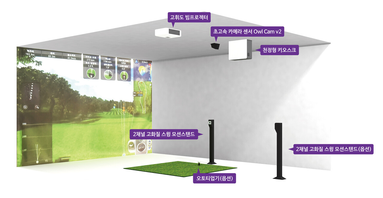 검색을 해보니 마이골프에서 만든 골프연습 시스템으로 옆과 뒤쪽으로 모션스탠드가 있고 정면과 상단 센서에서 공을 측정해서 여러가지 데이터를 조합하여 공의 구질과 거리 궤도등을 표시해주는 시스템입니다. 골프존이나 프렌즈스크린과는 어떠한 점이 다를까 무척 궁금해하며 테스트를 해보기로 합니다.