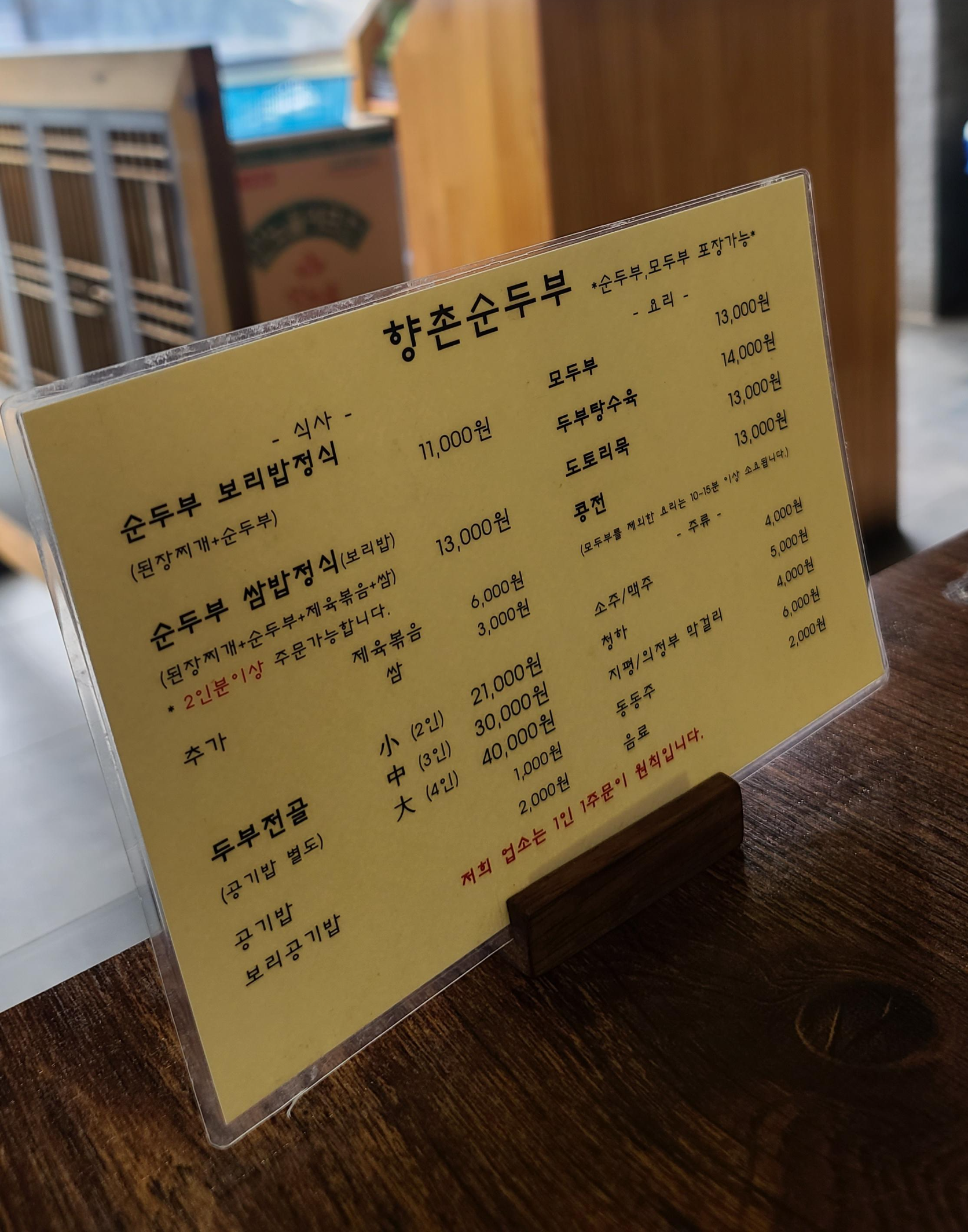 드디어 향촌순두부에 입장 자리를 잡고 메뉴판을 살펴보다 가장 무난해보이는 순두부 쌈밥정식을 주문하여 된장찌개, 순두부, 제육볶음 그리고 쌈밥까지 여러가지를 경험해보기로 합니다.