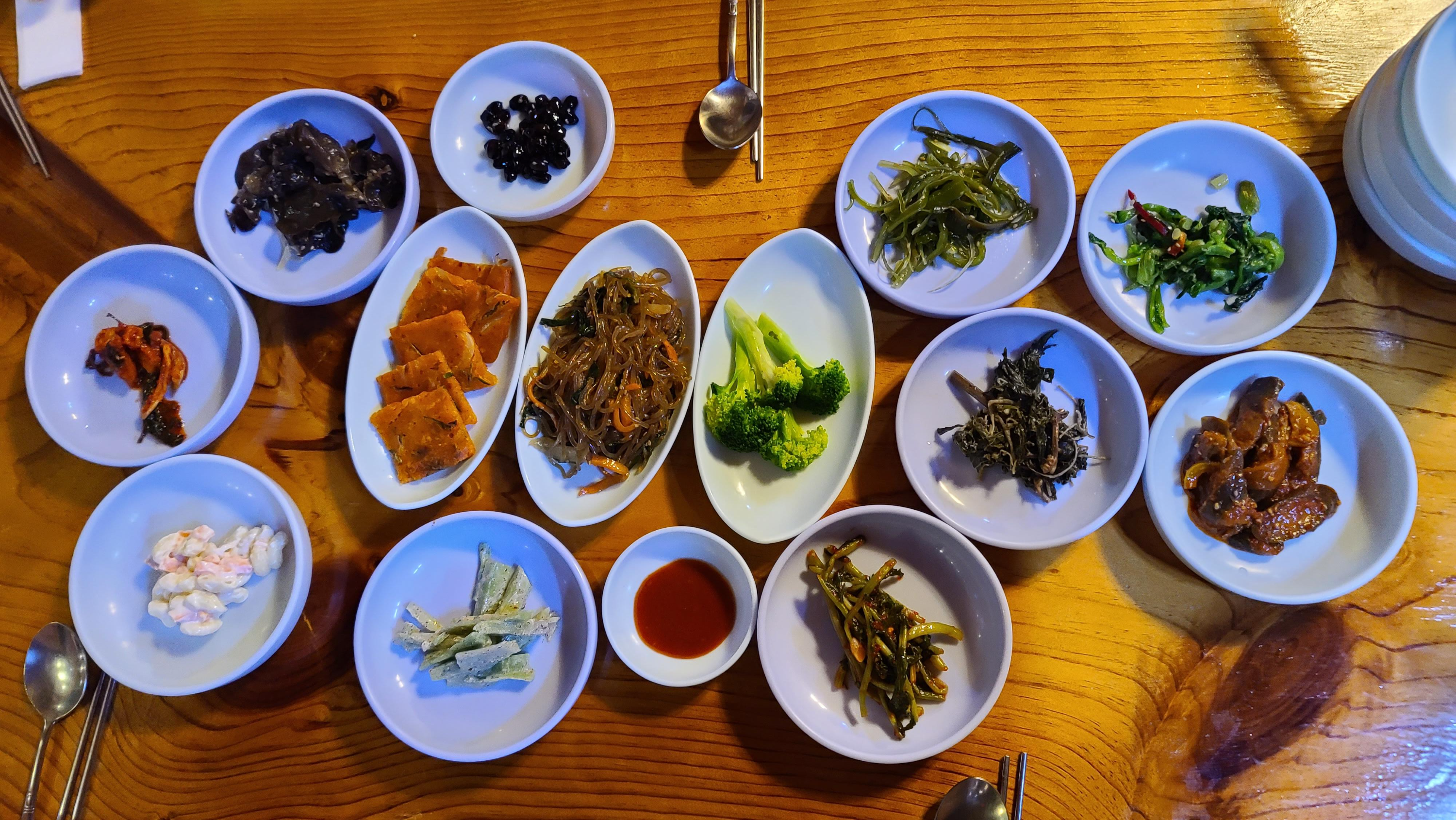 예약을 해놓았기 때문인지 테이블에는 부침개, 잡채, 각종나물, 가지, 김치, 브로콜리, 콩자반, 마카로니 등 10가지가 넘는 다양한 반찬들이 차려져 있어 무척 마음에 들고 건강해 보이는 비주얼을 뽑내고 있습니다.