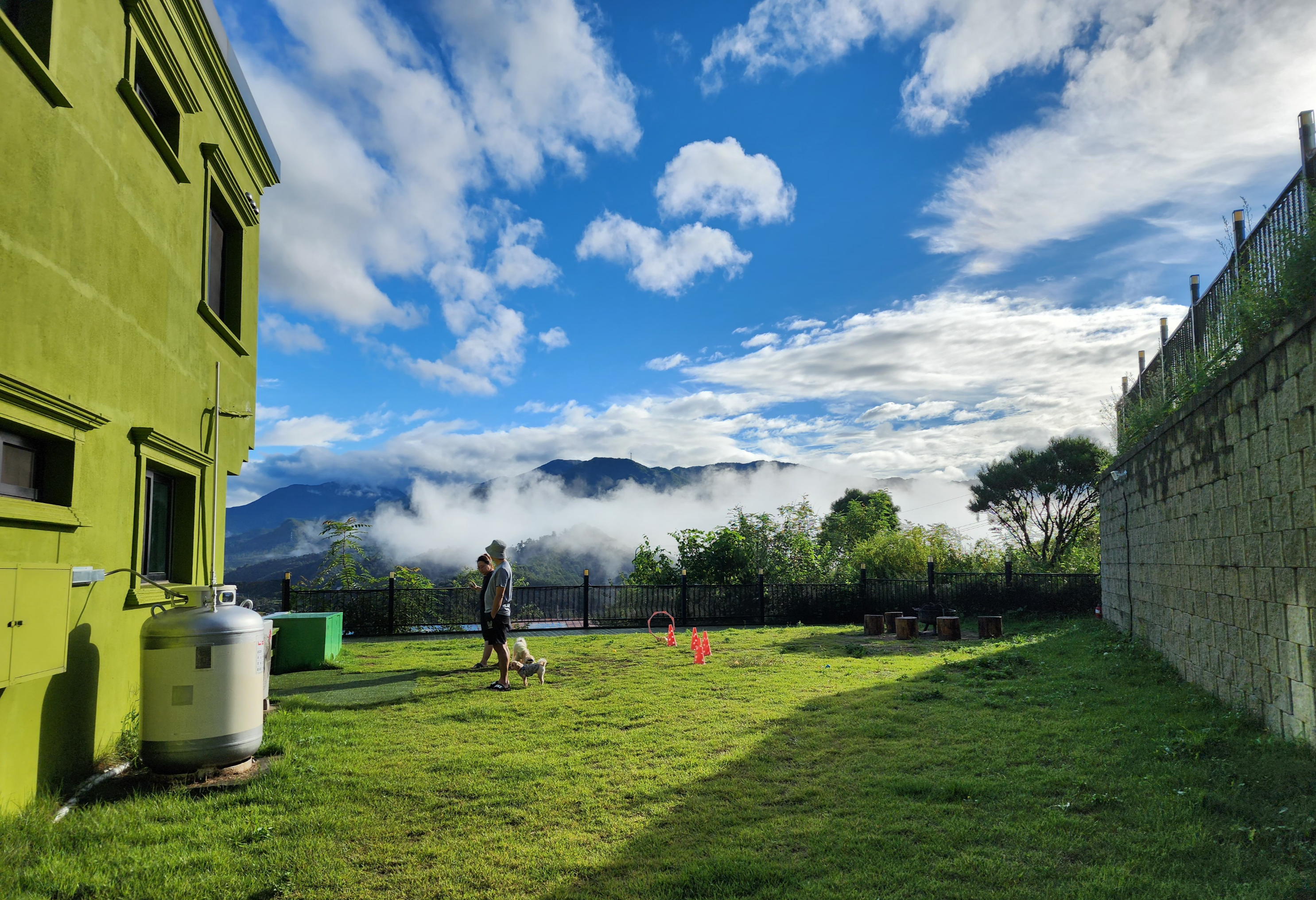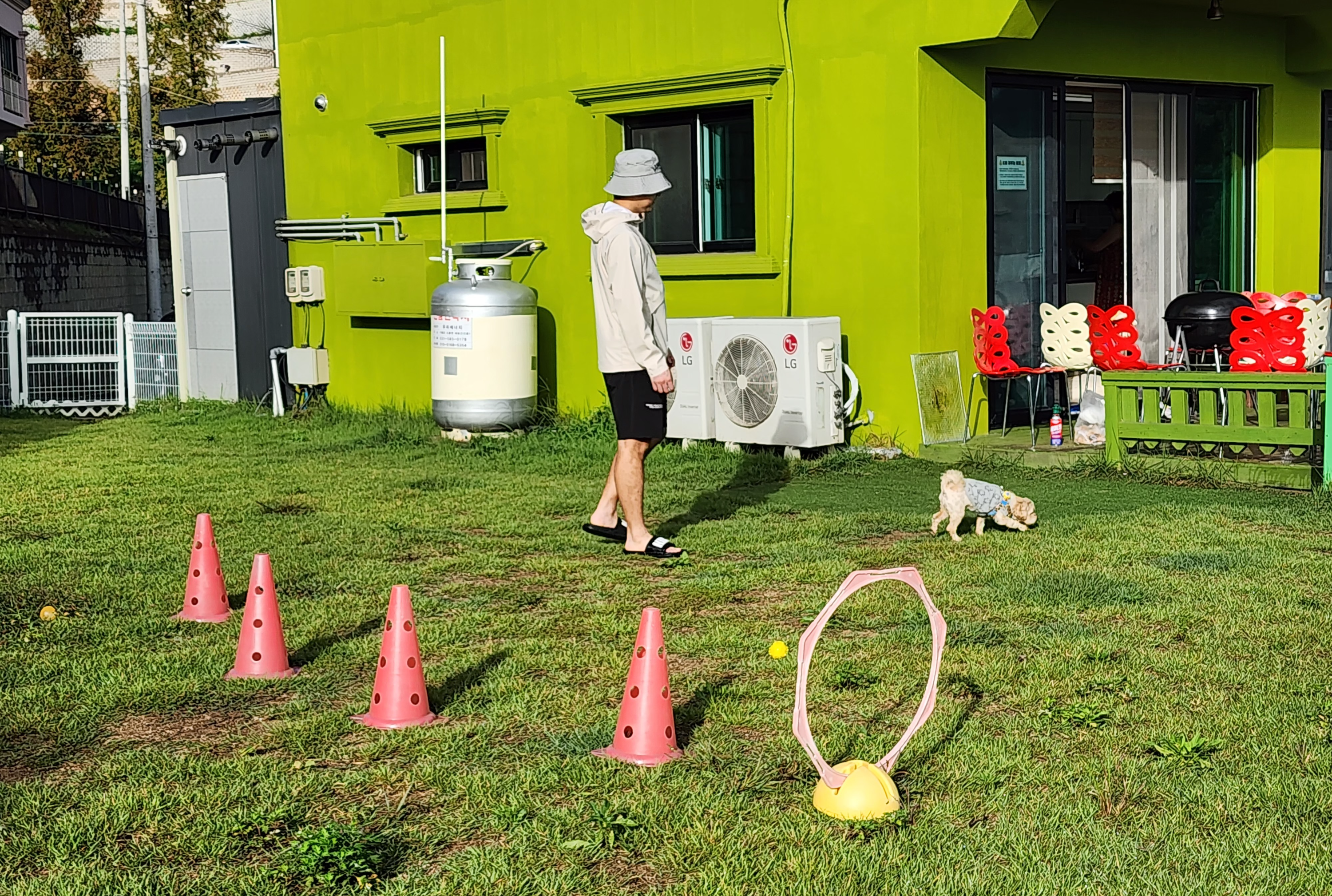 도착하여 체크인을 하고 애견펜션 주변을 강아지와 산책을 하면서 분위기를 살펴봅니다. 녹색으로 구성된 건물 및 주변시설이 잔디와 멀리보이는 푸른산과 일체감을 느끼도록 되어 있어 더욱 자연친화적으로 느껴지고 마음에 안정감을 가져다주고 있습니다. 푸른하늘과 푸른잔디 그리고 녹색의 주변시설 벌써부터 도심에서 떨어져 힐링이 되는 기분을 느낄 수가 있습니다.