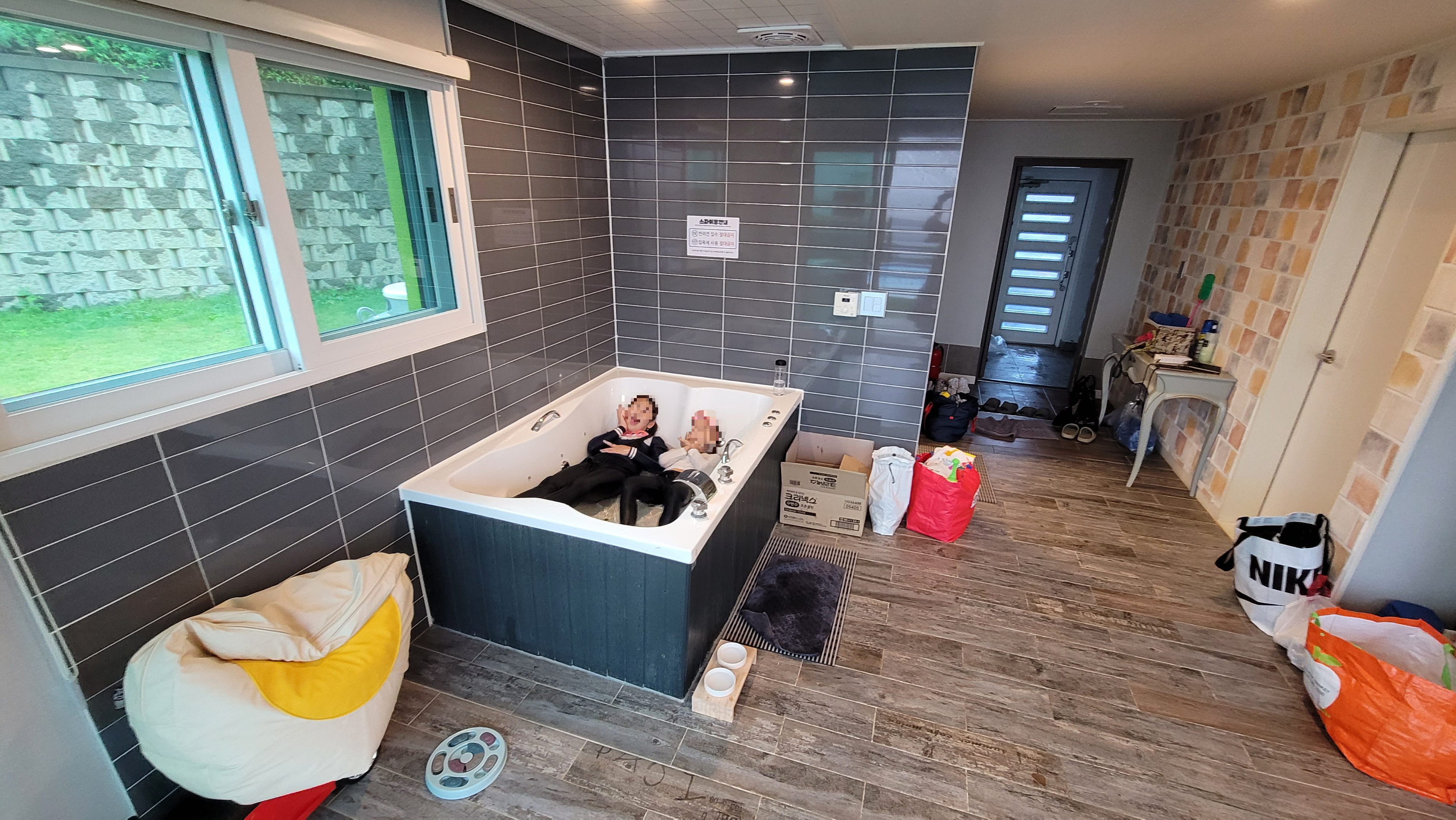 짐을 풀르면서 애견펜션 내부 구조는 어떠한지 꼼꼼하게 살펴봅니다. 넒은 거실에 욕조가 위치하고 있어 바깥을 보면서 반인욕을 즐길 수 있는 독특한 구조이며 바깥으로는 전용풀이 보여서 일광욕을 하거나 바베큐파티를 하면서 아이들이나 애견들이 수영을 즐기는 것도 볼 수 있는 매우 가족들이 놀기 좋은 구성을 보여주고 있는 것이 보입니다.